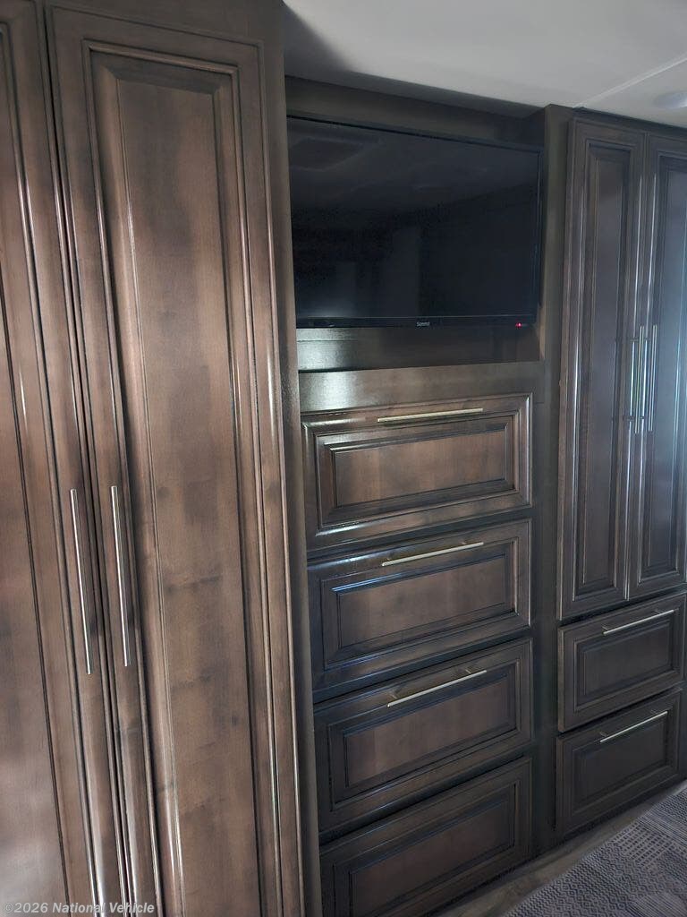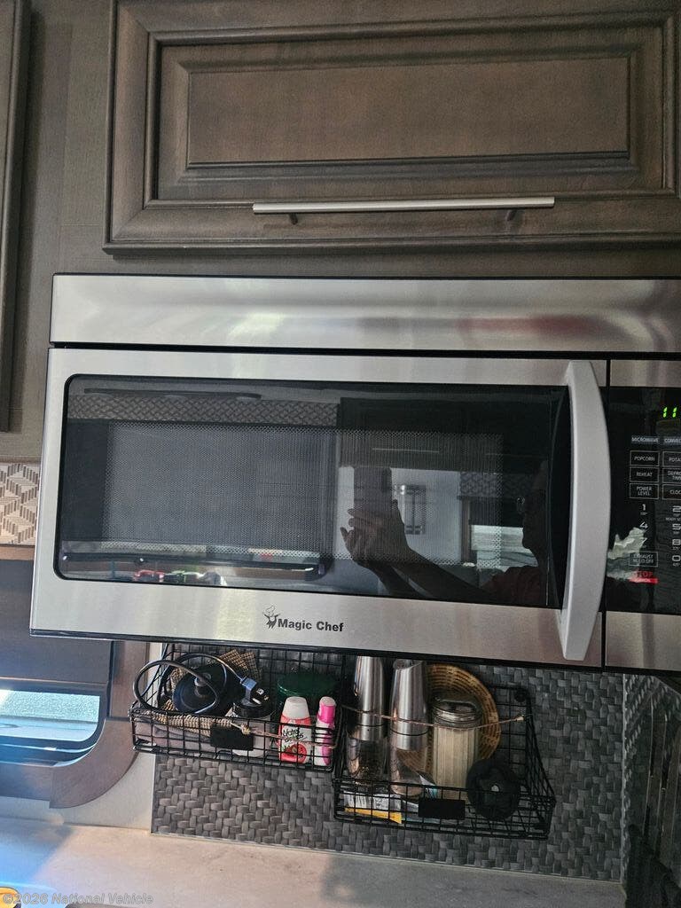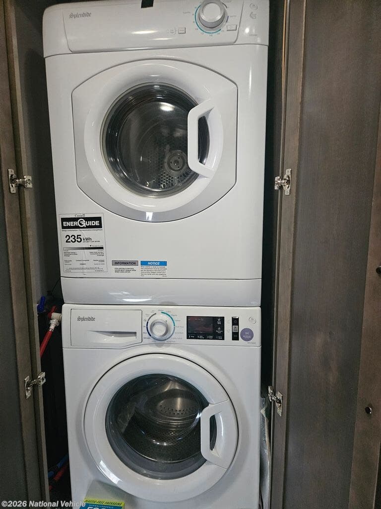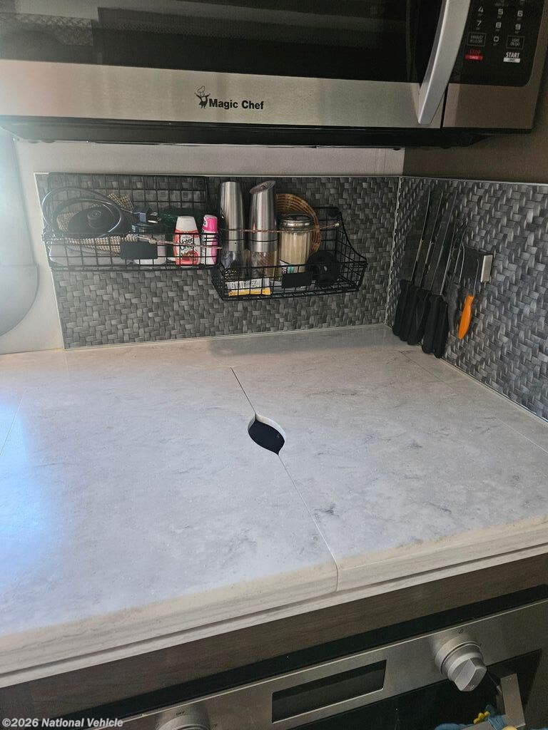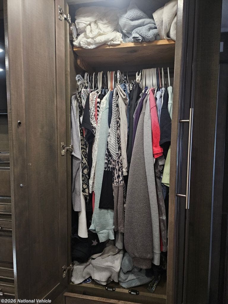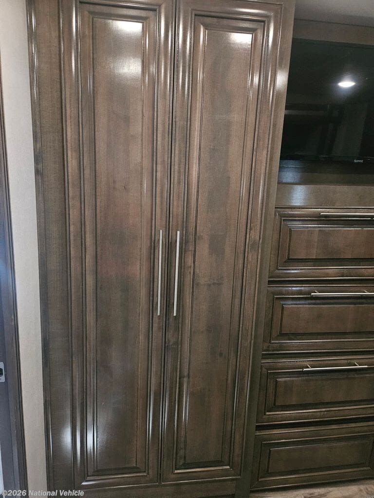 Comfort and convenience is found all throughout this motorhome! Starting with the full rear master bath that has a 42" x 30" shower with a seat and a dual sink vanity, plus it leads into the private bedroom. Inside the bedroom is a 72" x 80" tilt a bed king bed slide with overhead cabinets across from a dresser with overhead cabinets and a 32" LED TV, a wardrobe, and another wardrobe that is prepped to add an optional stackable washer and dryer. The half bathroom is conveniently near the fully equipped kitchen so you can get back to creating your best home cooked meals fast. Relax in true comfort each night by either playing games at the booth dinette or on the theater seating that comes with power recline, heat, and massage!