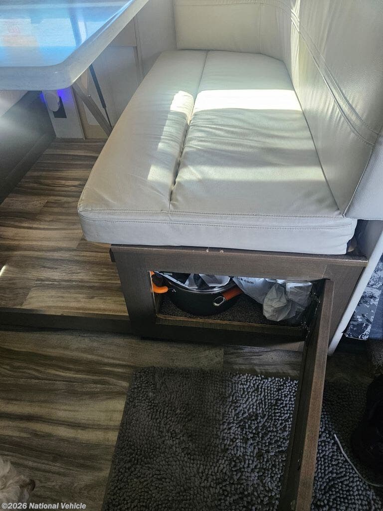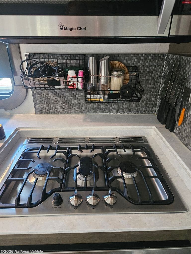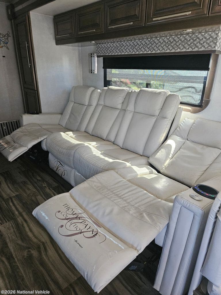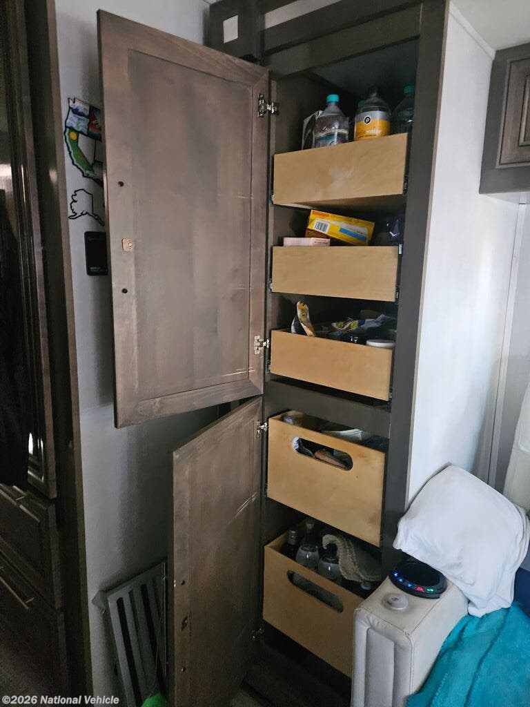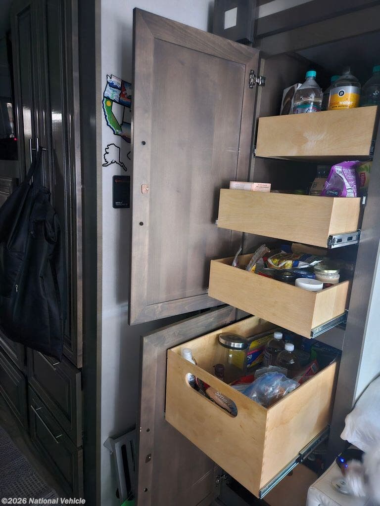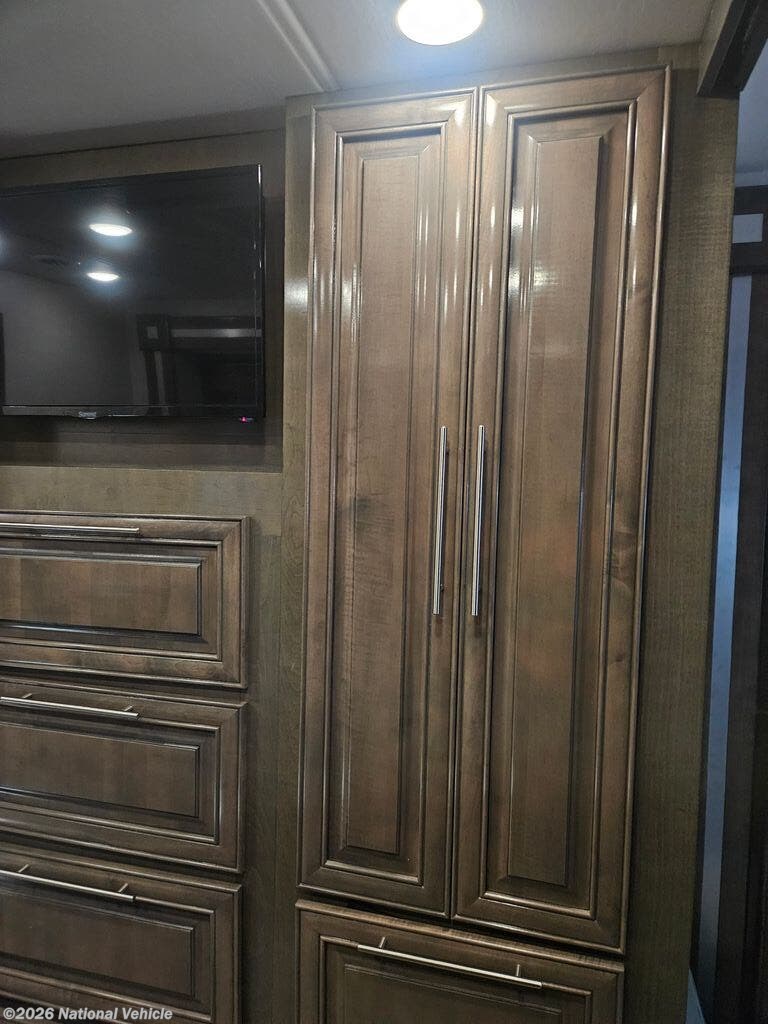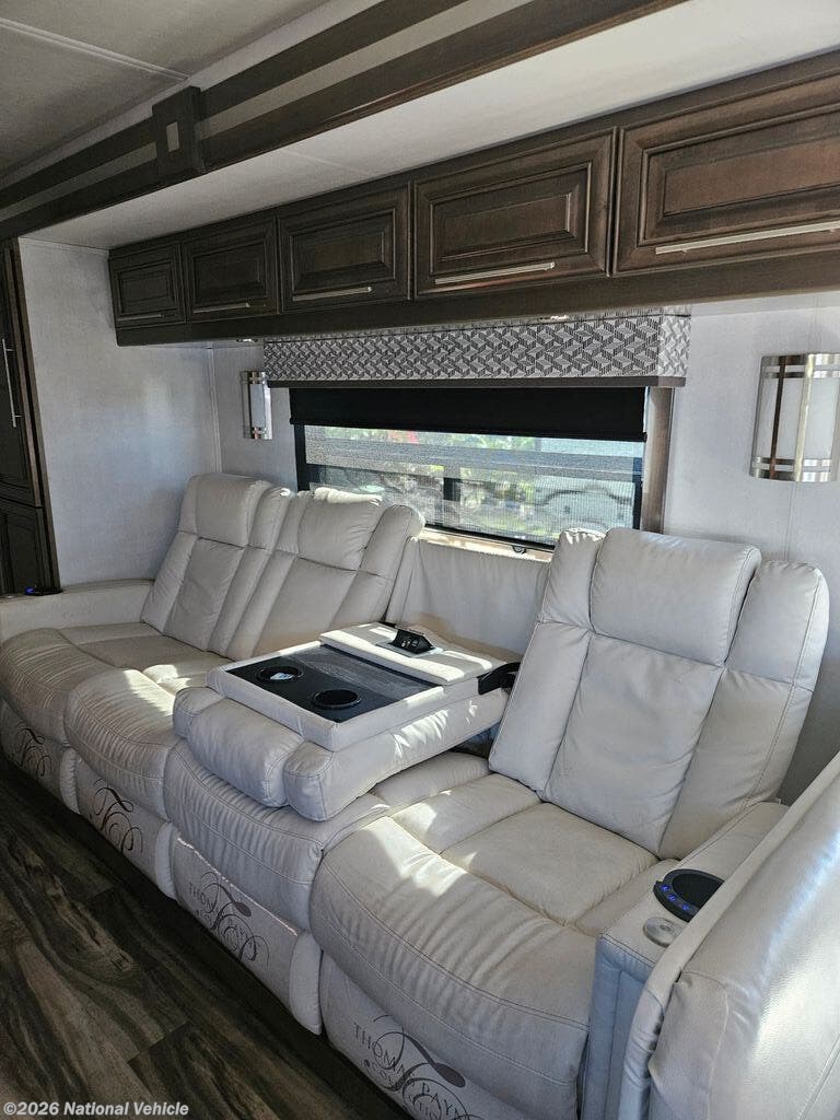Comfort and convenience is found all throughout this motorhome! Starting with the full rear master bath that has a 42" x 30" shower with a seat and a dual sink vanity, plus it leads into the private bedroom. Inside the bedroom is a 72" x 80" tilt a bed king bed slide with overhead cabinets across from a dresser with overhead cabinets and a 32" LED TV, a wardrobe, and another wardrobe that is prepped to add an optional stackable washer and dryer. The half bathroom is conveniently near the fully equipped kitchen so you can get back to creating your best home cooked meals fast. Relax in true comfort each night by either playing games at the booth dinette or on the theater seating that comes with power recline, heat, and massage!