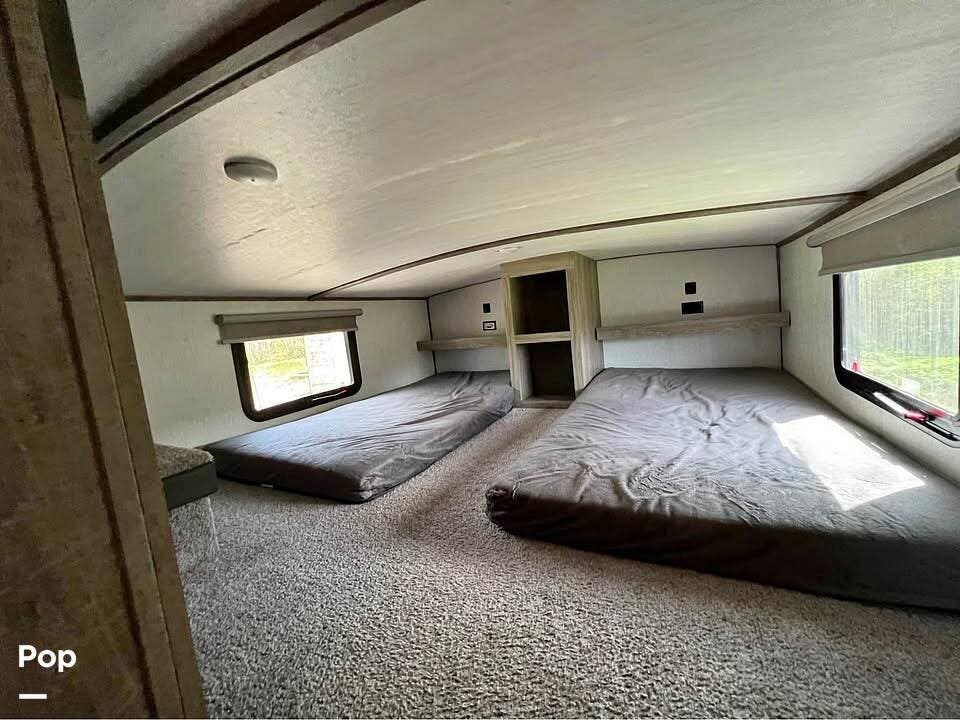 Toward the back, the bedroom provides a quiet place to rest. A king bed sits beneath the loft with two twin mattresses for the kids, and when morning comes, the large windows bring in the light for the new day.