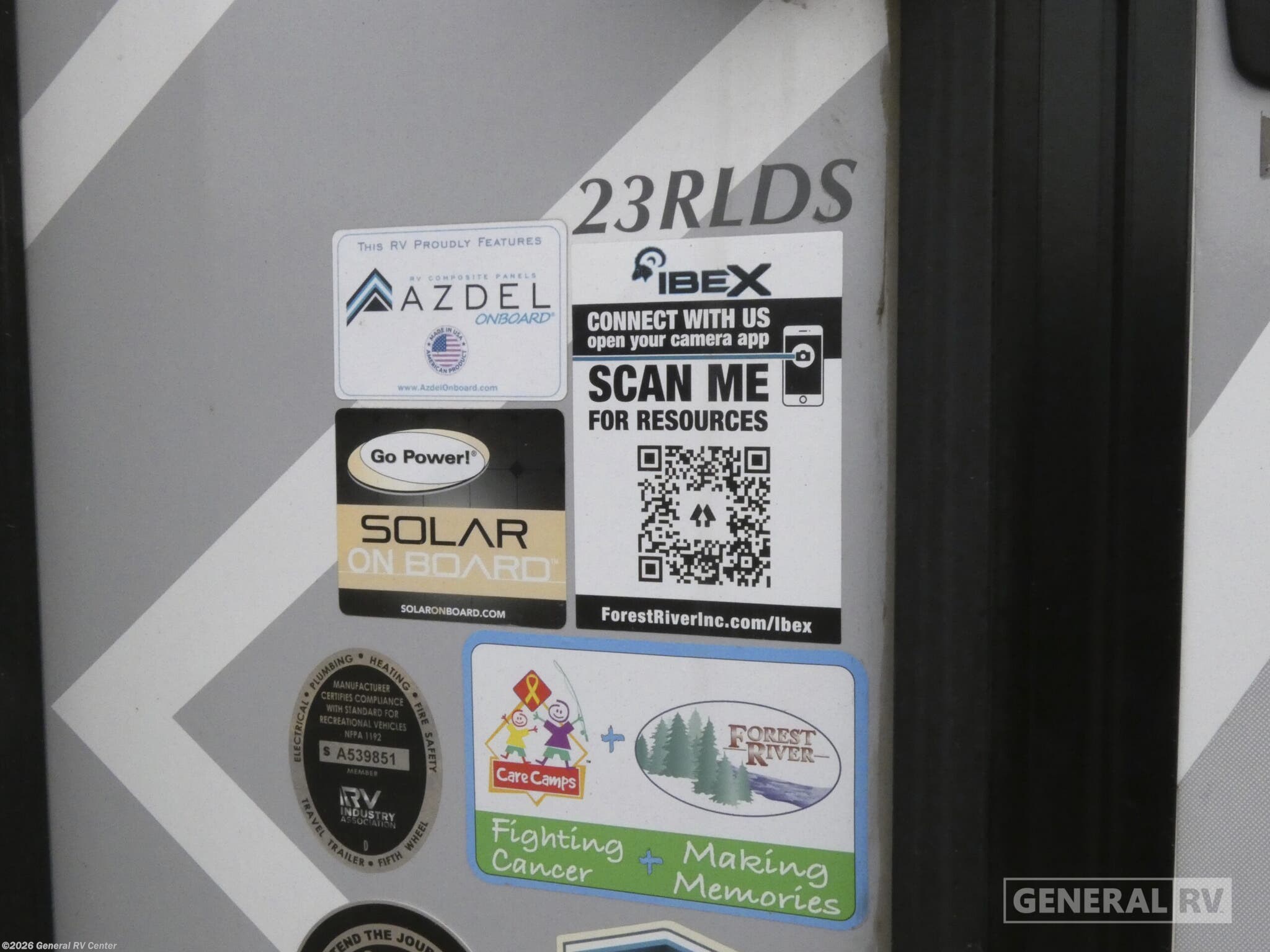 Forest River IBEX travel trailer 23RLDS highlights: Rear Living Booth Dinette Rear Sofa Under-Bed Storage Solar System Panoramic Front Window When you enjoy adventure and comforts when camping this trailer can provide both whether you are a couple or a family thanks to the furniture doubling as sleeping space. You can drink your morning coffee while sitting on the sofa along the rear wall or at the dinette slide as you gaze out the windows at your view. Easily whip up breakfast in the galley kitchen which offers full amenities plus a pantry. You can get cleaned up in the full bathroom with a shower before heading outside. The 16' awning gives you a place to relax and plan your activities with some protection from the elements, and the pass-through storage offers the larger camping gear a protected space to travel. And when you are ready for bed, the front bedroom offers a queen bed with lots of storage for your clothing. With any IBEX travel trailer or toy hauler by Forest River, the interior offers stainless steel appliances for style, seamless countertops for durability and easy care, a largest-in-class refrigerator for more cold storage, and a central vacuum system to easily clean up after a fun, messy day. The PVC roof, the Azdel construction, and the Cold Weather package with a heated and enclosed underbelly, tank pad heaters and an enclosed termination system provides solid construction plus allows you to travel during any season. And the all terrain tires and increased ground clearance allow you to find the perfect spot to setup camp!