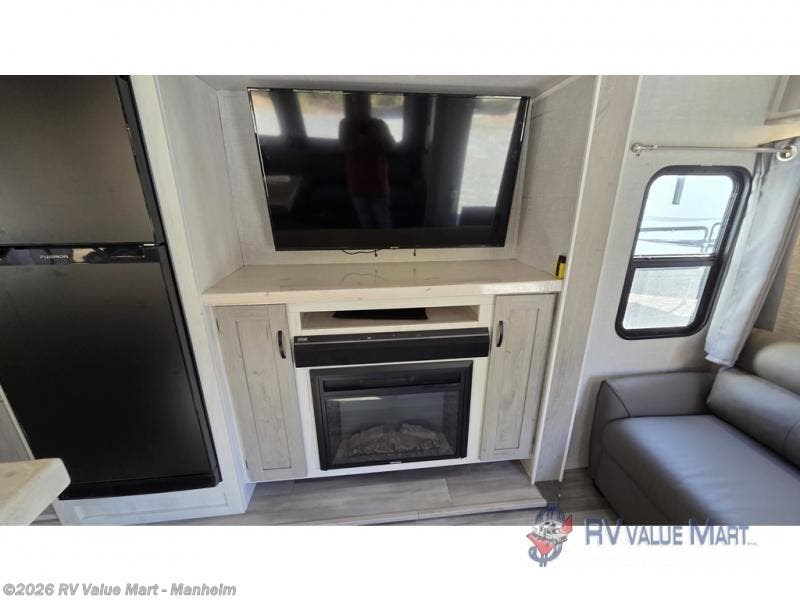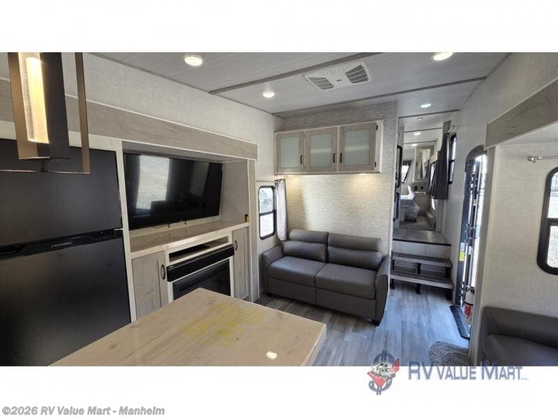 This fifth wheel is spacious, inviting and comfortable! Walk right inside to the combined kitchen and living area with two opposing slides, or walk around the kitchen island to access the floor-to-ceiling pantry. There is a large counter space plus lots of upper and lower cabinets for your dishes, games, and such. You can dine or even work at the free standing dinette with chairs, and relax on the theater seats with USB ports or the tri-fold hide-a-bed sofa while watching the 50" LED TV with soundbar and enjoying the fireplace below. Get cleaned up in the full bathroom and fall quickly to sleep on the walk-around queen bed in the front bedroom that includes three wardrobes, a space prepped for a washer/dryer option, plus nightstands.