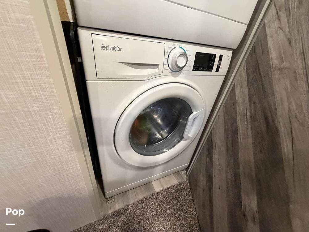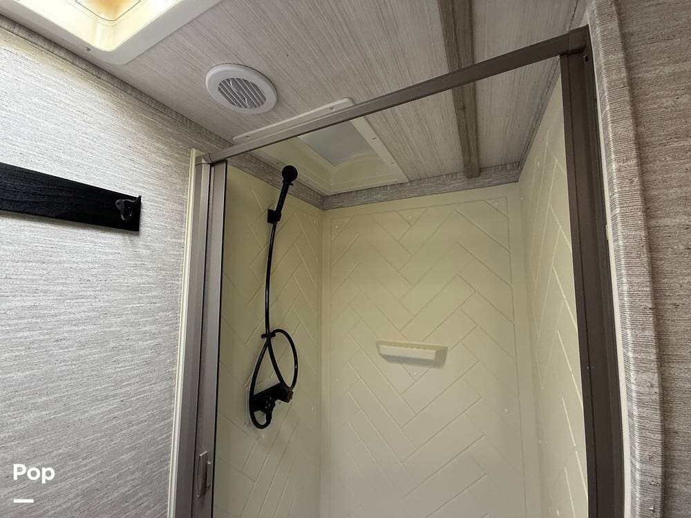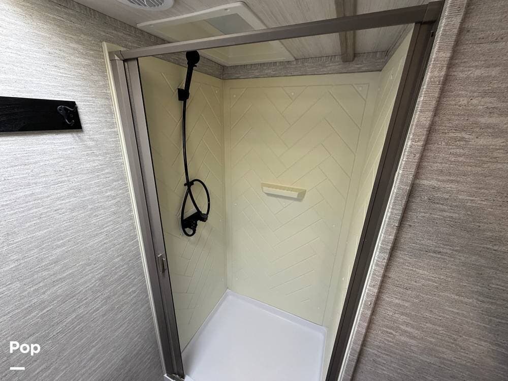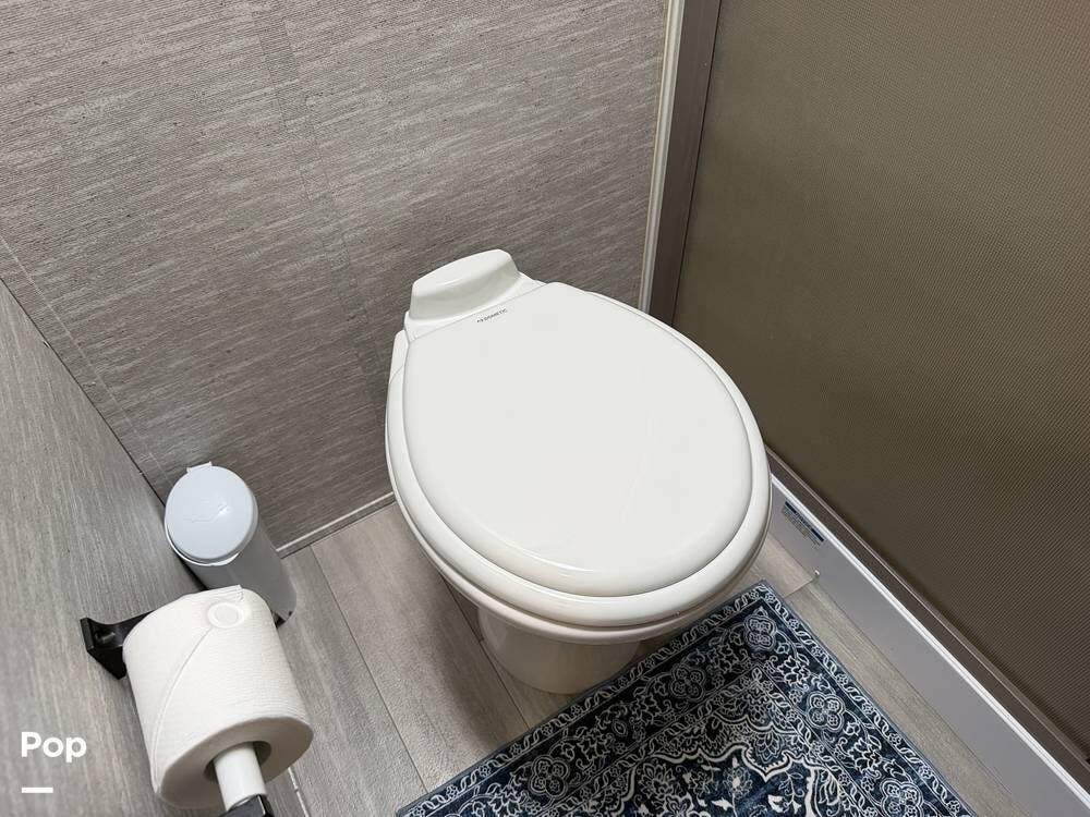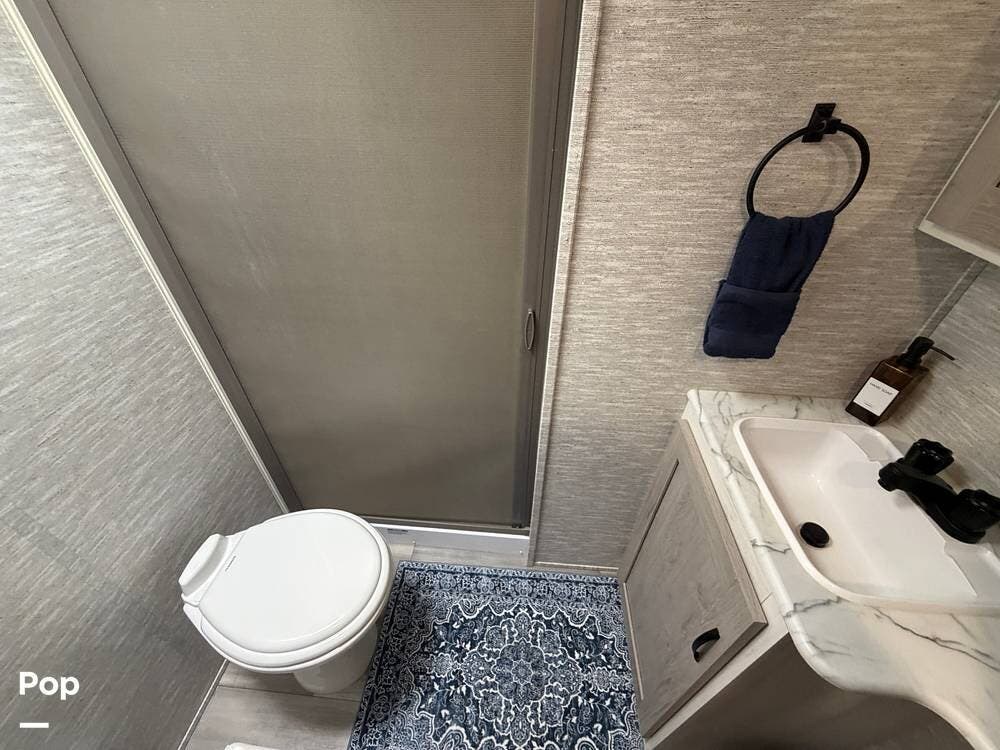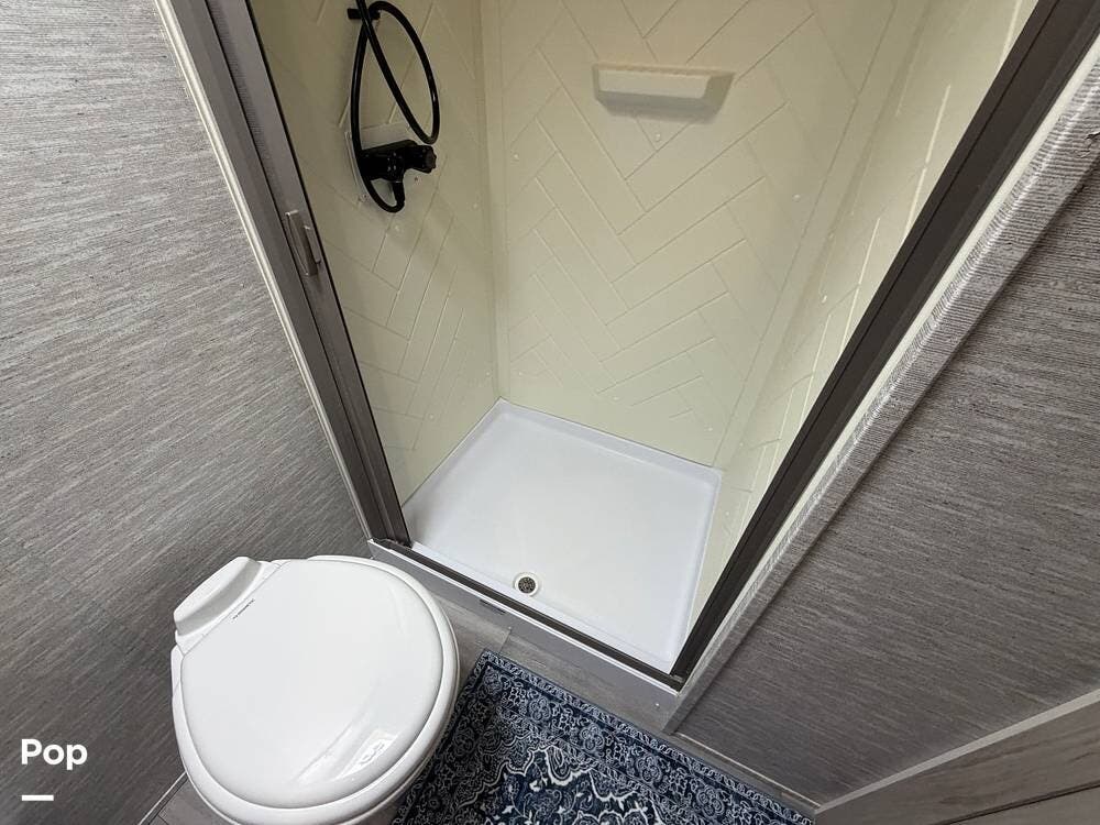 Upstairs, the private master suite offers a walk-around queen bed with under-bed storage, wardrobe closets, and washer/dryer prep for added convenience. The bathroom is spacious and well-appointed, with a large shower, glass doors, a skylight, a vanity, and additional linen storage, bringing a true residential feel on the road.