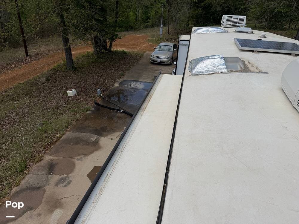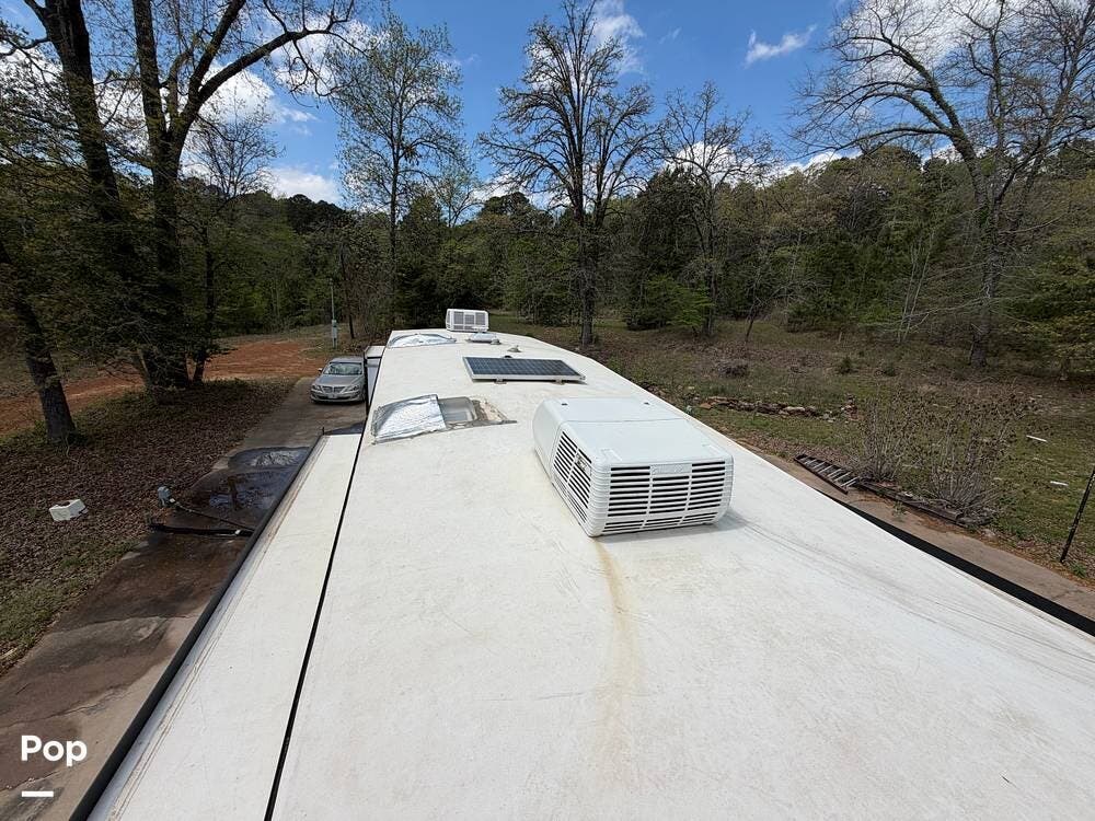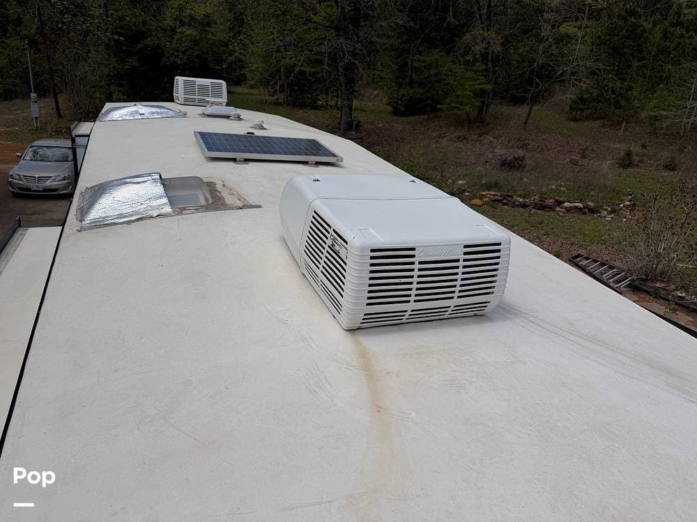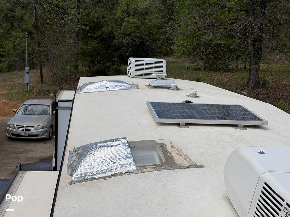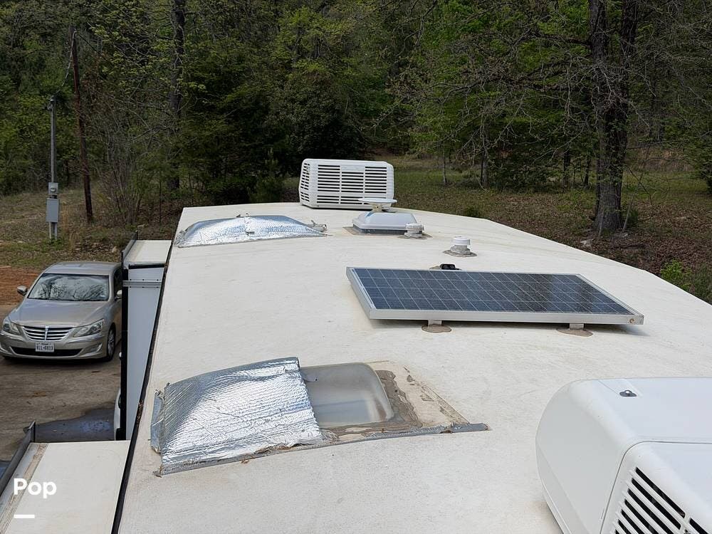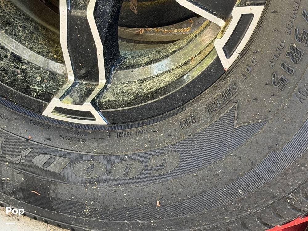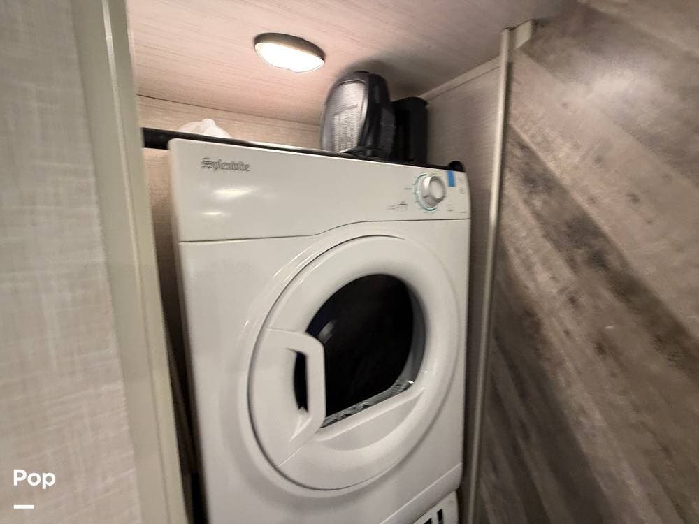 Upstairs, the private master suite offers a walk-around queen bed with under-bed storage, wardrobe closets, and washer/dryer prep for added convenience. The bathroom is spacious and well-appointed, with a large shower, glass doors, a skylight, a vanity, and additional linen storage, bringing a true residential feel on the road.