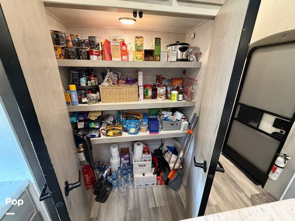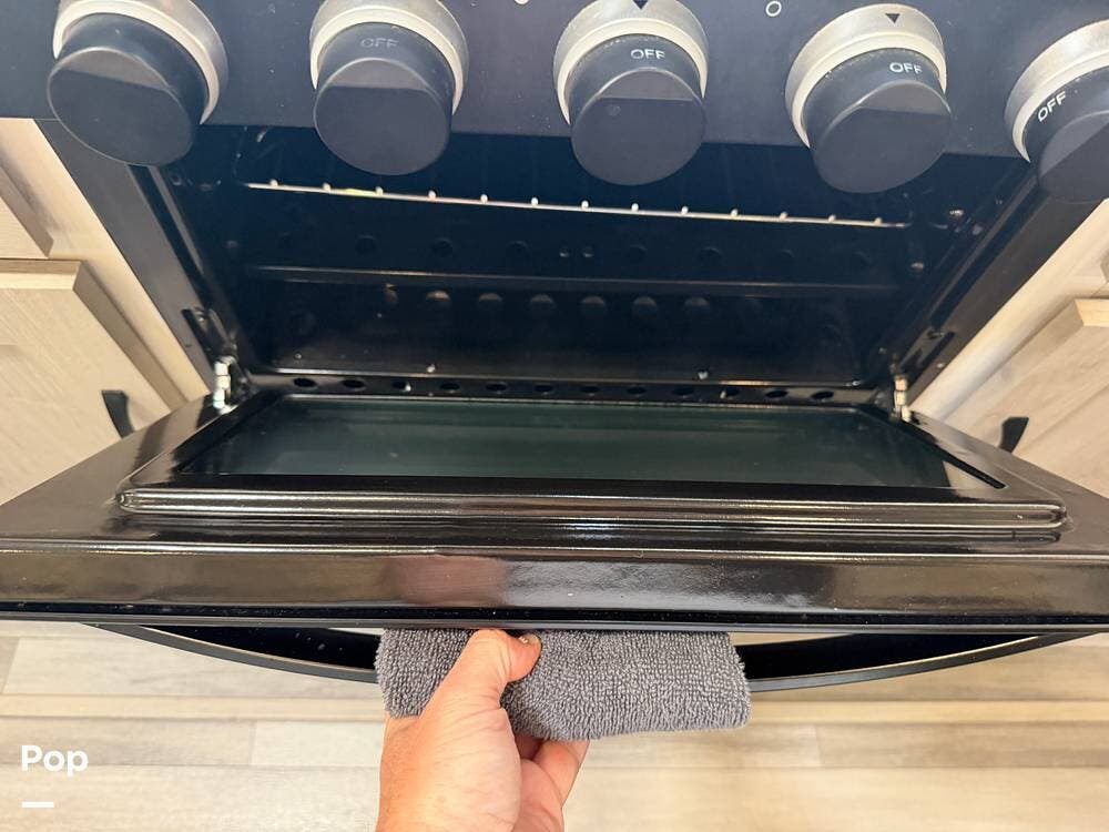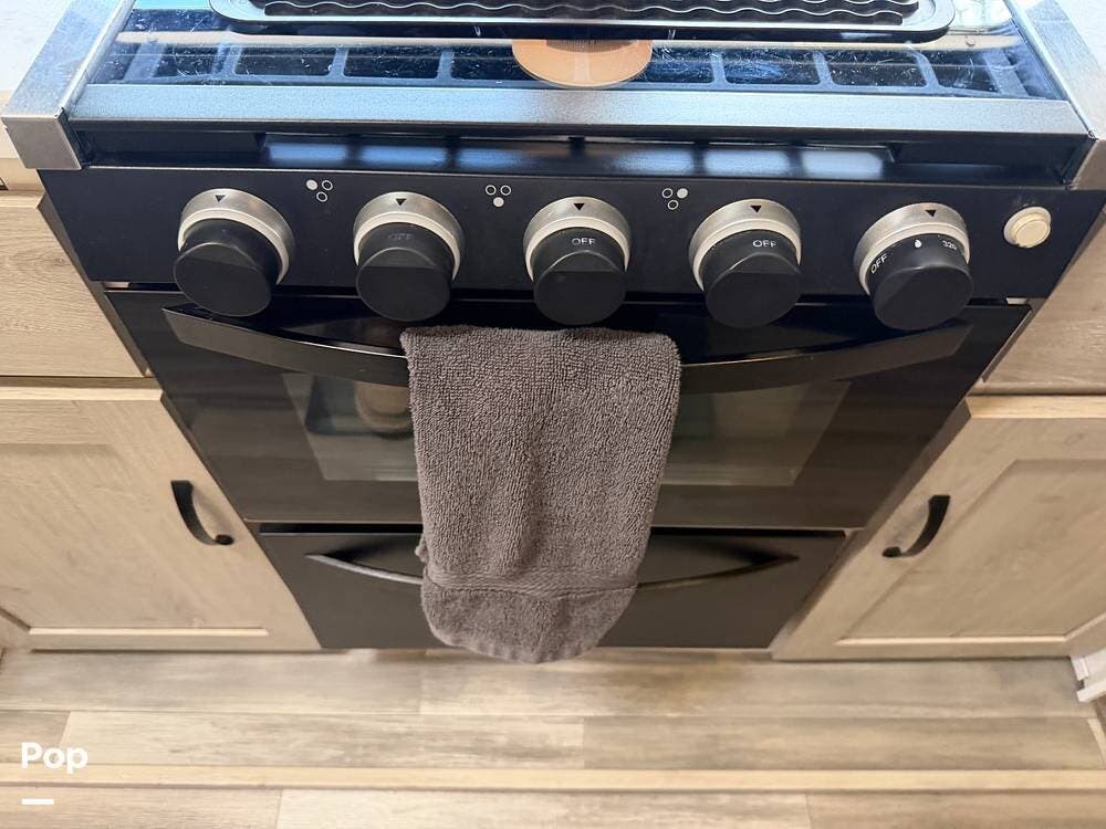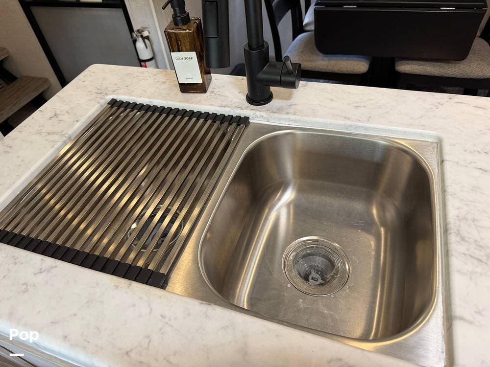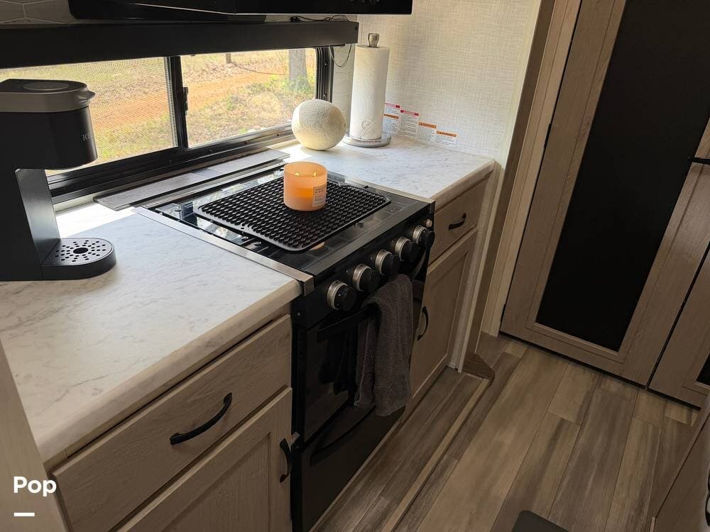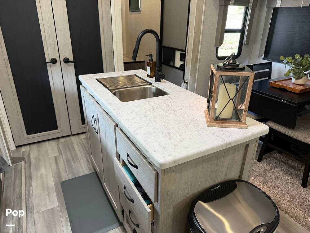 The kitchen is equally impressive, featuring solid-surface countertops, a deep stainless-steel sink, a residential-style faucet, and a three-burner cooktop with an oven. A generous 12V refrigerator, pantry storage, and ample cabinetry make meal prep and extended trips a breeze. Whether you're cooking for two or a group, this kitchen is designed to perform.