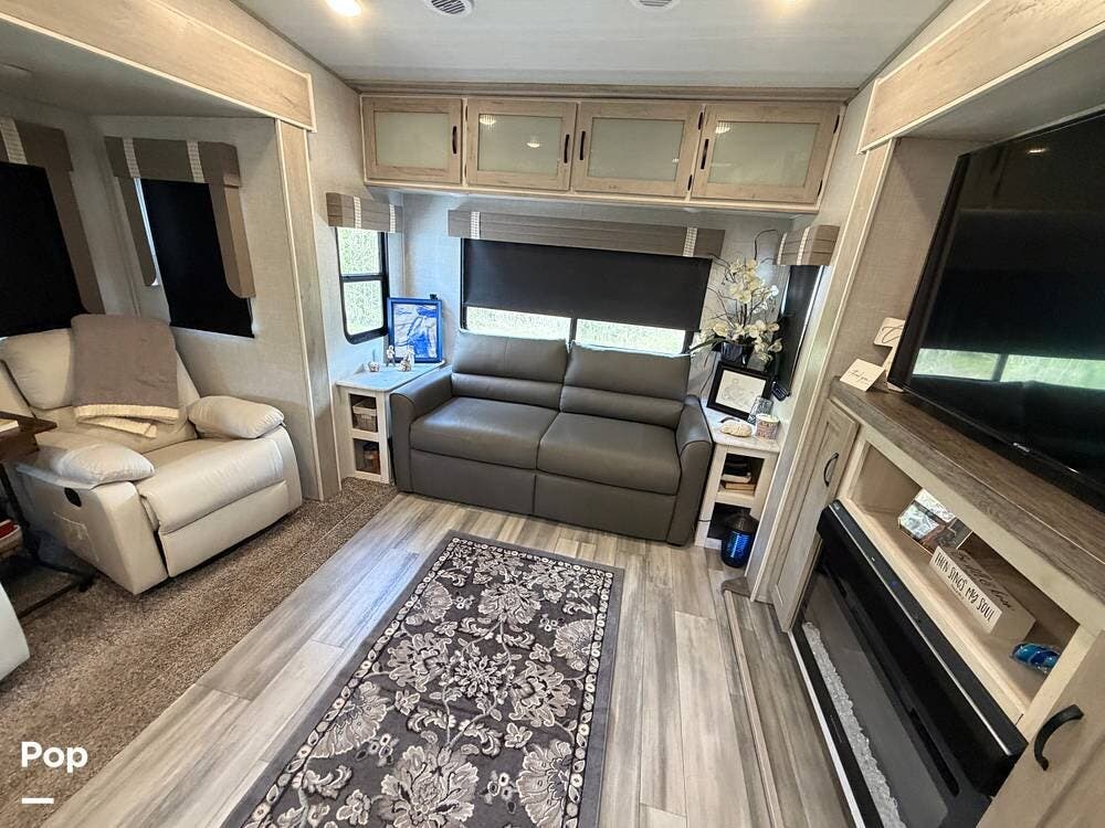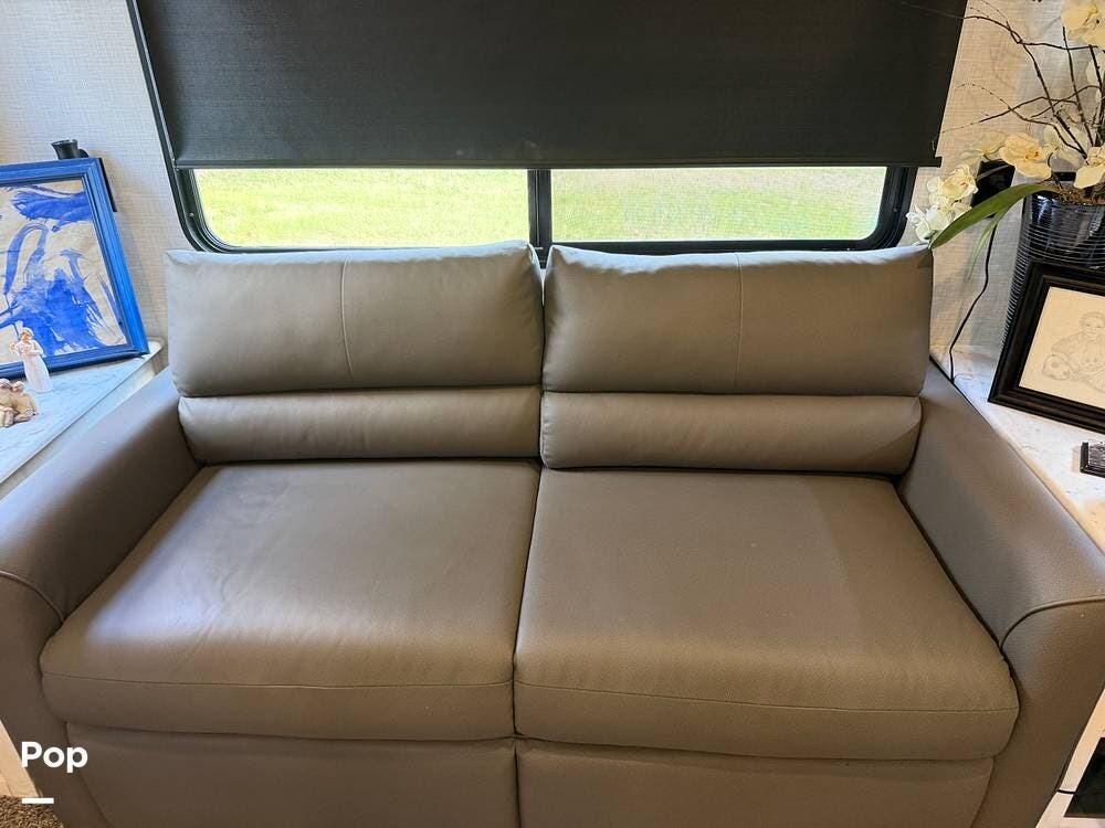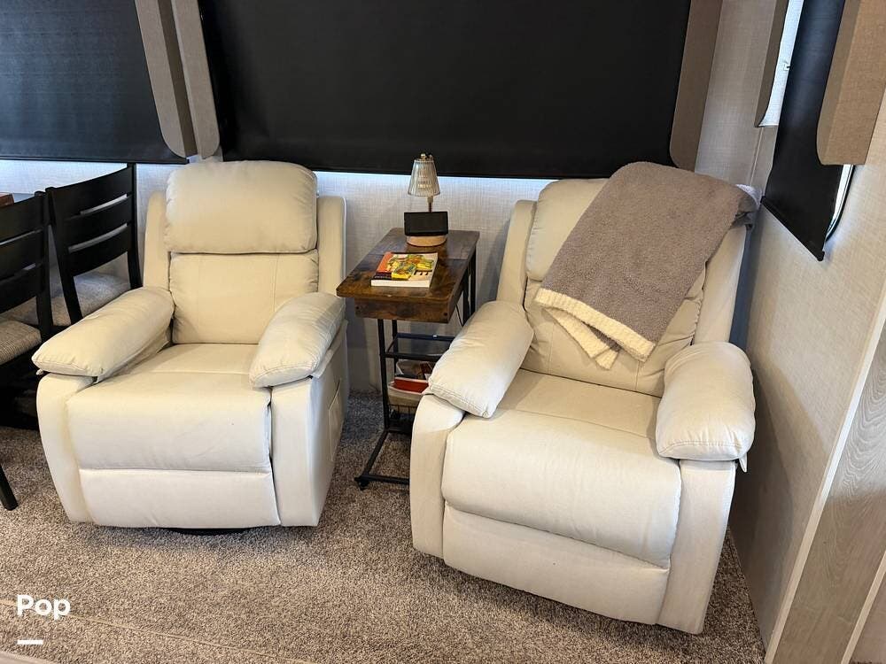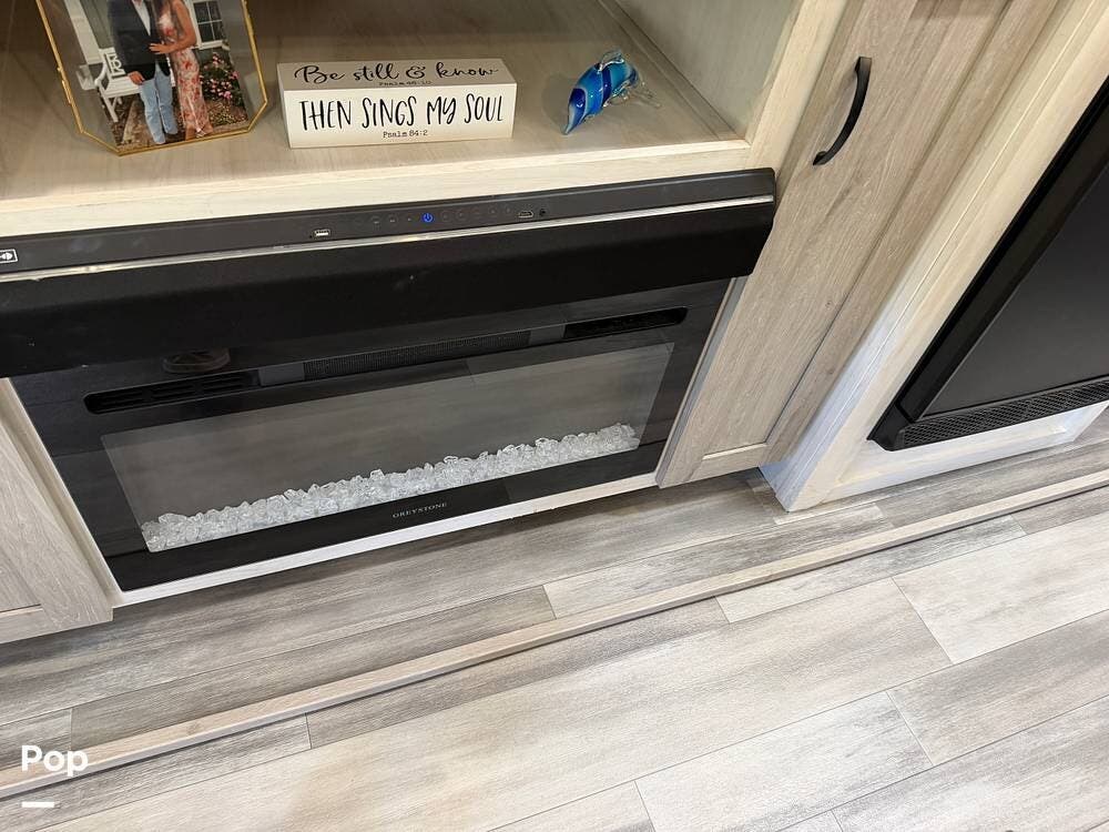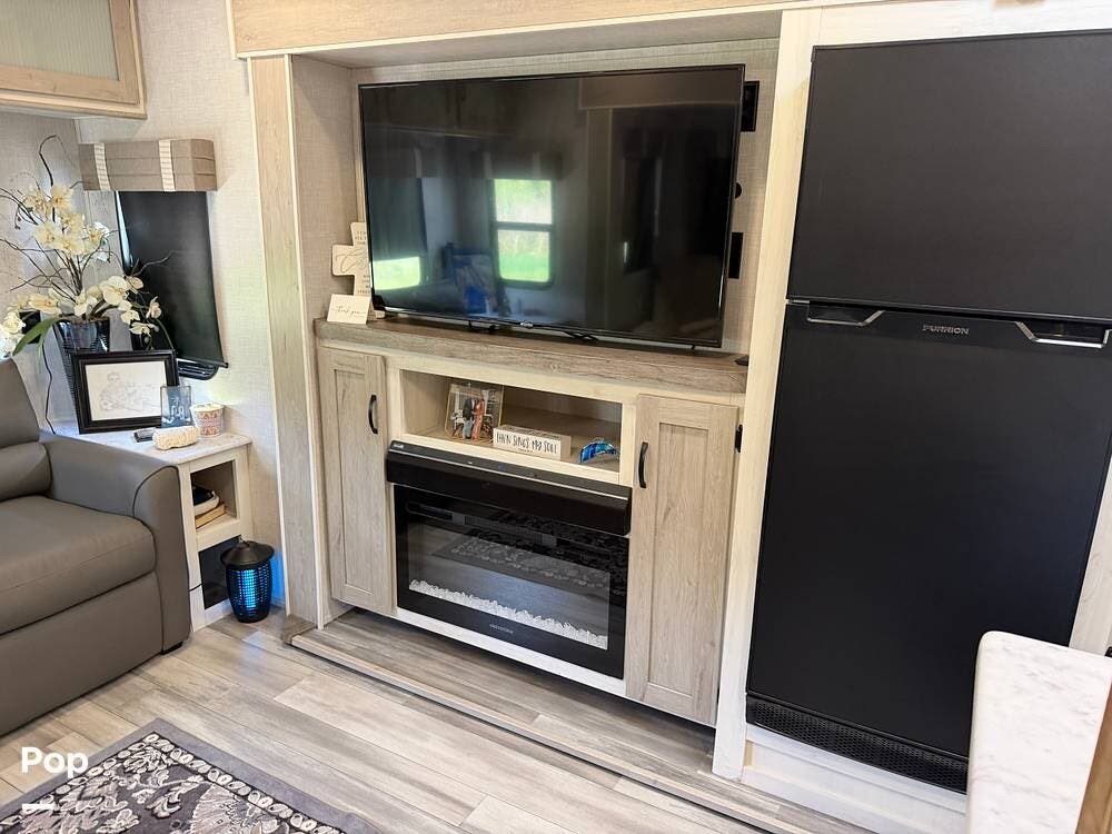 Step inside and you'll immediately notice the opposing slide-outs that create a wide, inviting living area. Plush theater seating and a tri-fold sleeper sofa face the entertainment center, complete with a large LED TV and an electric fireplace -- ideal for cozy evenings or hosting guests. Large panoramic windows flood the space with natural light, giving it a bright, airy feel while offering great campsite views.