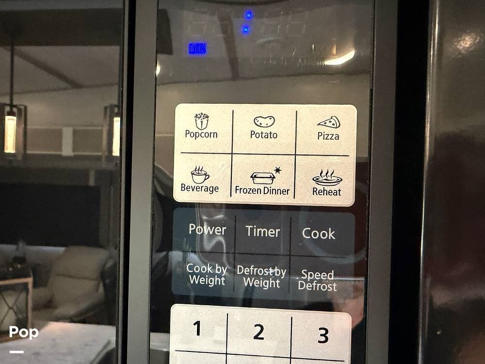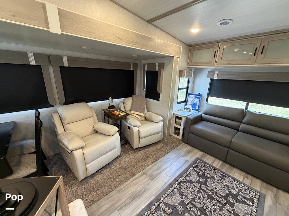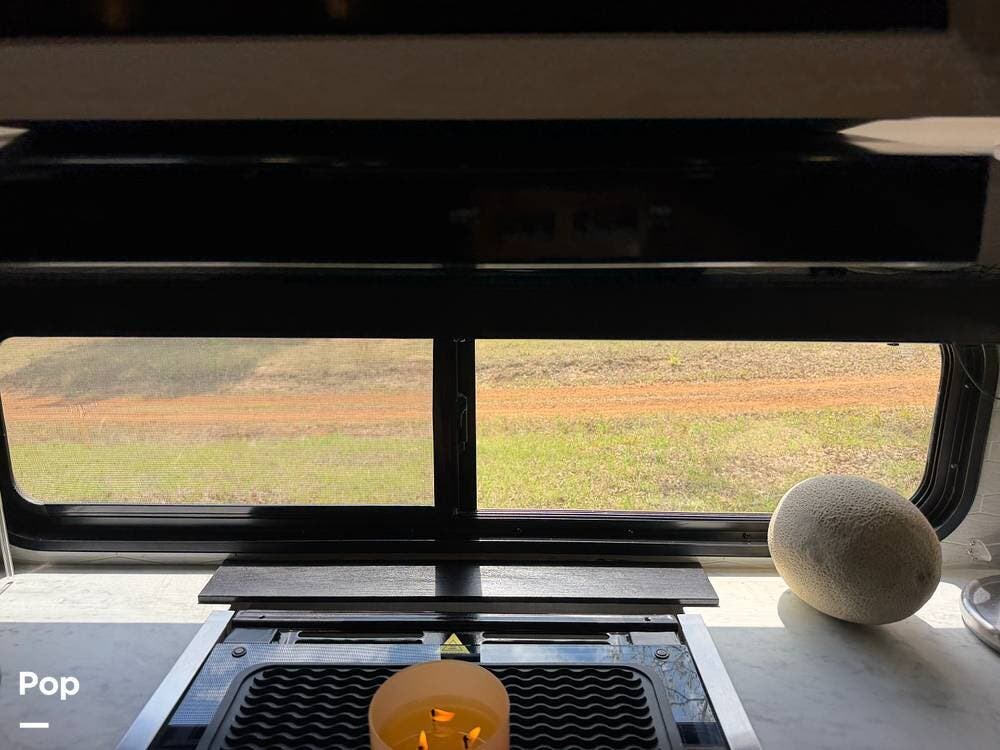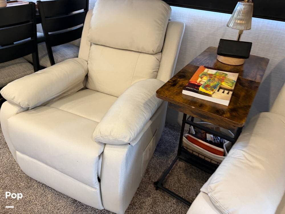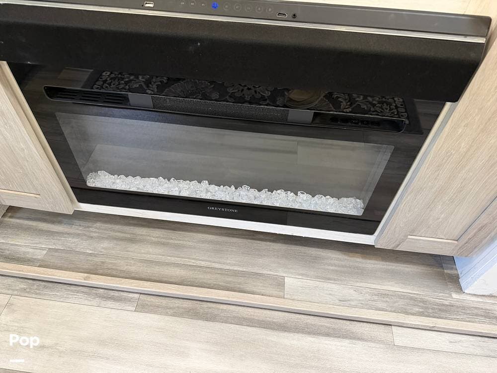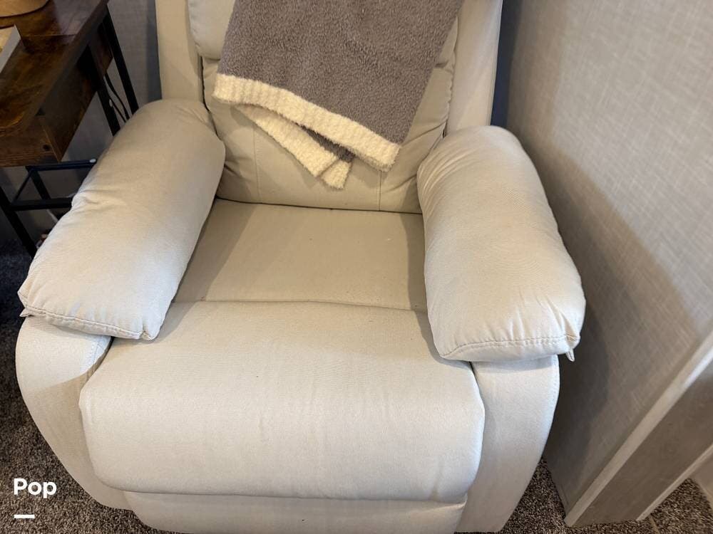 Step inside and you'll immediately notice the opposing slide-outs that create a wide, inviting living area. Plush theater seating and a tri-fold sleeper sofa face the entertainment center, complete with a large LED TV and an electric fireplace -- ideal for cozy evenings or hosting guests. Large panoramic windows flood the space with natural light, giving it a bright, airy feel while offering great campsite views.