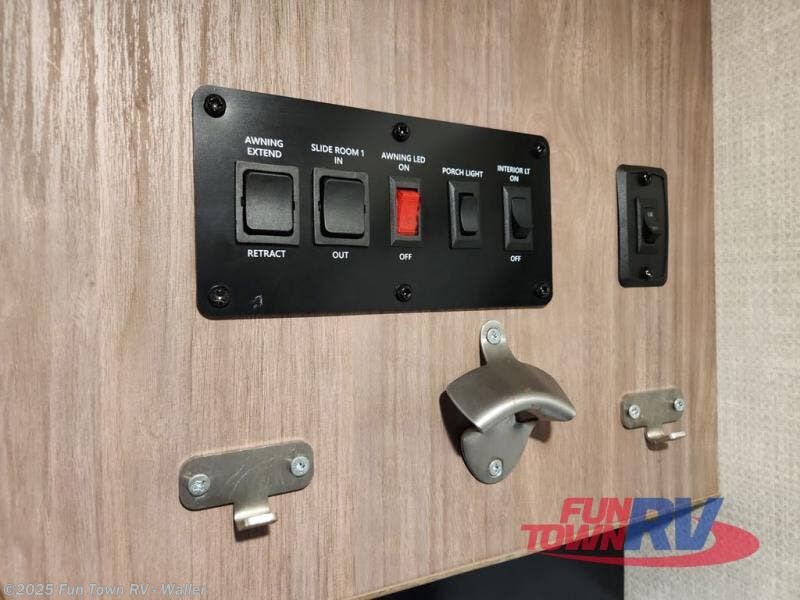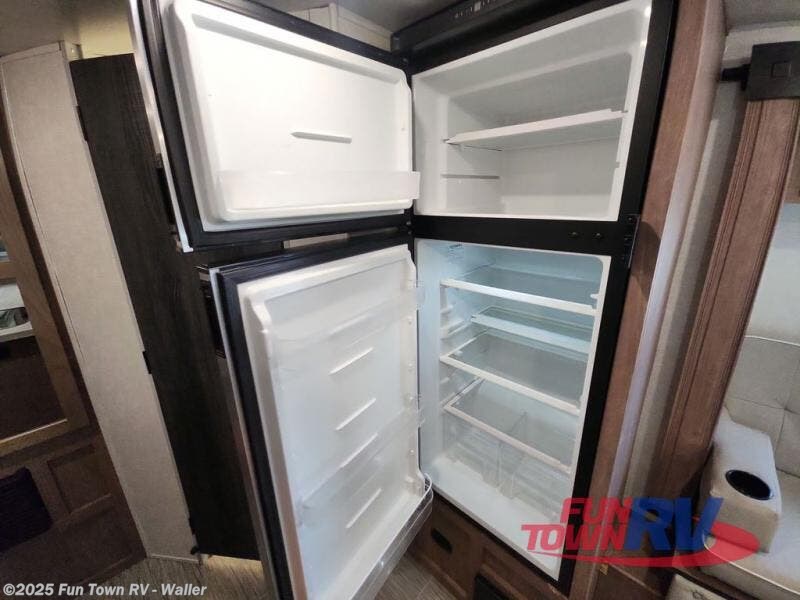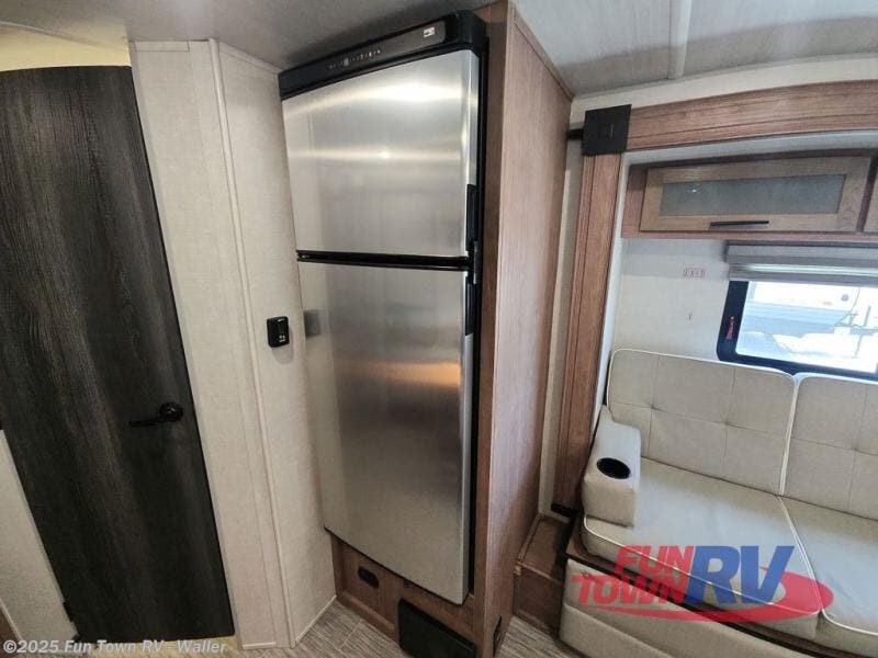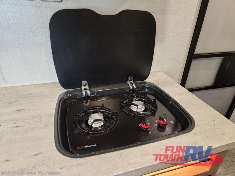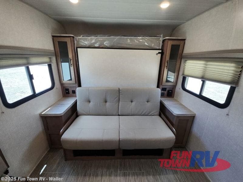 Make your camping dreams come true with this No Boundaries travel trailer! As you enter this unit, you'll notice an entryway closet that you can use to store your coats and scarves, and the full bathroom is also right in front of the entry door for easy access when you need it. The kitchen has great amenities, like a two-burner glass recessed cooktop, a refrigerator, and a sink, and there is a breakfast bar with two stools where you can sit down with a fresh plate of eggs each morning. When you fold away the Murphy bed in the morning, you'll have two sofas to rest on throughout the day, and you can use the JBL FLIP portable Bluetooth speaker to listen to some music while you enjoy the day.