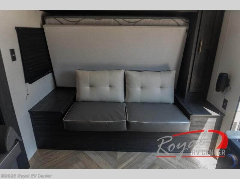 You can create the perfect oasis with this Ozark travel trailer! The exterior is outfitted with many useful features, like a 15' power awning to protect you, an outside shower with hot/cold water to rinse you off, an exterior LP griddle and refrigerator to allow you to prepare meals in the fresh air, a spare tire to use if you find yourself in need of a replacement, and an oversized door for storage access to the interior. On the interior, there is extra room thanks to the single slide. This slide is what holds the convertible chaise lounge with storage, and there is also a removable table in front of the chaise lounge for a place to eat when dinner is ready. The Murphy bed is especially useful when you are trying to be frugal with your space because it can fold away to reveal a sofa during the day.