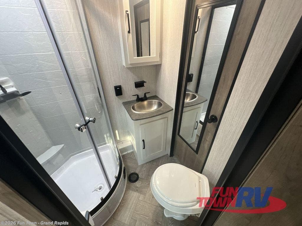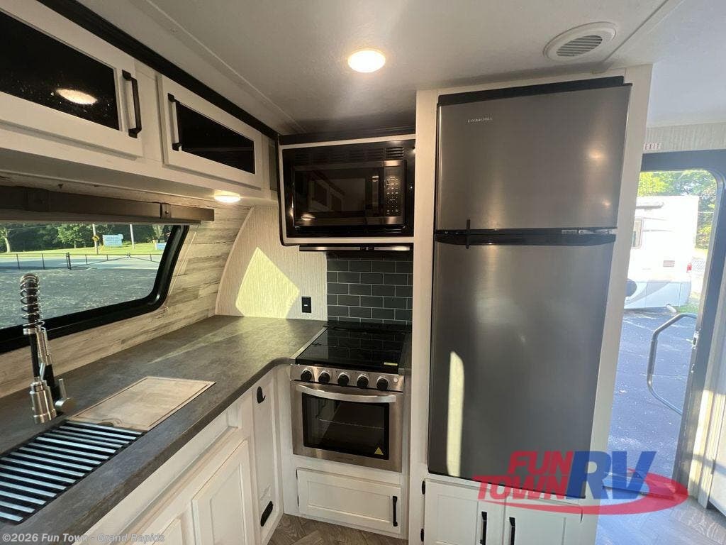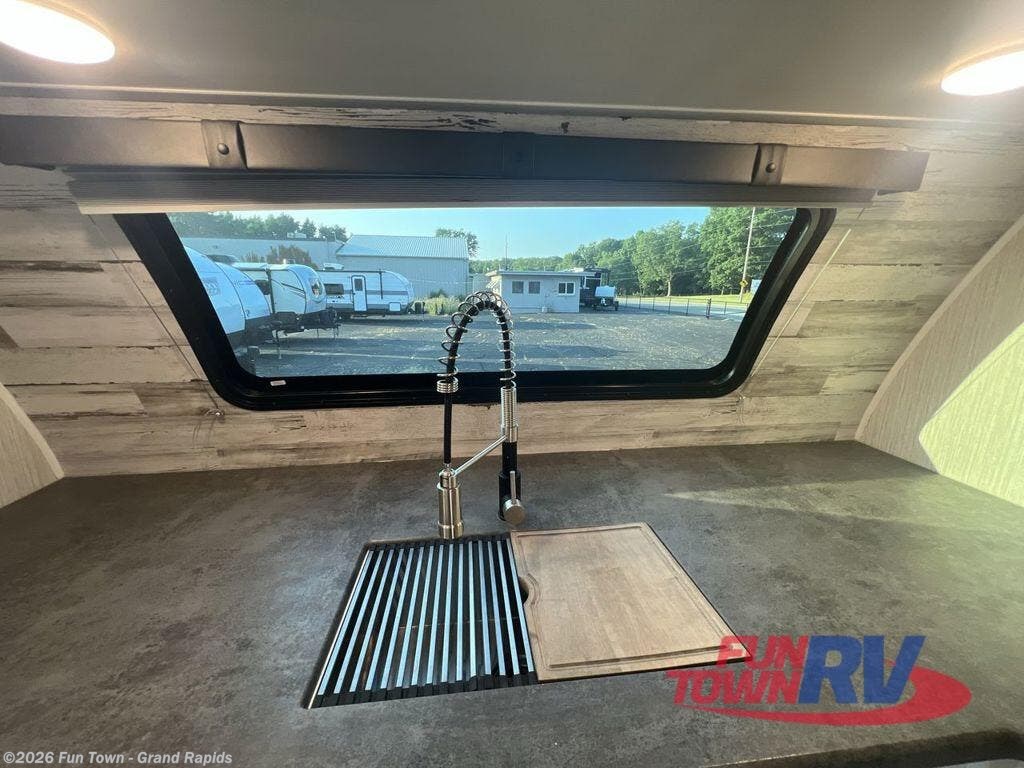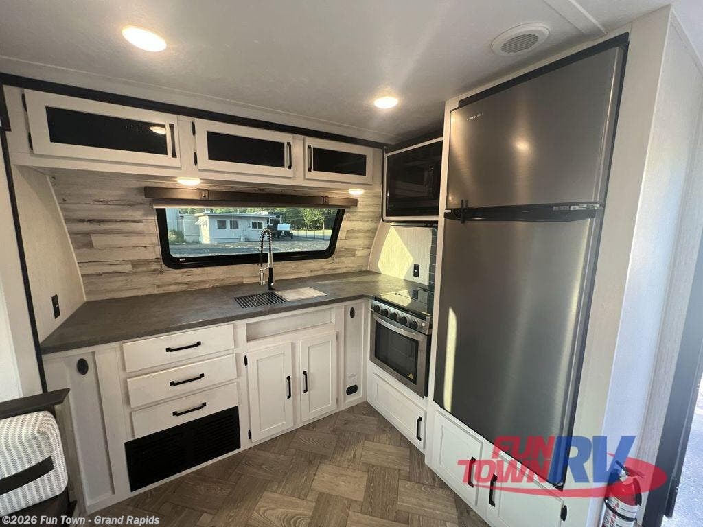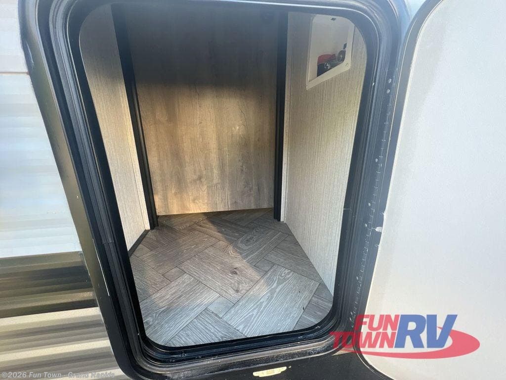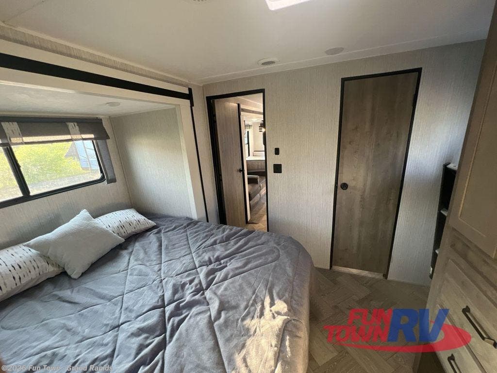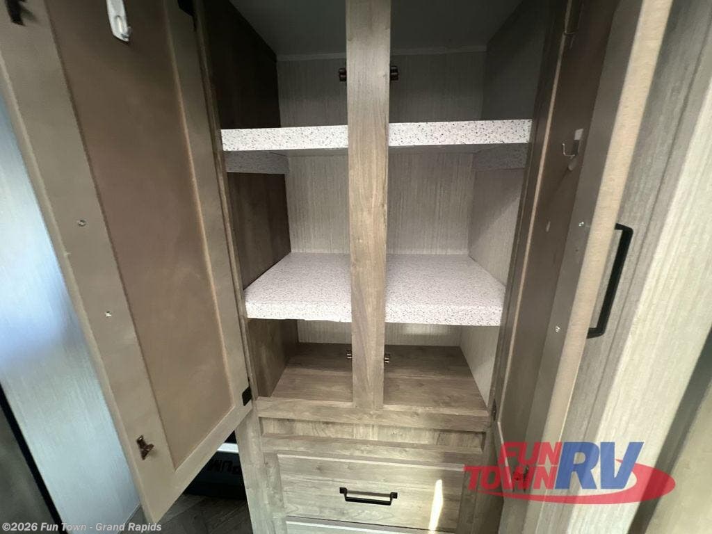Walk into this travel trailer with one of the dual entry doors for a great camping trip! One entrance enters directly into the rear private bedroom which has a queen bed slide, a walk-in closet that is prepped for an optional washer and dryer, a wardrobe, and even an entrance into the dual entry bathroom. Grab a snack from the walk-in pantry then relax on the sofa while you watch a movie with the entertainment center or play a game at the booth dinette. The front kitchen has everything you will need to prepare your best home cooked meals including lots of countertop space, and you could even add an optional exterior micro kitchen with griddle for dinner outdoors!