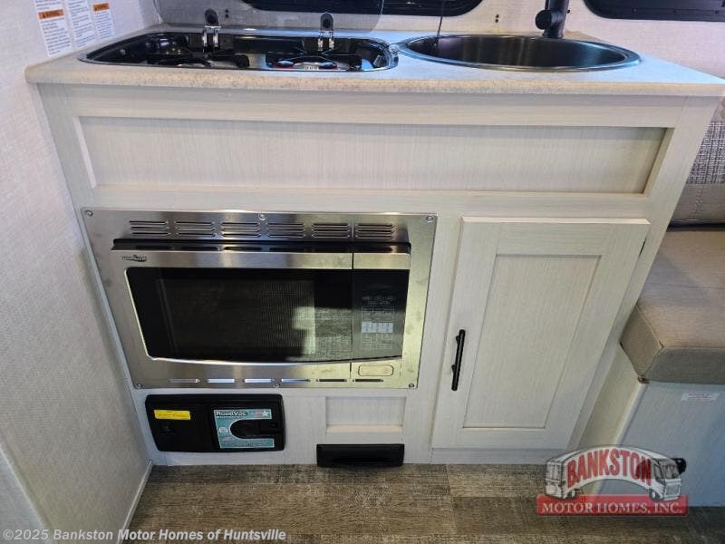 Weekends at the lake just got sweeter in this cozy R-Pod travel trailer. You can prepare your meals each day on the two burner recessed cooktop, or in the convection microwave. There is a sofa to relax on with a good book, plus a booth dinette up front that features a Murphy bed you can fold down at night. This model also includes a refrigerator to keep your perishables fresh, and a pantry to store snacks and dry goods.