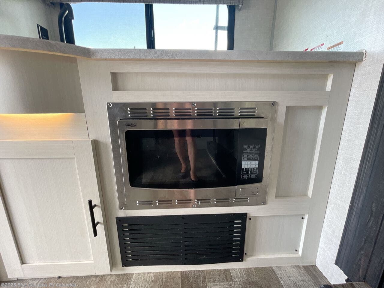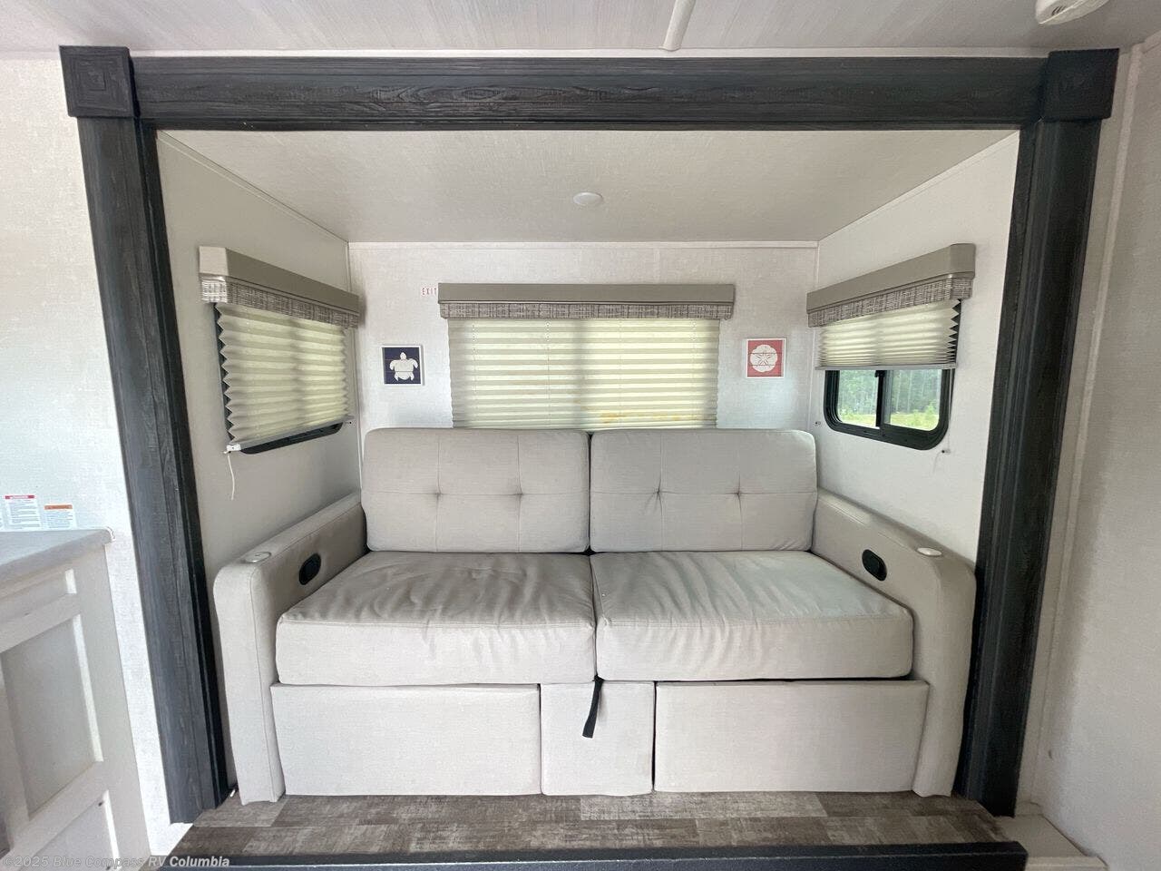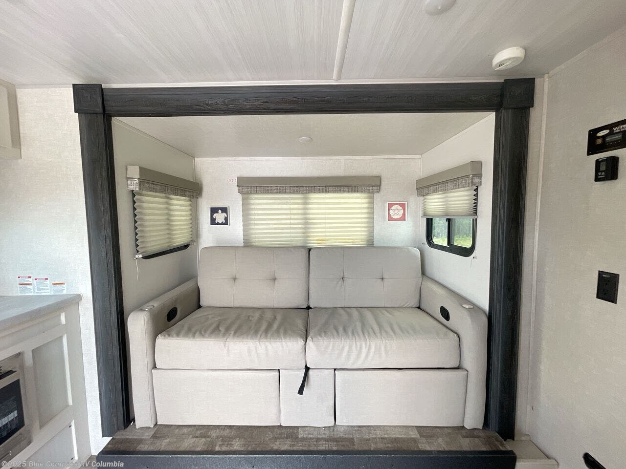 A private bedroom with a walk-around RV queen bed, a walk-through bathroom, and an outside kitchen are a few of the features that you are sure to want in your next RV! You can rest comfortably each night, plus all your clothing can be stored in the dual wardrobes to keep everything tidy. Everyone will stay clean with the full bathroom only steps away, and there is linen storage as well. The main living and kitchen area offers a slide out dinette that can also sleep one more camper. The rear kitchen provides everything you will need, plus the outside kitchen gives you more choices. Step inside to start planning your weekend trip!