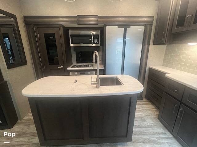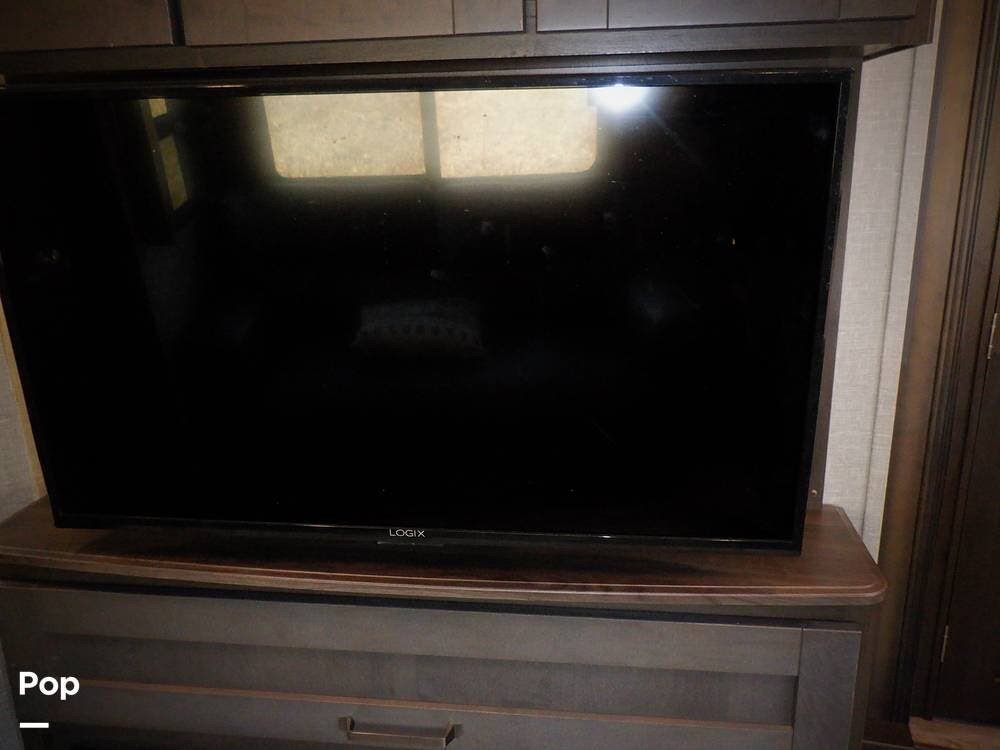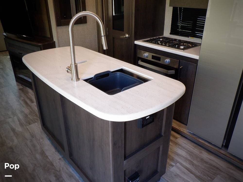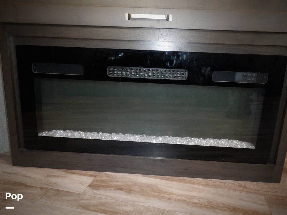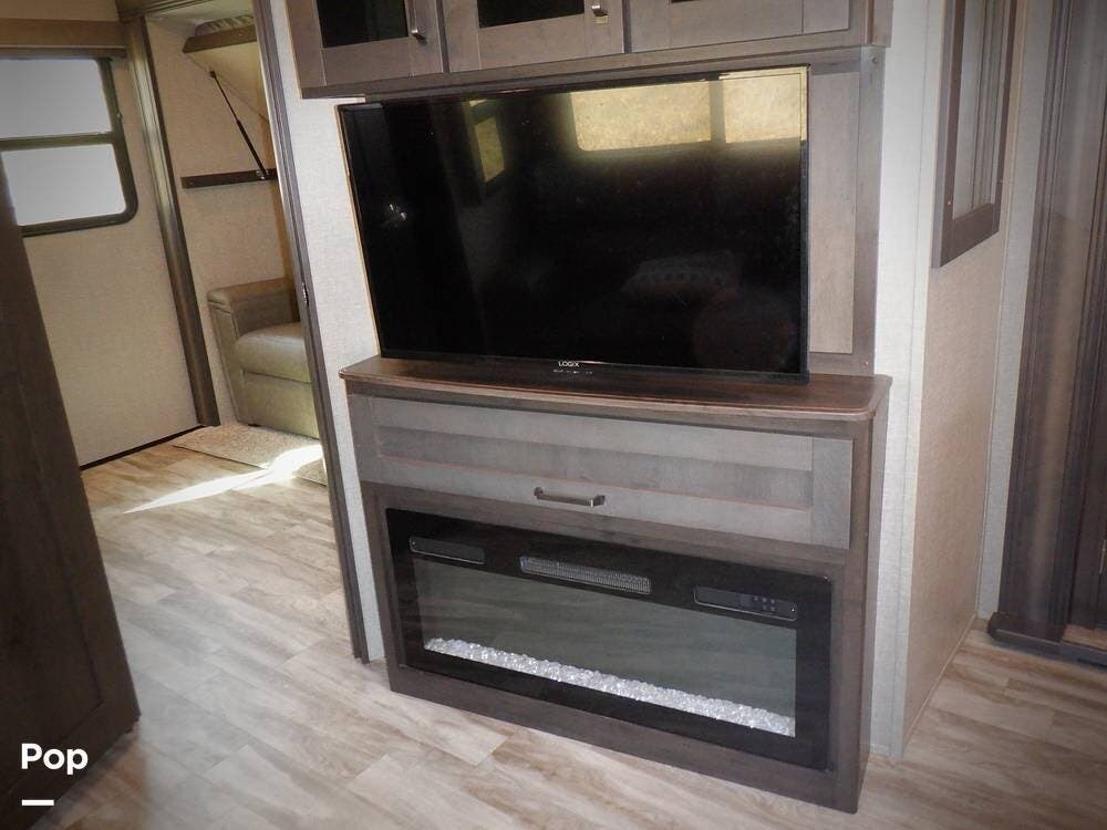 In the main living area, you have another sleeper sofa, a kitchen island, a residential refrigerator, a fireplace, and a TV, so you have a nice place to gather and eat when the weather is not cooperating.
