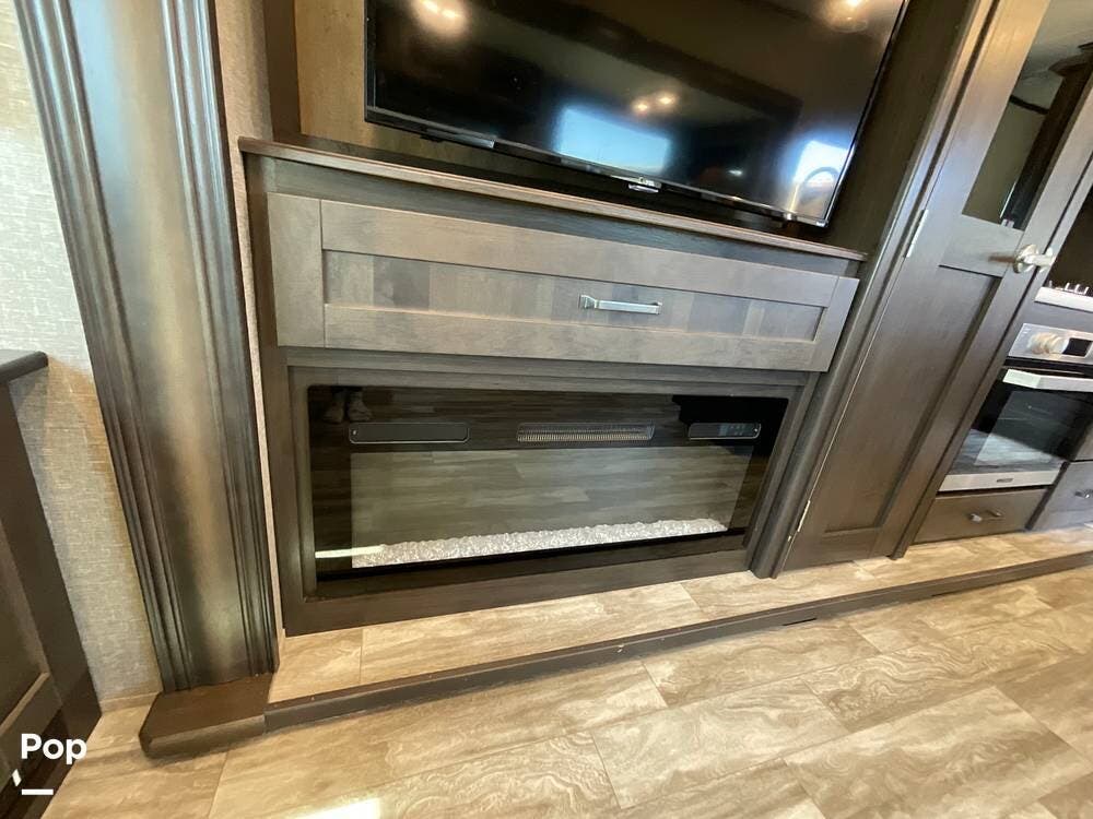 The rear living area features an entertainment center with a TV and a fireplace, recliners, a sleeper sofa, and a dining table with a bench for extra storage.