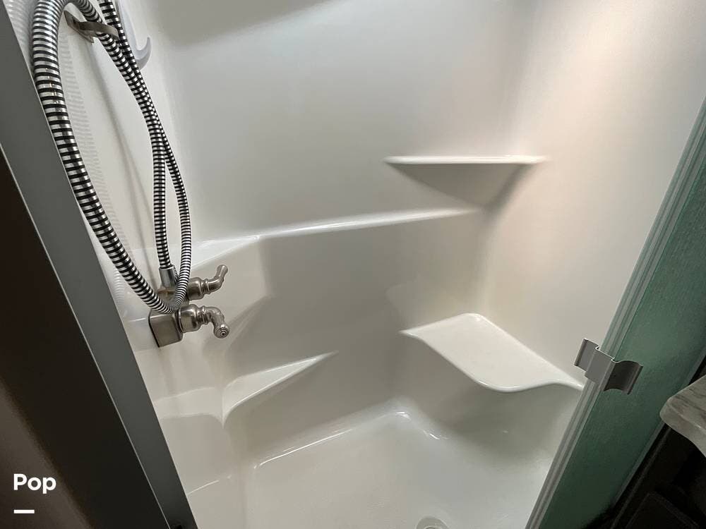 The bathroom has a good-sized shower with an upgraded showerhead and seat.