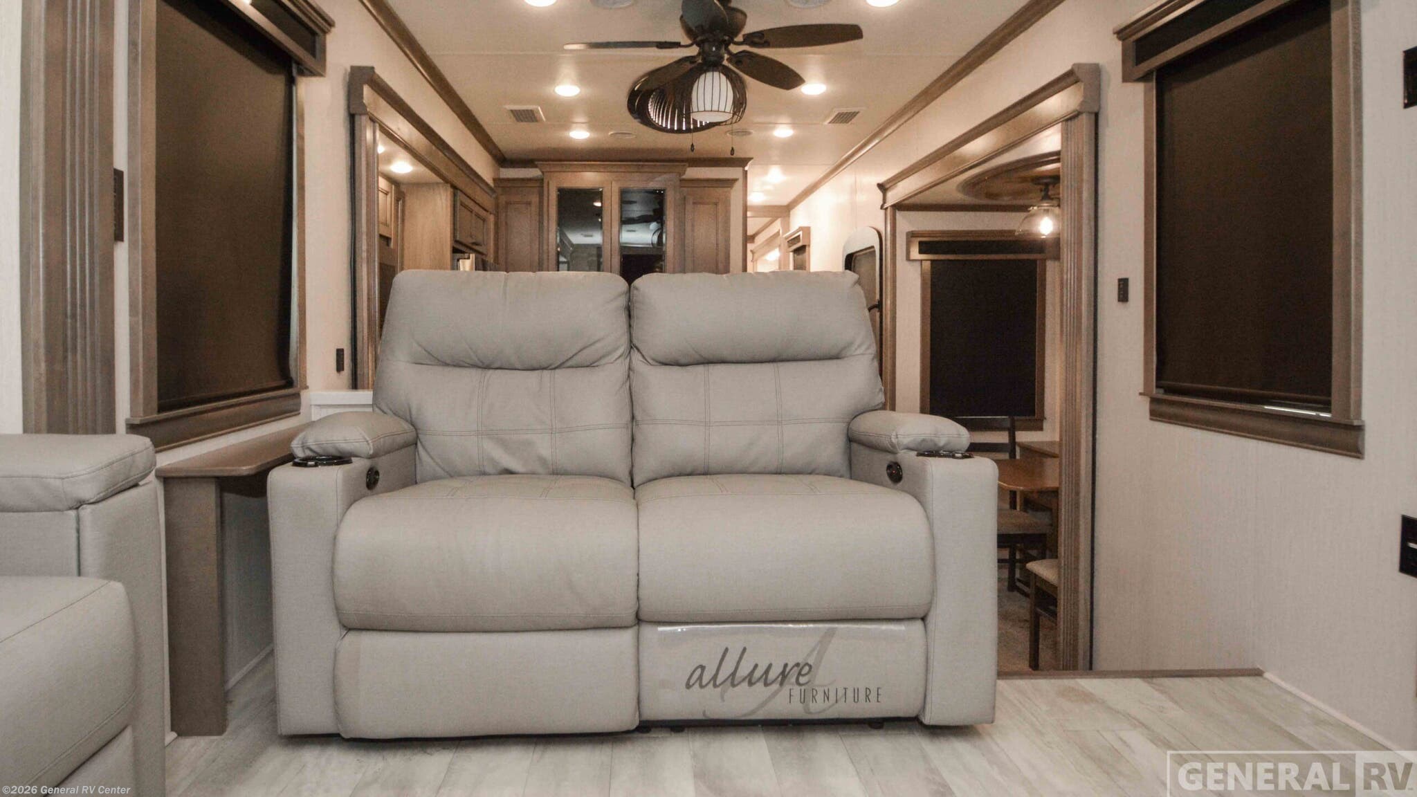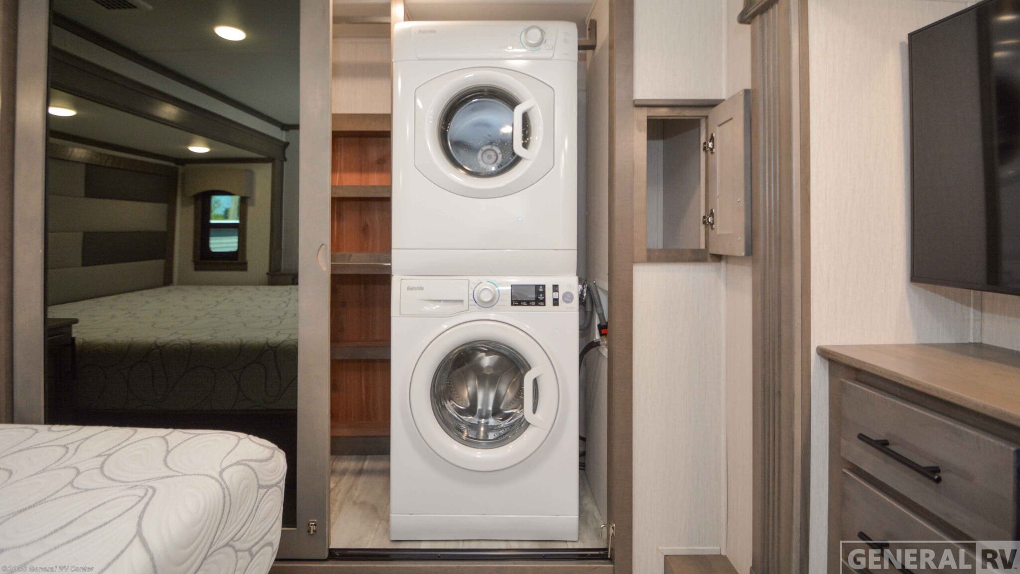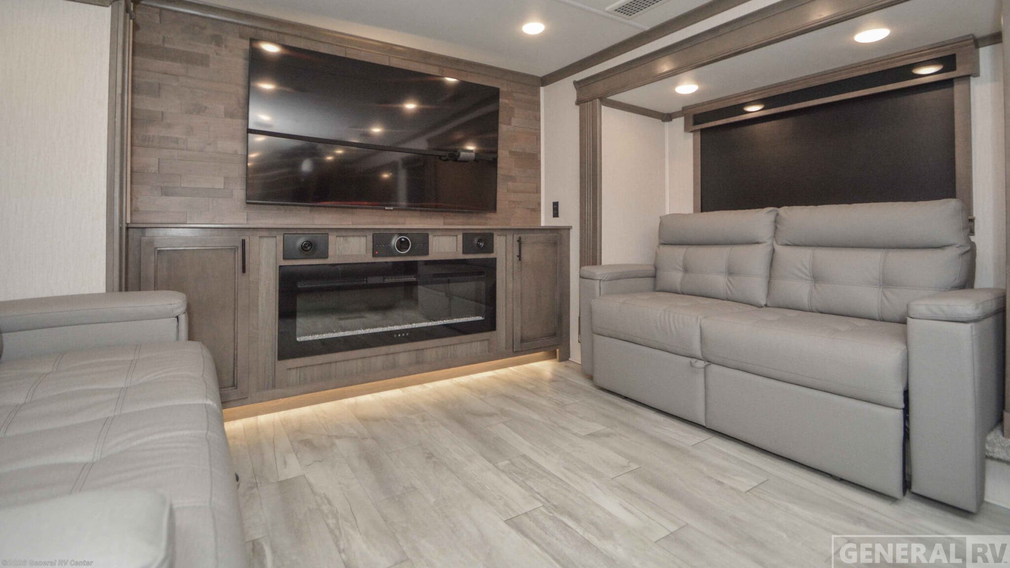**Forest River RiverStone fifth wheel 419RD highlights:** - Dual-Sink Vanity - Rear Den - Fireplace - Kitchen Island - King-Size Bed You will be completely impressed with this RiverStone fifth wheel! There is a private bedroom that includes a king-size bed, 40" LED TV, washer/dryer, dresser, and a mirrored wardrobe. The bedroom is right next to the full bathroom where you will find a dual-sink vanity, porcelain toilet with foot flush, shower, and linen closet. The kitchen has opposing slides that keep this space open, and there is a pull-out dinette that you can sit at when it's dinner time. Above the island there is a large Infiniti light, and the ceiling fan will keep the interior cool while you relax. Speaking of relaxing, there's no better place to do that than in the rear den. This separate living area has a theater sofa, two E-Z glide sofas, and an entertainment center with a 65" Samsung LED Smart TV and fireplace. The Forest River RiverStone fifth wheels and toy haulers are luxurious units that have it all! You'll find an automatic six-point hydraulic level-up system to keep your unit in place, and there is preparation for a four-camera observation system. The King Wi-Fi Max router and omni-directional Wi-Fi antenna/extender will help you stay connected to the outside world, and you'll never have to overpack again since the Splendid “Astral” stackable washer and dryer will let you clean the small amount of clothes you've brought with you. Another high luxury is the Fischer Paykal dishwasher which will allow you to spend more time enjoying your camp life and less time cleaning up. Each unit is built with an LCI Road Armour suspension system, dual-pane frameless windows, a full docking station, a 190W solar panel, and a Firefly integrated touch control system.