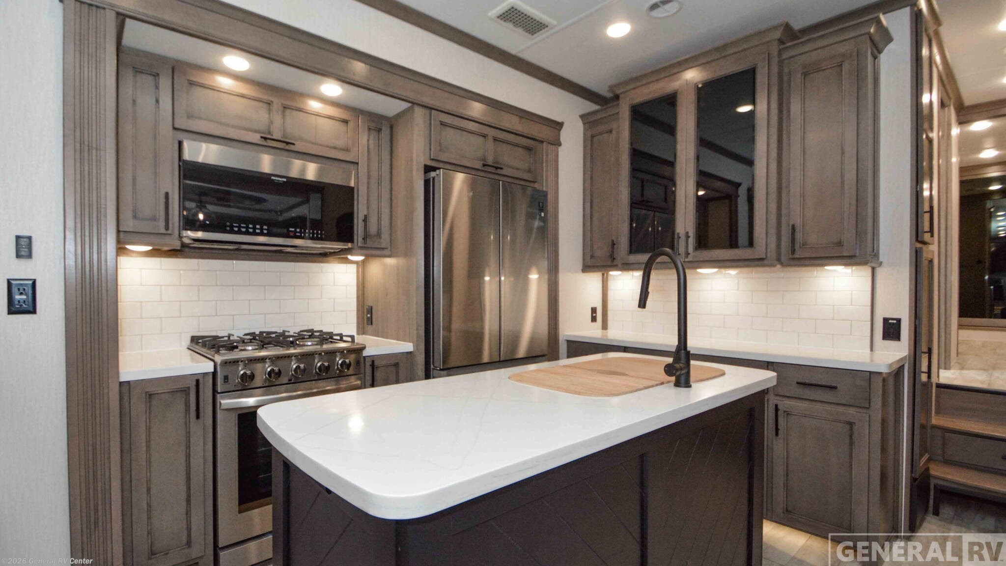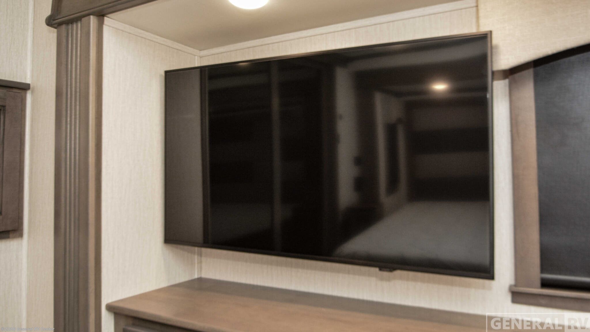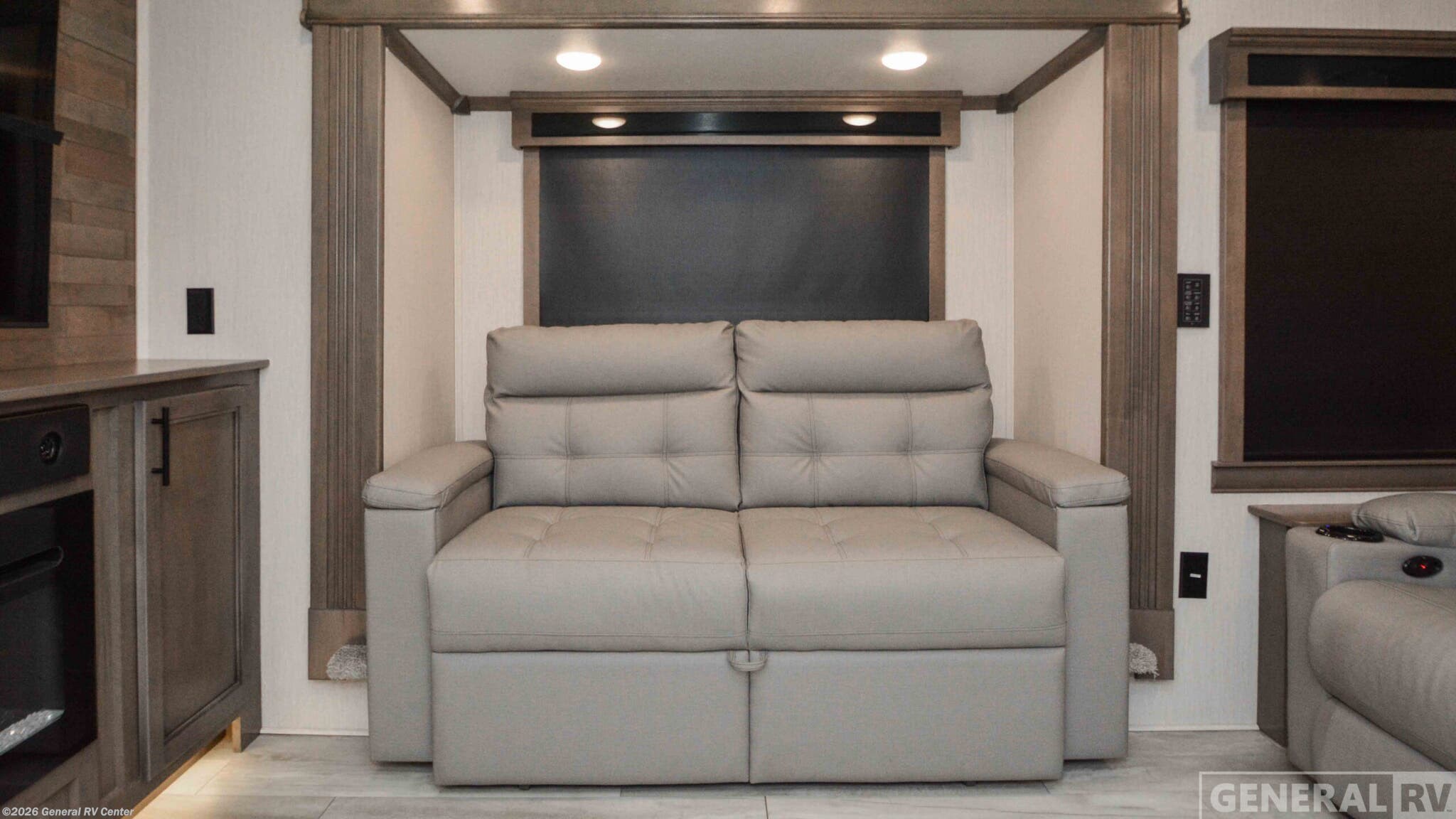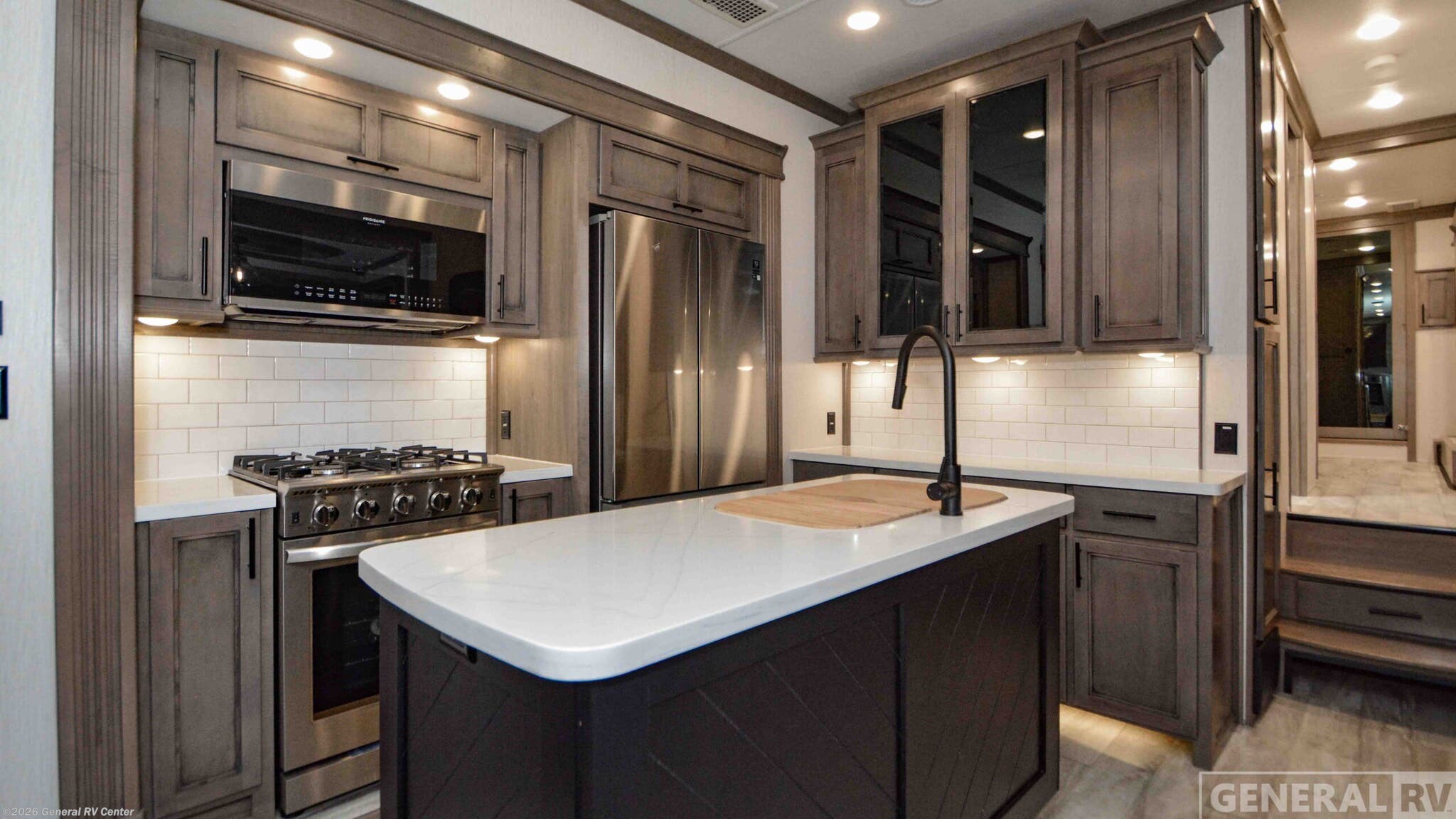 **Forest River RiverStone fifth wheel 419RD highlights:** - Dual-Sink Vanity - Rear Den - Fireplace - Kitchen Island - King-Size Bed You will be completely impressed with this RiverStone fifth wheel! There is a private bedroom that includes a king-size bed, 40" LED TV, washer/dryer, dresser, and a mirrored wardrobe. The bedroom is right next to the full bathroom where you will find a dual-sink vanity, porcelain toilet with foot flush, shower, and linen closet. The kitchen has opposing slides that keep this space open, and there is a pull-out dinette that you can sit at when it's dinner time. Above the island there is a large Infiniti light, and the ceiling fan will keep the interior cool while you relax. Speaking of relaxing, there's no better place to do that than in the rear den. This separate living area has a theater sofa, two E-Z glide sofas, and an entertainment center with a 65" Samsung LED Smart TV and fireplace. The Forest River RiverStone fifth wheels and toy haulers are luxurious units that have it all! You'll find an automatic six-point hydraulic level-up system to keep your unit in place, and there is preparation for a four-camera observation system. The King Wi-Fi Max router and omni-directional Wi-Fi antenna/extender will help you stay connected to the outside world, and you'll never have to overpack again since the Splendid “Astral” stackable washer and dryer will let you clean the small amount of clothes you've brought with you. Another high luxury is the Fischer Paykal dishwasher which will allow you to spend more time enjoying your camp life and less time cleaning up. Each unit is built with an LCI Road Armour suspension system, dual-pane frameless windows, a full docking station, a 190W solar panel, and a Firefly integrated touch control system.