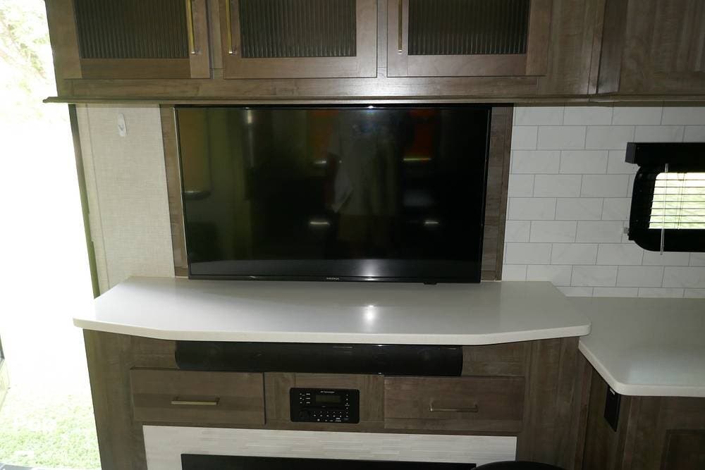 A cozy fireplace to enjoy the warmth and ambiance on cooler evenings inside the main living area. There is a TV and entertainment system with indoor and outdoor speakers, plus a TV that keeps everyone entertained