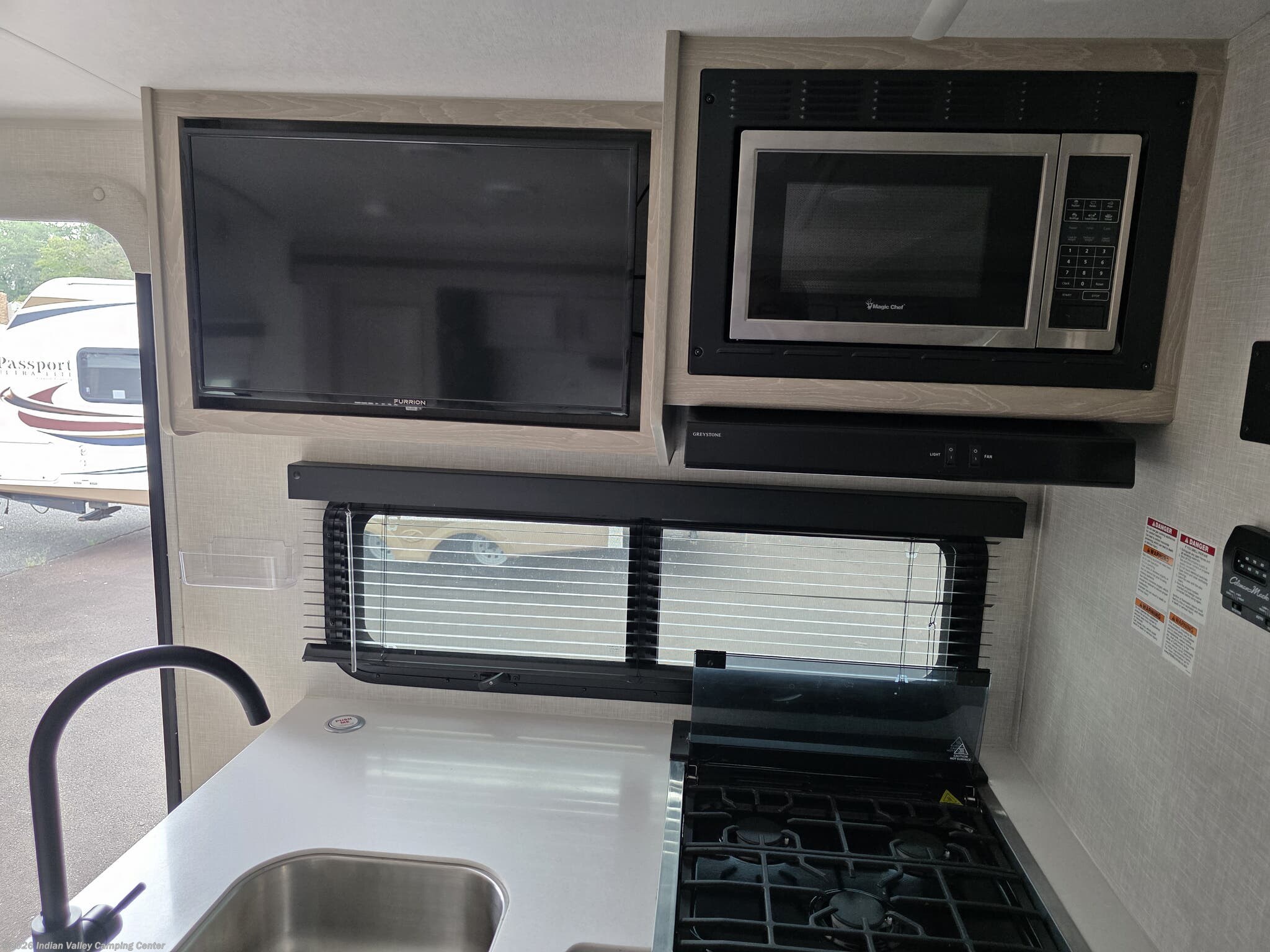 Enjoy your favorite music and shows with modern entertainment options, including a TV, DVD player, CD player, exterior speakers, and an awning to enjoy outdoor shade. The exterior features an outdoor grill, exterior shower, ladder, leveling jacks, and a spare tire kit, making outdoor cooking and maintenance simple and efficient.