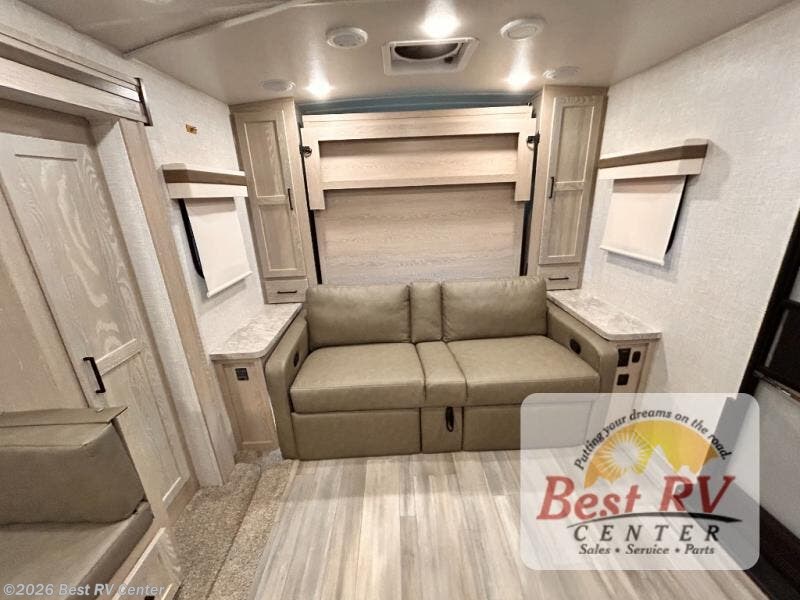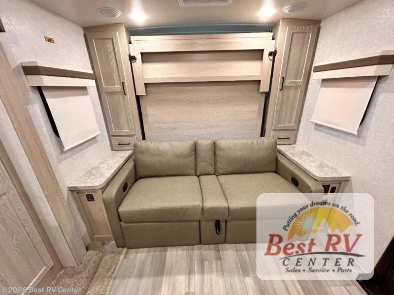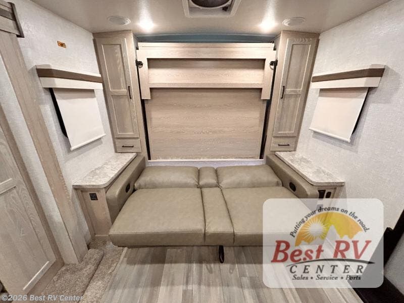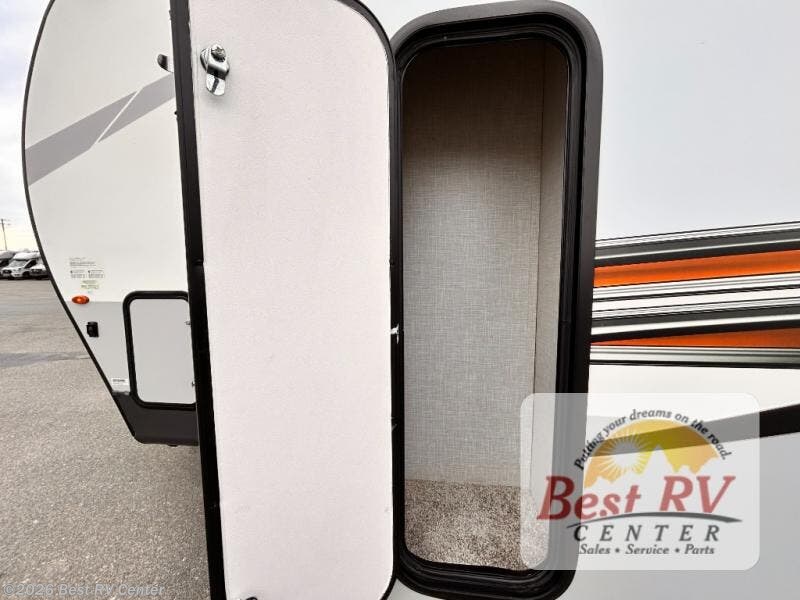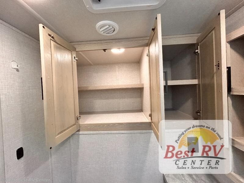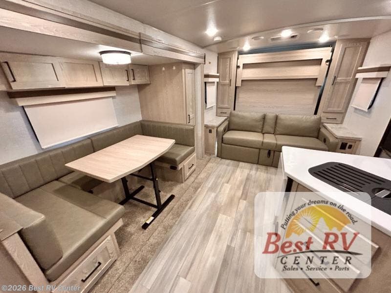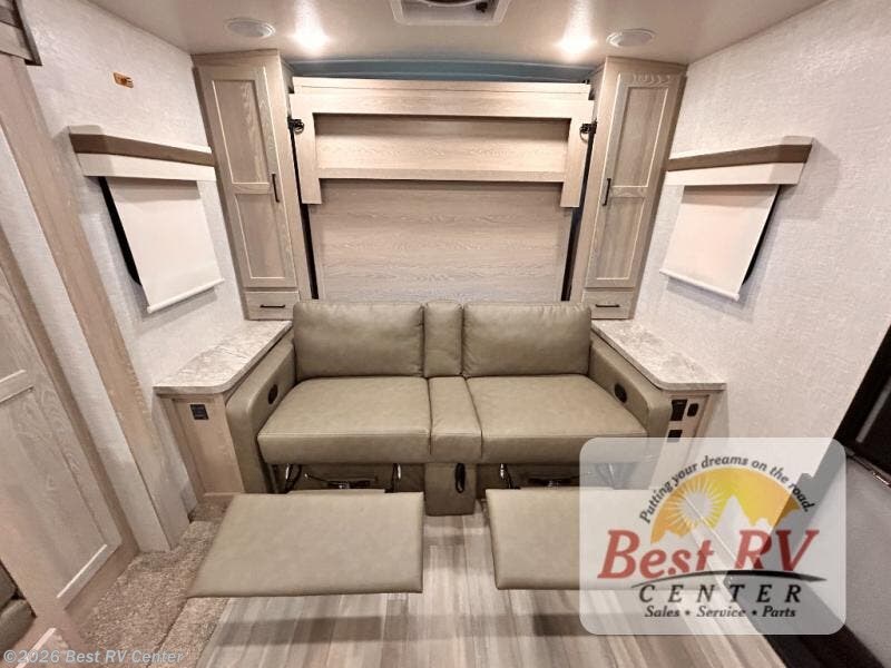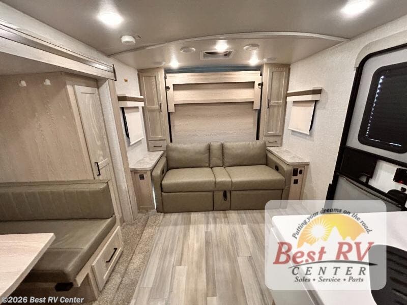 You can't beat this travel trailer with an outside kitchen, tons of exterior storage, and a versatile Murphy bed up front! When your crew isn't outside under the 19' power awning, they can head indoors to play a game around the U-shaped dinette, or watch a movie on the LED TV. There is also a 72" sofa here when the bed is folded away, and everyone will appreciate the spacious full rear bath for privacy. This model includes plenty of exterior space, but you'll be impressed by the interior storage space as well; dual bedroom wardrobes, a wardrobe within the slide out, plus a lean-in pantry in the kitchen for snacks!