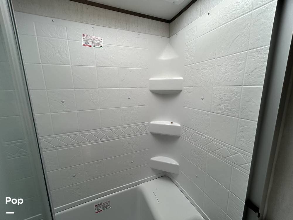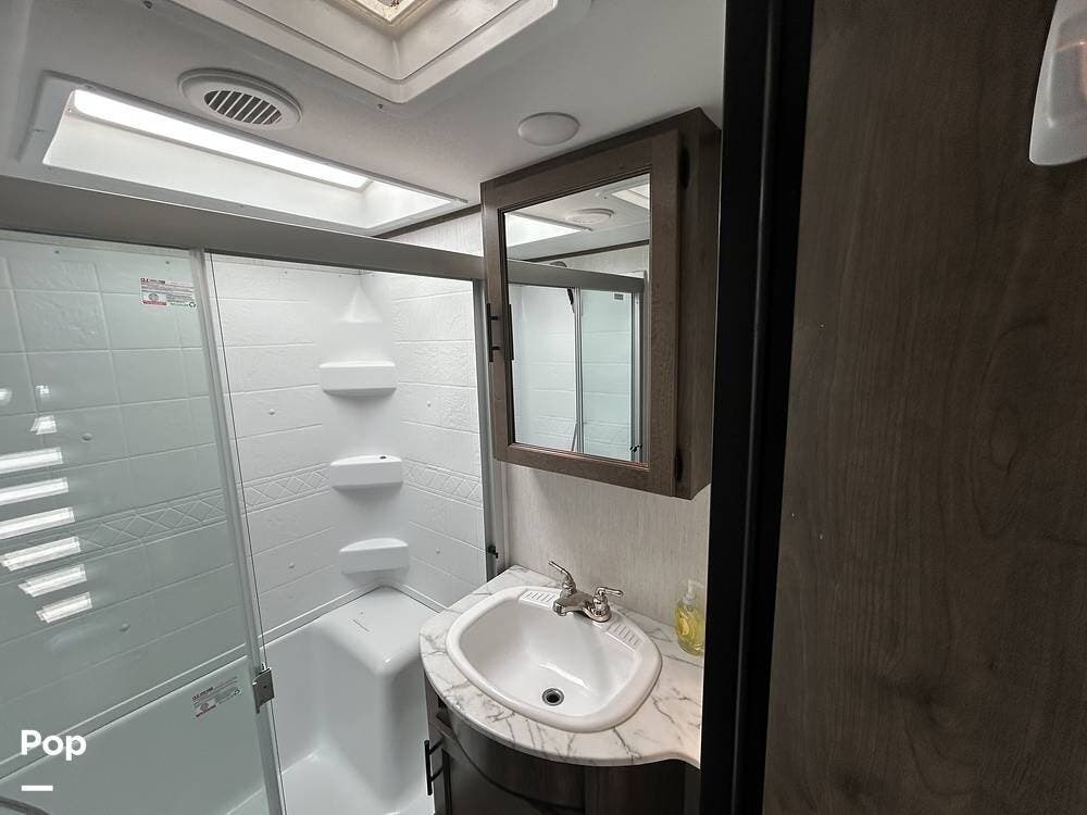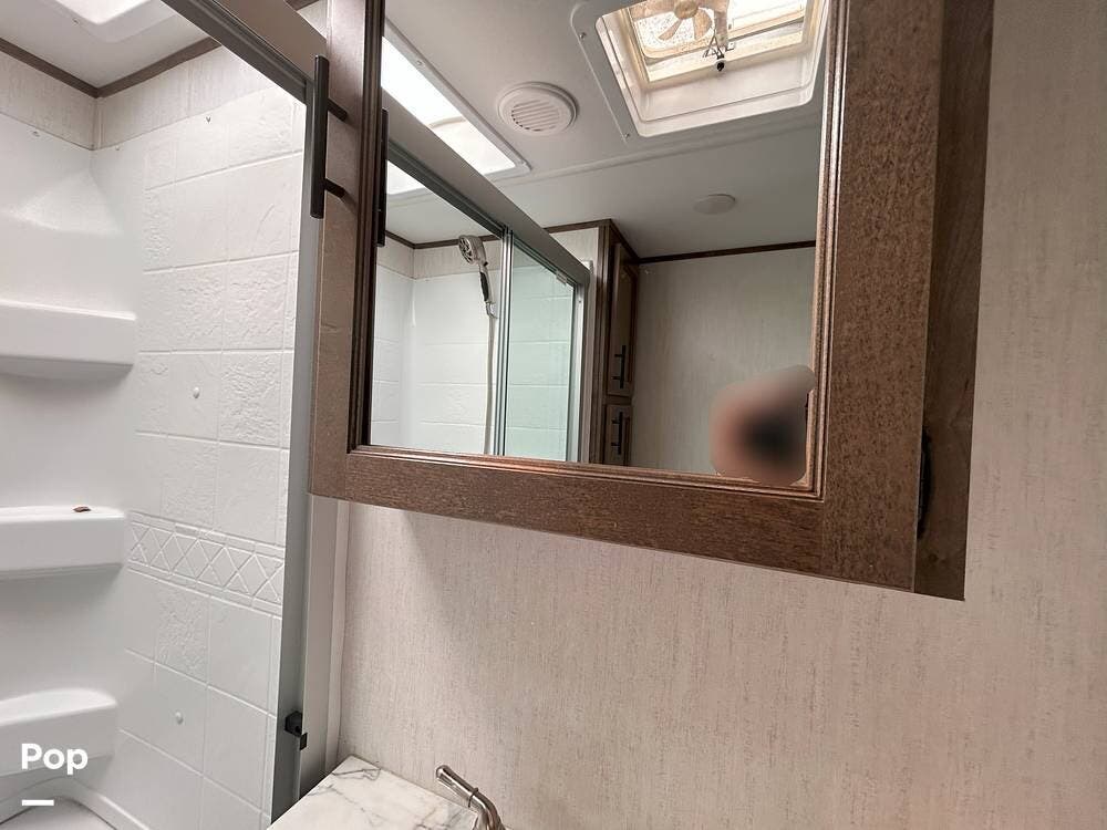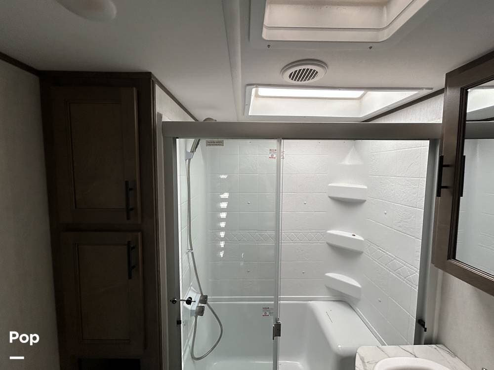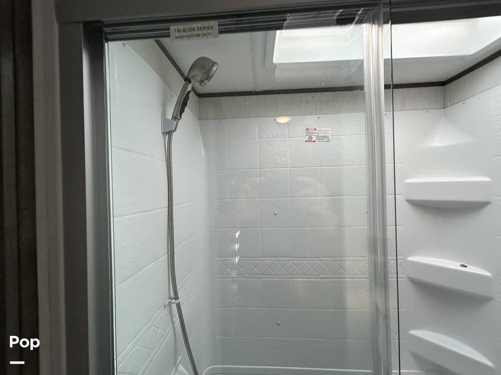 Enjoy residential-style comfort with a spacious shower illuminated by a skylight. The rear great room is the heart of the RV, featuring theatre-style recliners that face an entertainment center with a fireplace and TV. The large rear sofa easily converts into an additional sleeping area when needed.