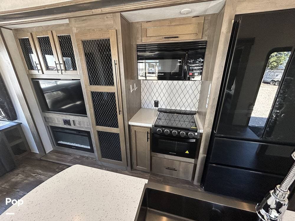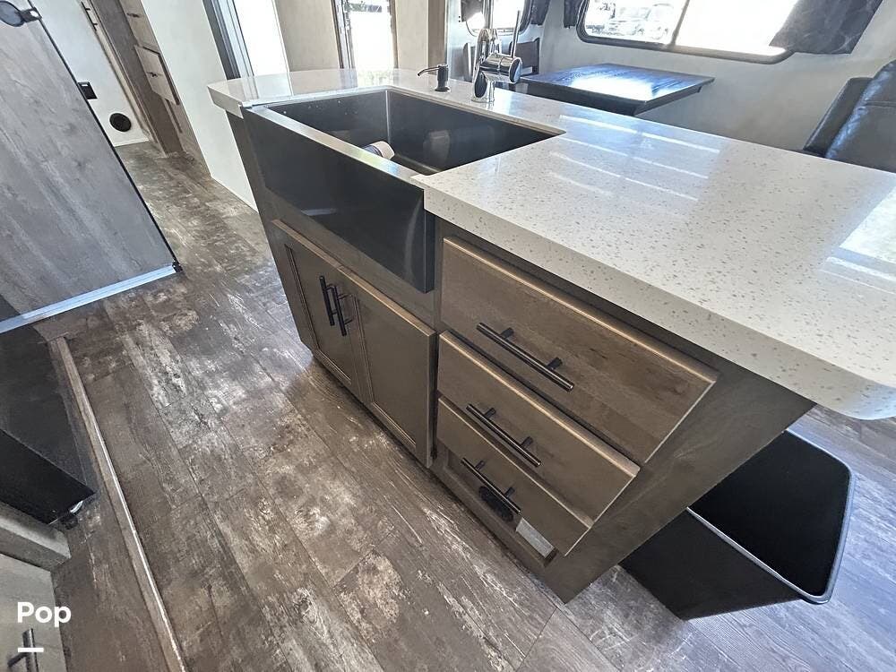 The gourmet kitchen is a standout feature, complete with a large island featuring a farm-style sink, a stylish backsplash, a residential stove and oven, a full-size refrigerator, and a generous pantry. This unit also includes the ever-popular dinette and chairs configuration, surrounded by beautifully crafted cabinetry that adds warmth and charm.