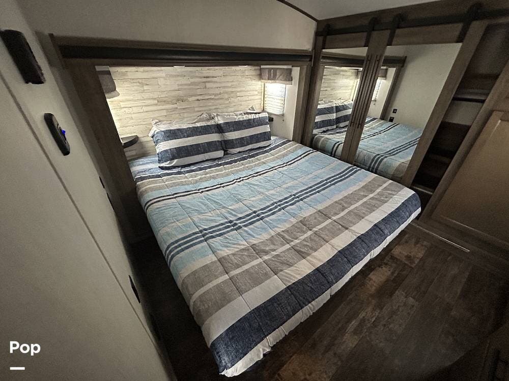 Inside, you'll find sleeping accommodations for up to eight people. The private king bedroom offers a restful retreat, while the second bedroom can comfortably sleep four. There's also a cozy loft space, ideal for extra guests or additional storage, and a rear sleeper sofa for even more flexibility.