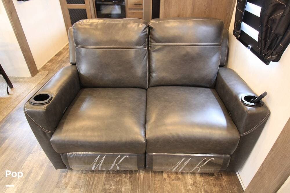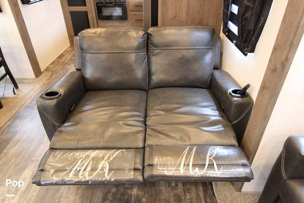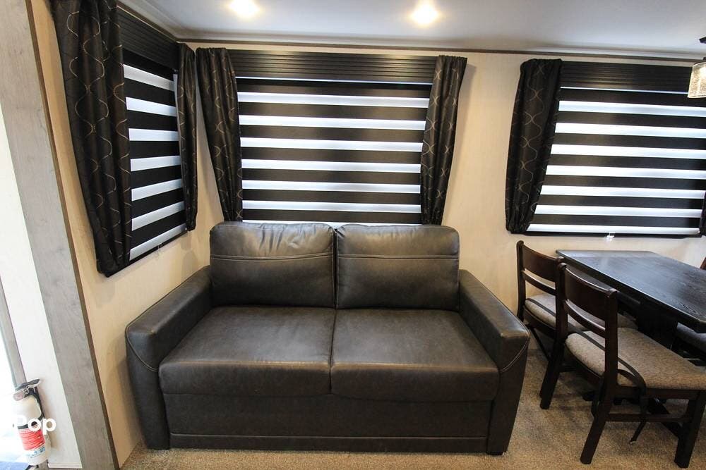 The living room features two fold-out sofas AND a set of stadium-style recliners! There is also a half bath right off the living room, just inside the entry door, for convenience when enjoying the camper under the large patio awning!