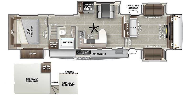 One of the highlights of the floor plan is the double loft above the rear bedroom and bathroom. A separate set of stairs leads to a loft with a look-over railing on the left, and a large loft with storage on the right. Plenty of room to sleep additional guests or for storage.