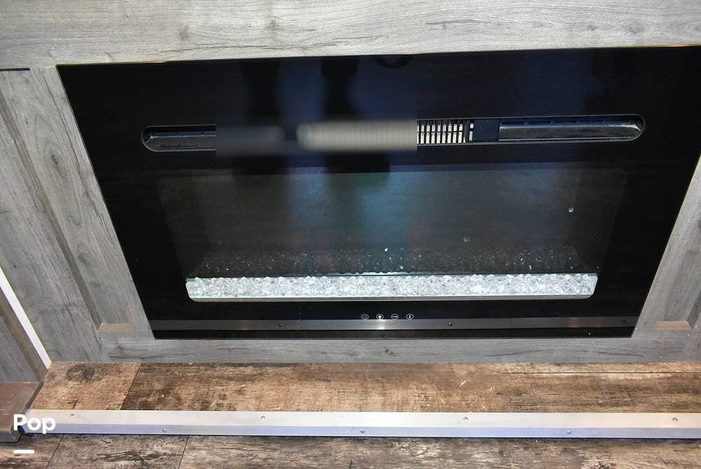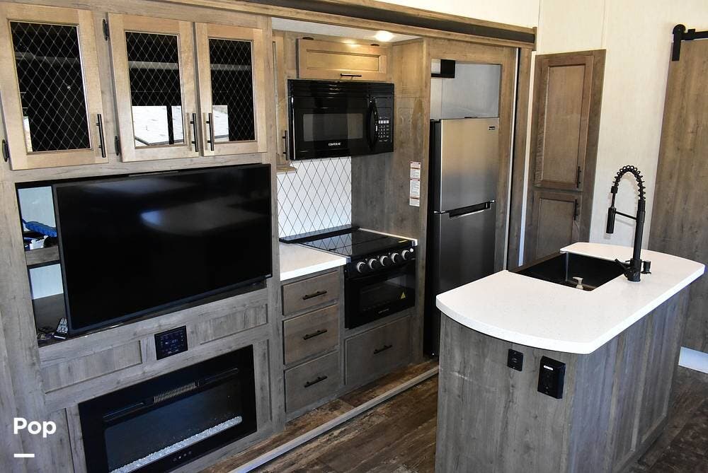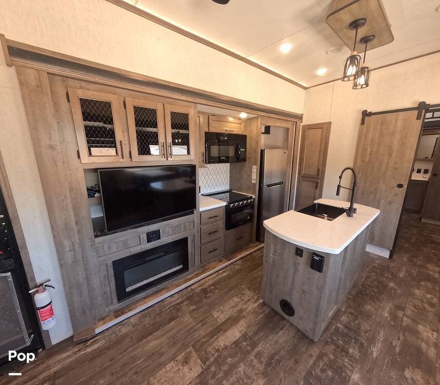 The modern kitchen has residential appliances, a large pantry, and a kitchen island. The living area offers theater seating, an electric fireplace, and a large TV for cozy nights in.