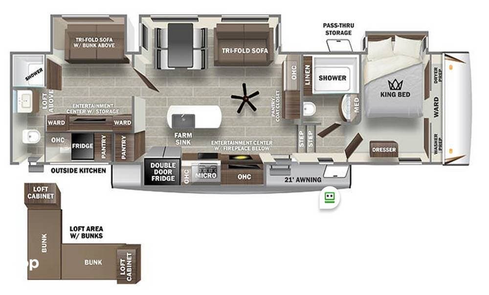 The rear bunkroom includes a full bath and private entry, perfect for kids or visitors. The Sofa Bed, with Bunk above, and two bunks up, provides plenty of storage for all your needs on the road.