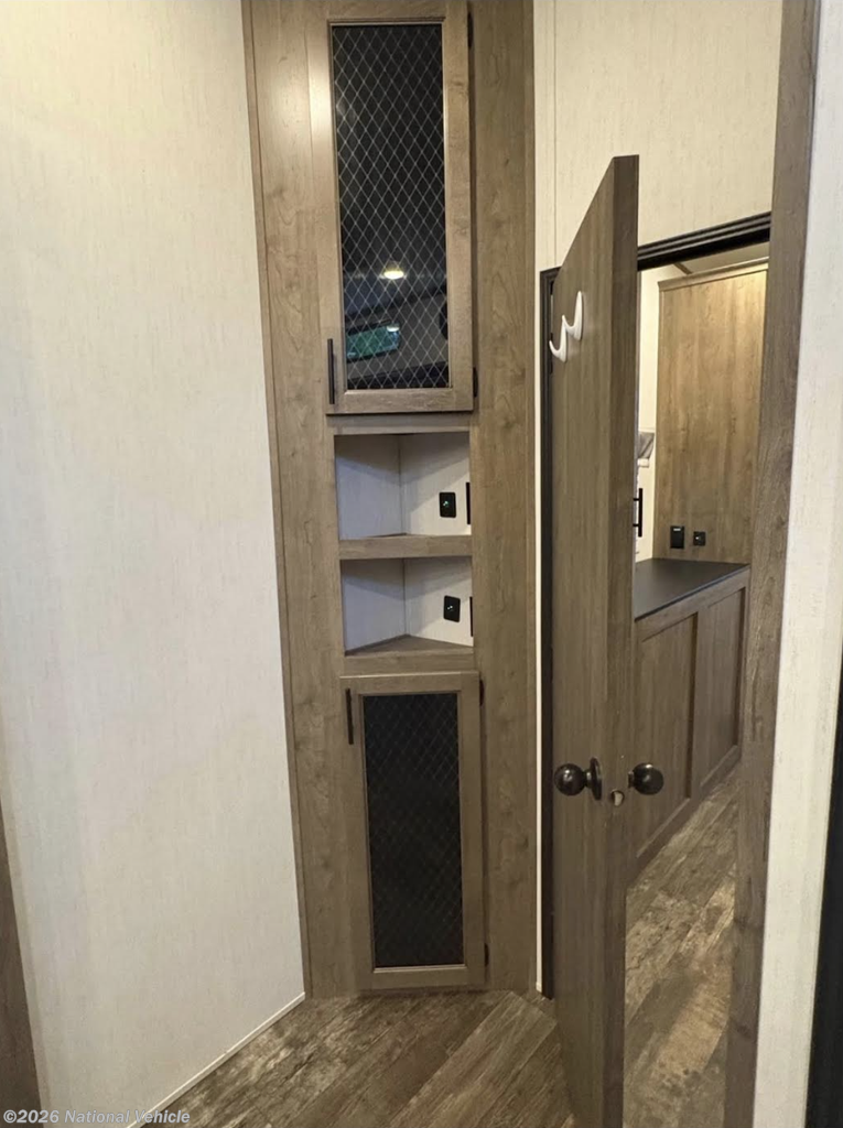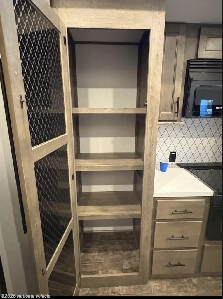 This Sabre fifth wheel with a full and half bath is sure to be a crowd pleaser! The front living area is the perfect place for everyone to visit each other comfortably on the two tri-fold sofas that can be transformed into extra sleeping spaces, or at the theater seating for complete relaxation. You will also find an entertainment center with a fireplace and a residential-size LED TV. This Sabre kitchen is packed out with convenient features, such as a residential refrigerator, a kitchen island, and a lighted pantry with motion sensors. The rear master suite has access to its very own full bathroom with a double-sink vanity for two to get ready at once and a wardrobe that is prepped for the optional washer and dryer to be added so that you can extend your vacation even longer with clean clothes!