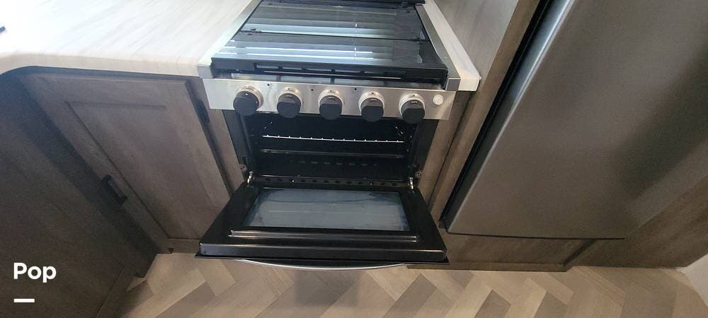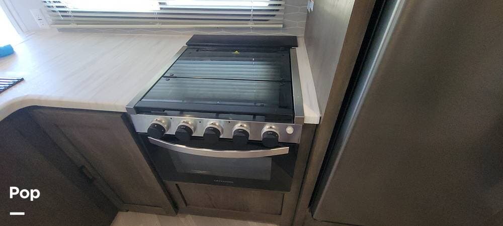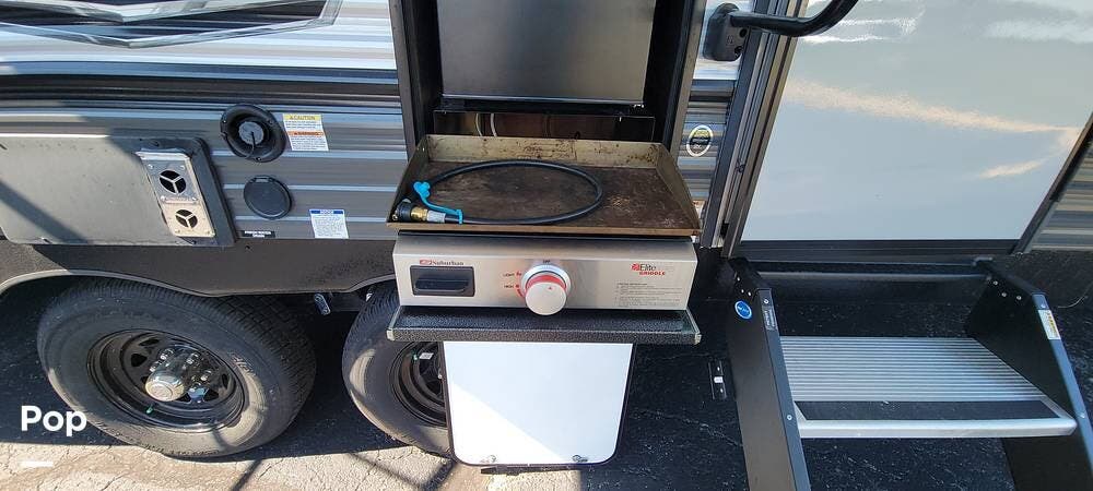 The RV features an outside griddle and refrigerator for outdoor cooking and entertainment, making it easy to enjoy meals while soaking up the great outdoors.
