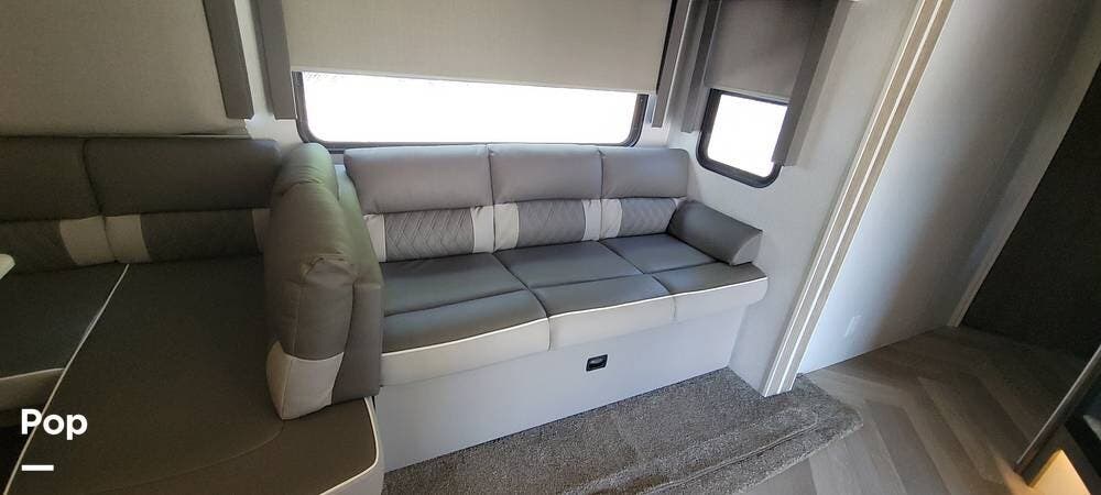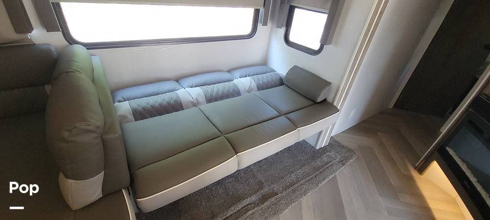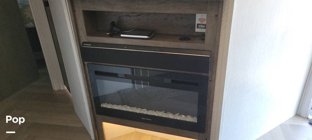 The full kitchen has a large pantry, offering ample storage space for all your cooking essentials. The customized dinette and couch can be easily configured to your liking, allowing you to create a cozy and functional living space. The fireplace adds a touch of luxury and warmth to the RV, creating the perfect ambiance for relaxation.