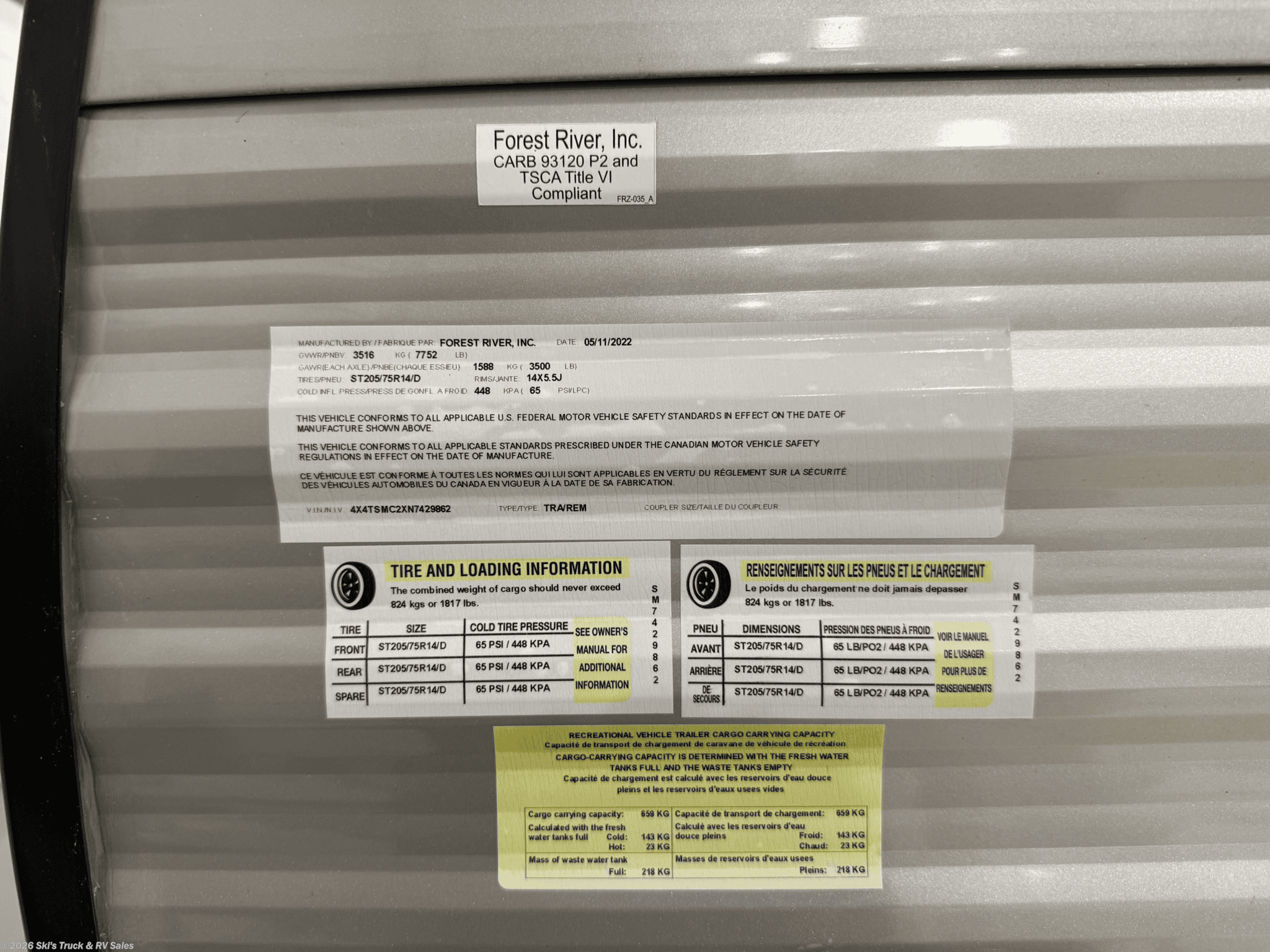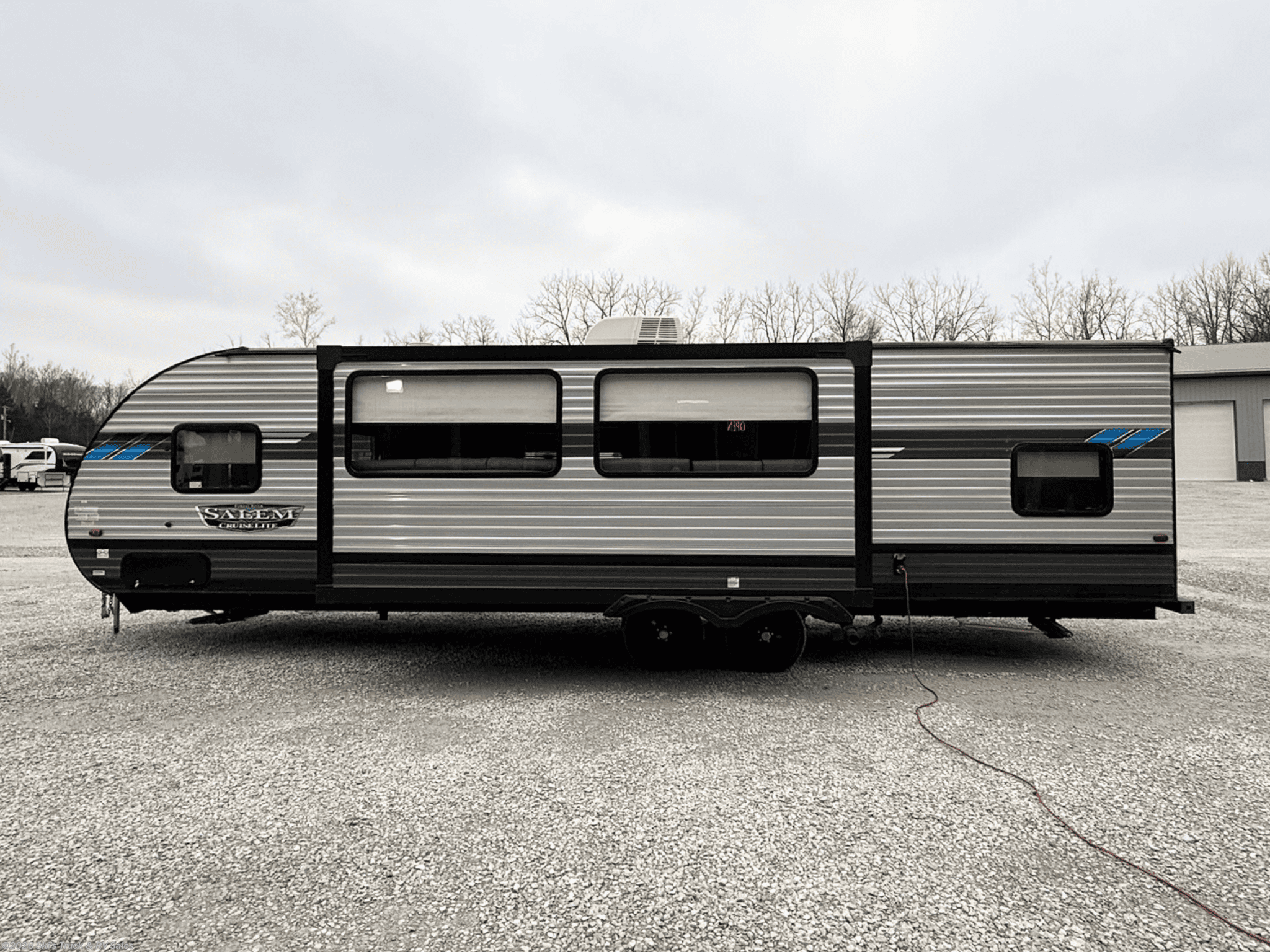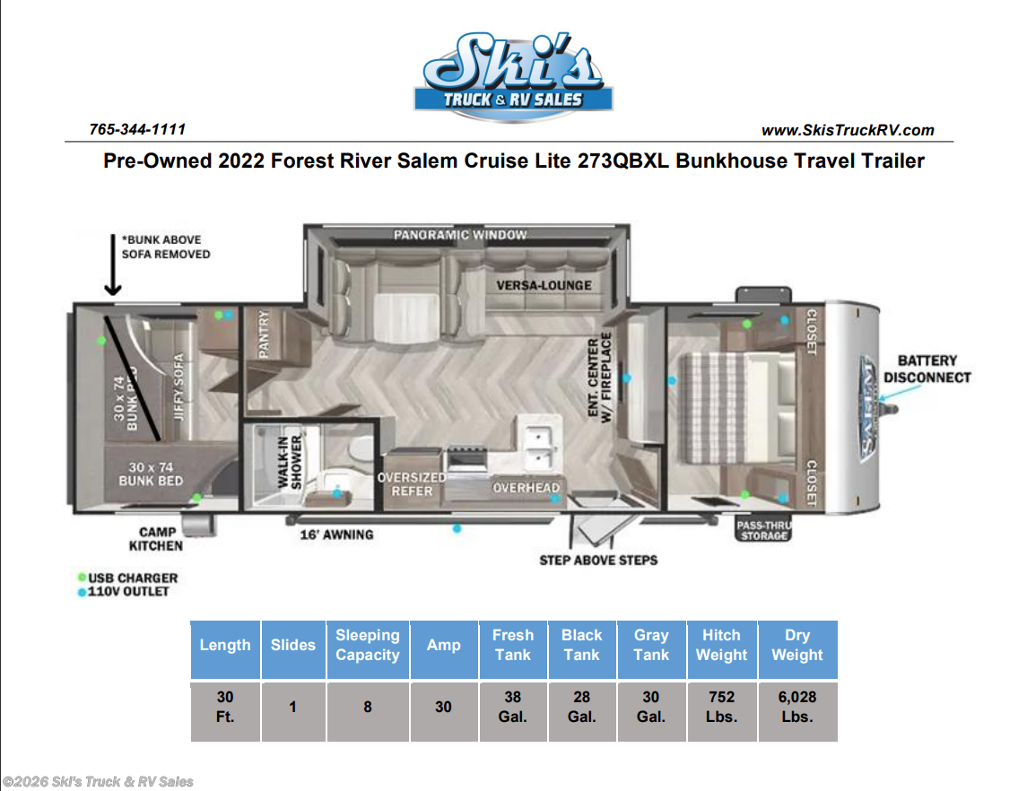 Pre-Owned 2022 Forest River Salem Cruise Lite 273QBXL Bunkhouse Travel Trailer; 30 Foot; 1 Slide; Sleeps 8; Hitch Weight: 752 Lbs.; Dry Weight: 6028 Lbs.; 30 Amp; Power Tongue Jacks; Manual Stabilizer Jacks; 38 Gal. Fresh Water Cap.; 28 Gal. Black Water Cap.; 30 Gal. Gray Water Cap.; Two 20 Lbs. Propane Tanks; 13,500 BTU AC; 30,000 BTU Furnace; 10 C. F. (12V) Refrigerator; 6 Gal. Gas/Elec. Water Heater; Microwave; 3-Burner Stove/Oven; Two TV Jacks; AM/FM; Speakers; One Fireplace; Pantry; U Shaped Dinette; Two Jack-knife Sofas; Queen Bed; Two Single Bunks (One Single Bunk Above Sofa Removed); One Bathroom with Shower; 16 Foot Power Awning with LED Lights; Backup Camera Prep.; Outside Kitchen; Exterior Storage; Foldup Steps; Grab Handle; Roof Ladder Prep.; Magnetic Door Holders; Spare Tire; Few Dings in Exterior; Plastic Plugs Installed to Cover Holes from Camera System (Trailer was a Mobile Office) (**Price Reflects These Issues**); Financing Available; Good Price for a Bunkhouse Travel Trailer in Fair Condition: $15,995. Call Skis Truck & RV Sales at 765-344-1111 or visit us at for more information.