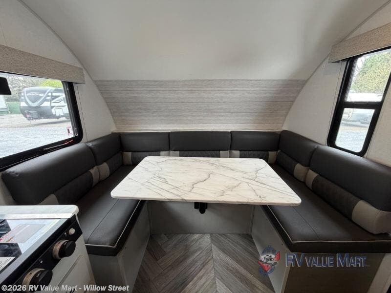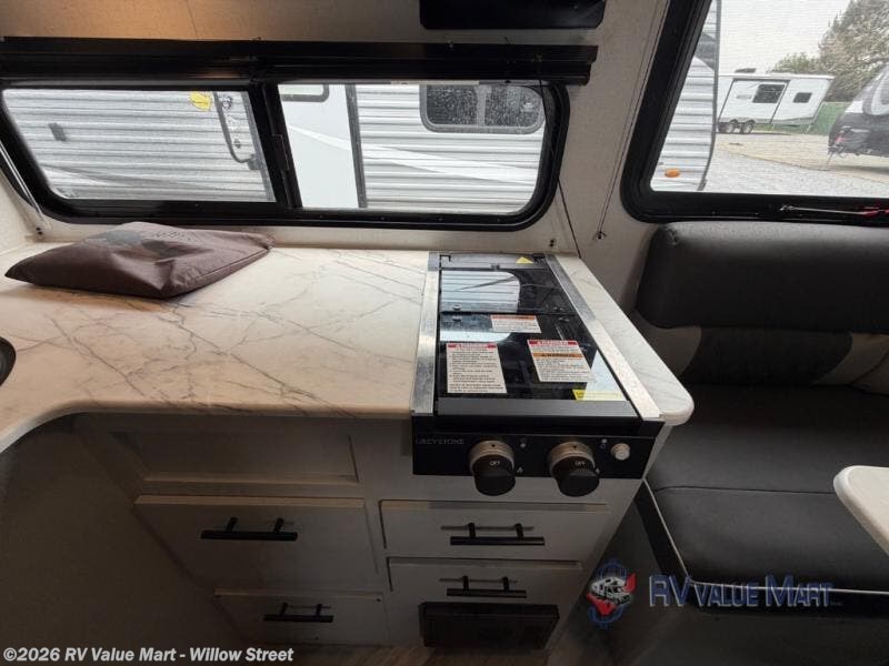 This travel trailer is perfect for couples who want to explore the great outdoors together! There is a rear private bedroom with a queen bed slide for more walking around space, a dresser with a TV location, and wardrobes on either side of it. Plus, it enters right into the separated bathroom which will come in handy when one person wants to freshen up in the 36" x 24" shower while another uses the private toilet and sink. You can prepare your best home cooked meals with the two burner cooktop then enjoy it at the front U-shaped dinette which can also transform into an extra sleeping space. Enjoy making pancakes on the outdoor LP Griddle under the 15' power awning!