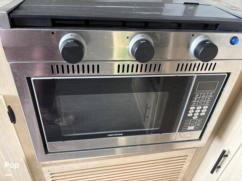 The kitchen area features a double sink, three-burner stove, 12V fridge and freezer, and a convection microwave.
