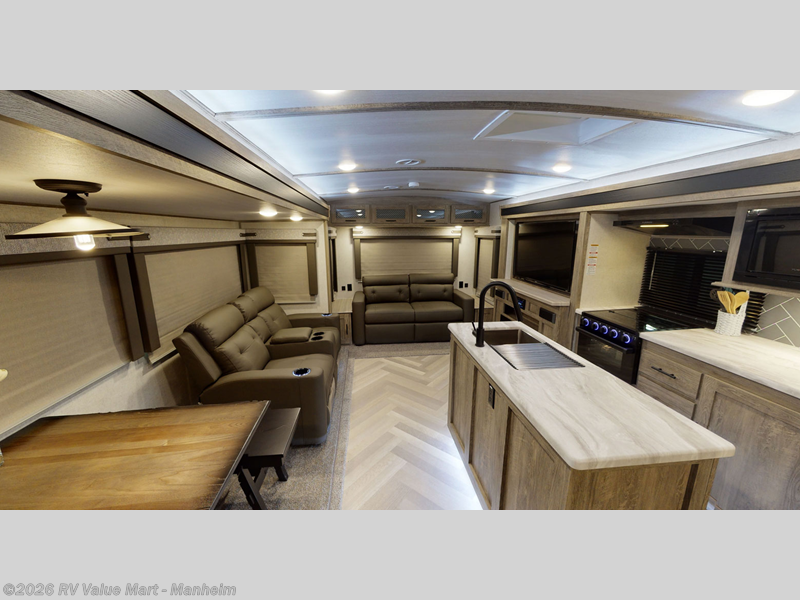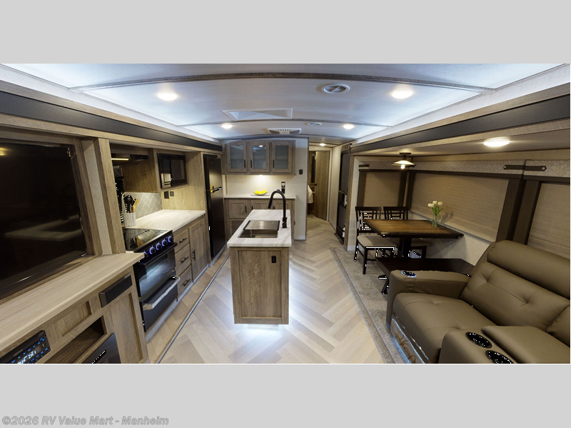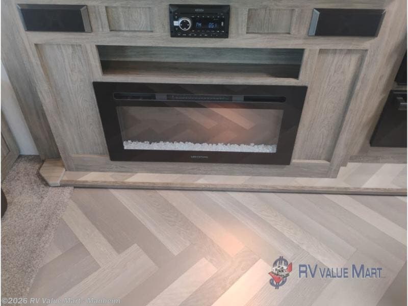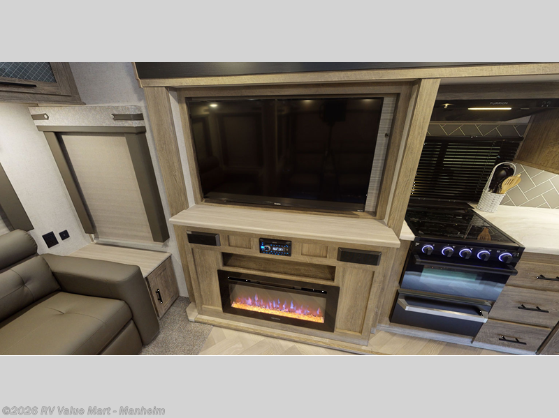Step inside this luxurious travel trailer and see all that it has to offer! You will enjoy a good night's rest each night on the queen bed with wardrobes on either side to keep your hanging clothes wrinkle free, and if you have a couple of guests then you can convert the rear tri-fold sofa or the booth dinette into a sleeping space. The 30" x 36" walk-in shower with a skylight above invites you to take a hot, steamy shower after a fun-filled day outdoors. Once you're cleaned up, you can grab some leftovers from the 10.7 cu. ft. residential refrigerator and warm it up in the microwave then head to the theatre seating and watch your favorite movie on the 50" LED TV with a 32" glass front electric fireplace below!