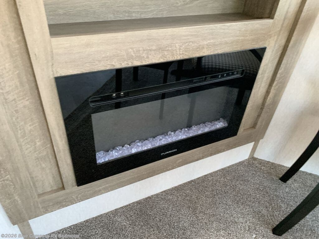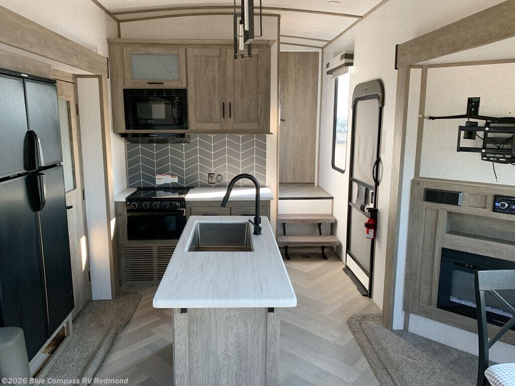 Enjoy the sunshine with panoramic windows throughout this fifth wheel! The rear living area is perfect for relaxing in at night on one of the two chairs or the tri-fold sofa. There is also a free standing dinette, a 50" LED TV, and a fireplace to make this area feel more like home. The kitchen has an island with a large sink to make clean up easier and a pantry big enough to store everyone's favorite snacks. The full bathroom has a residential walk-in shower with a seat and a skylight above for natural lighting as you get ready. When you're ready to hit the sack, head to the front private bedroom and enjoy a good night's rest on the custom king bed!