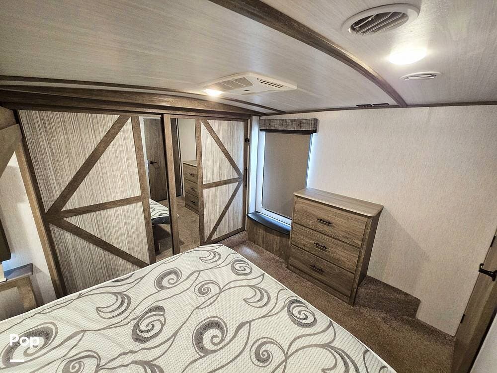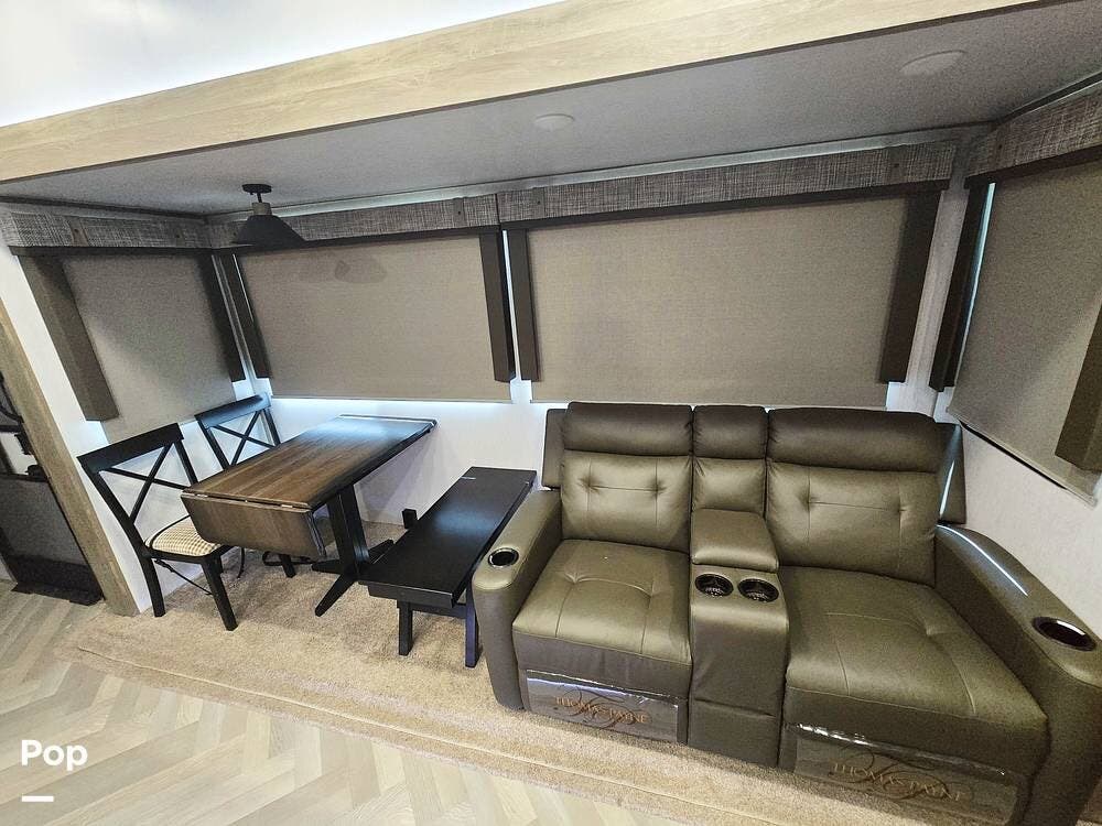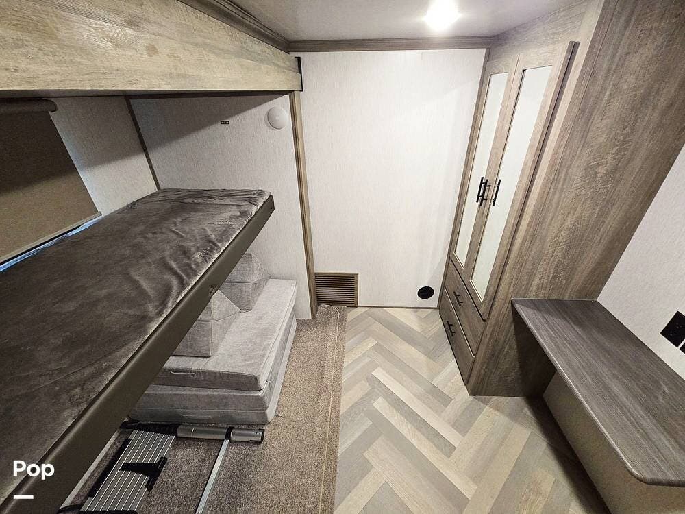 Step inside this 2022 Salem Hemisphere 369BL and you'll immediately notice the unique floorplan designed for space and flexibility. Just inside the entry is the secondary bedroom, which features a convertible queen-size sofa with an overhead bunk, along with a dresser and wardrobe for storage. This versatile room works well as a guest space, bunkroom, or even a private office area.