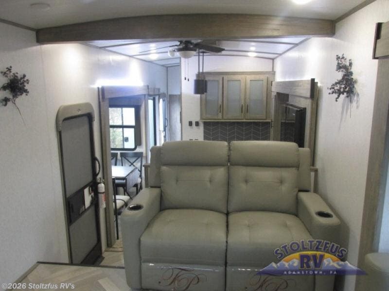 This fifth wheel is decked out in features you're going to love from the front separate living area to the Texas-sized exterior pass-through storage area! The two tri-fold sofas can convert into sleeping space and the reclining sofa is the perfect place to relax while you watch your favorite movie on the 50" LED TV. The kitchen island not only makes meal prepping easy, but cleaning up just as easy with the large sink. Everyone will enjoy getting ready each morning in the full bathroom with the residential walk-in shower and a vanity sink next to it. The rear private bedroom has everything you will need to feel right at home with the custom king bed, the wardrobe that is prepped to add the optional washer and dryer, and the large panoramic window on the rear wall to let in some morning sunlight. Plus, there are stairs just outside the bedroom that lead up to the loft with two mats and storage areas!