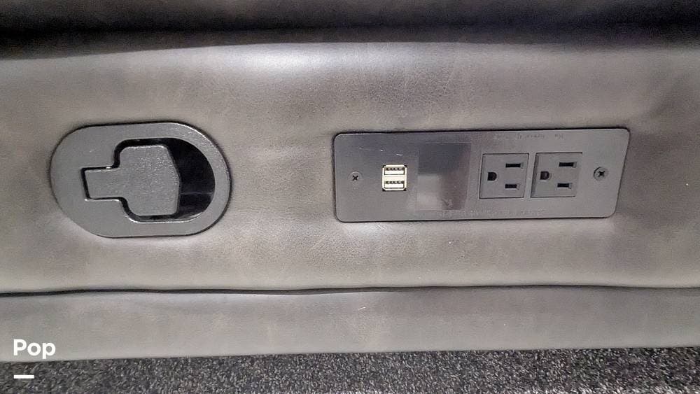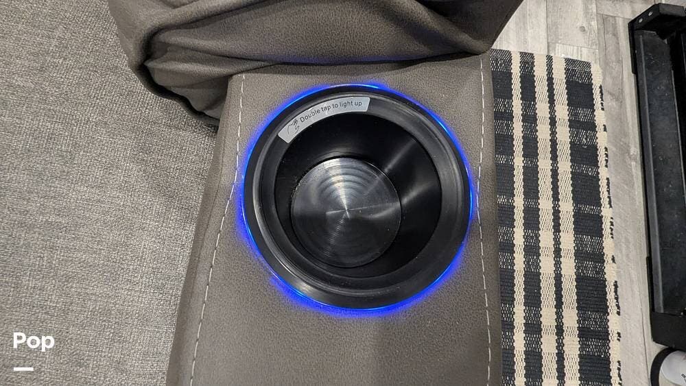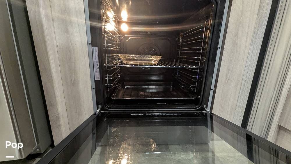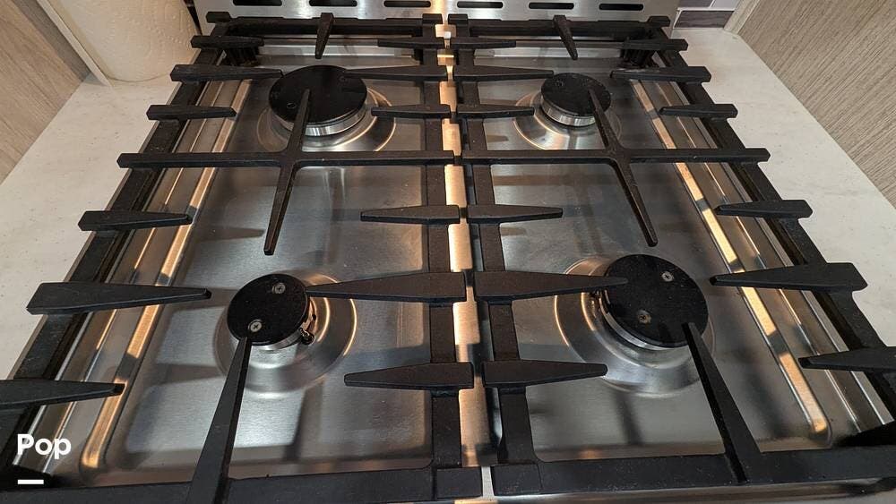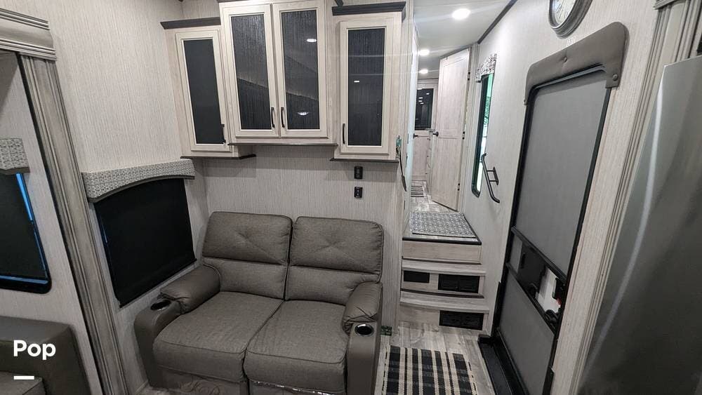 The living room area is very user-friendly and upscale with a trifold sleeper sofa, Thomas Payne Collection theater seating, and the kitchen with a residential full-size refrigerator-freezer that makes it easy to prepare meals on the go.