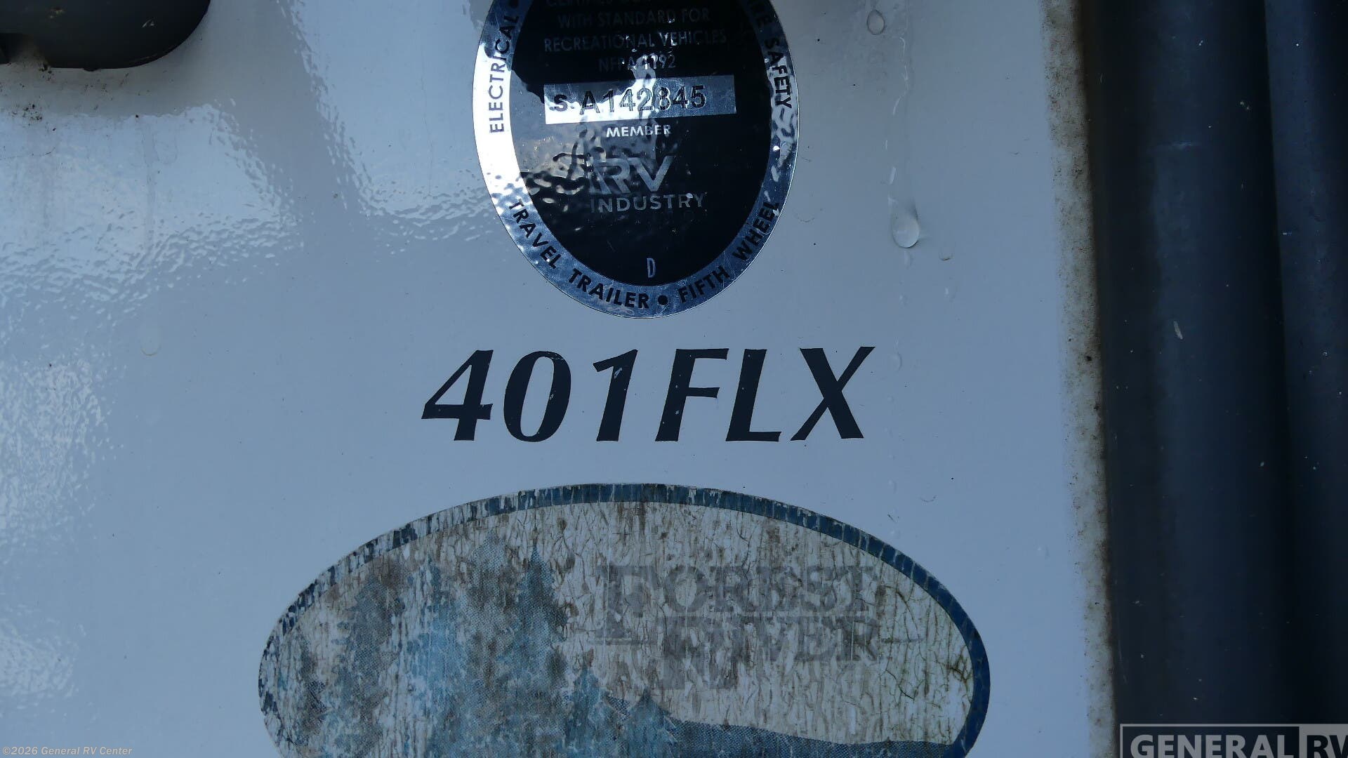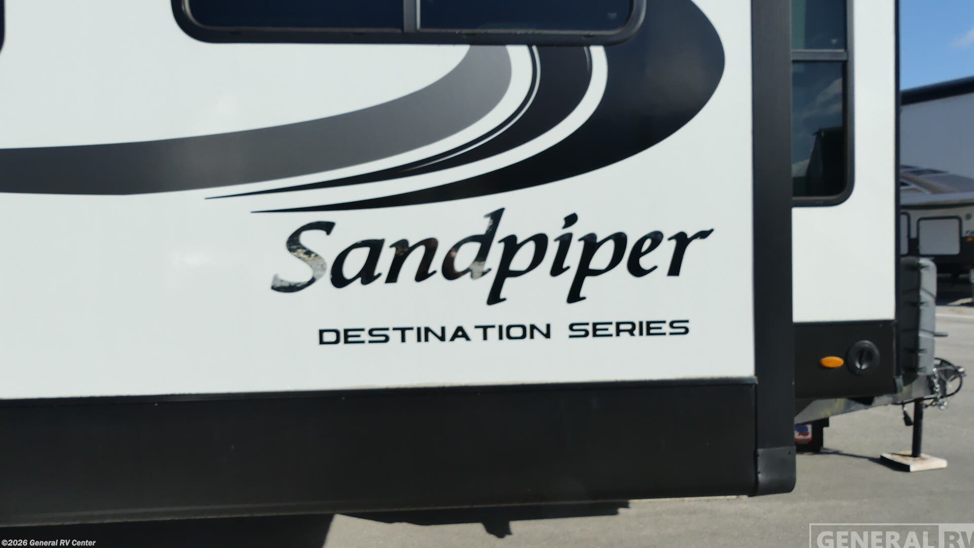**Forest River Sandpiper Destination Trailer 401FLX highlights:** - Tri-Fold Hide-A-Bed Sofa - Shower with a Seat - King Bed Slide Out - Ceiling Fan - Fireplace Wherever you decide to go, go in comfort with this destination trailer. The chef of the group will have everything they need to prepare meals each day; a four burner stainless steel range, a kitchen island, a floor-to-ceiling pantry, plus a 22 cu. ft. stainless steel refrigerator. Your crew can sit back on the theater seating and the tri-fold hide-a-bed, or play a game of cards at the table with four chairs. The full bath includes a walk-in shower, and the rear bedroom is close by for convenience. Here, you can keep your clothes wrinkle-free in the wardrobe, plus there is a closet with washer/dryer prep if you choose to add that option. The Sandpiper Destination Trailers by Forest River are constructed to last through years of use and memories. There is a cambered powder coated frame with rust prohibitor, R-10 sidewall construction, and Underbelly Armor that will allow you to camp year around. There is also an electric awning with LED lights, two exterior speakers, and a 60" dual pane patio door. The interior is packed with comforts, such as residential carpet, recessed LED lighting, handmade cabinetry, and crown molding over the kitchen cabinets to name a few. You will love the look of the stainless steel kitchen package, the designer window treatments, and the rustic plank pattern linoleum. These destination trailers also feature extra large picture windows throughout for open views, a full coach water filtration system, a ducted 15K A/C system, plus many more conveniences to make each destination memorable.
