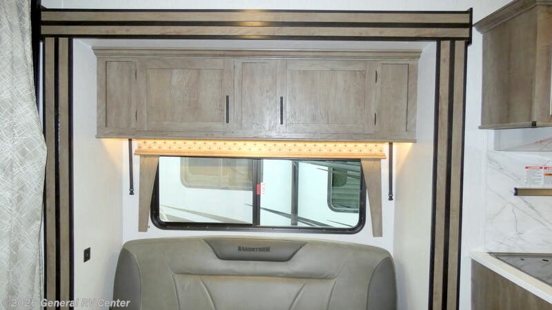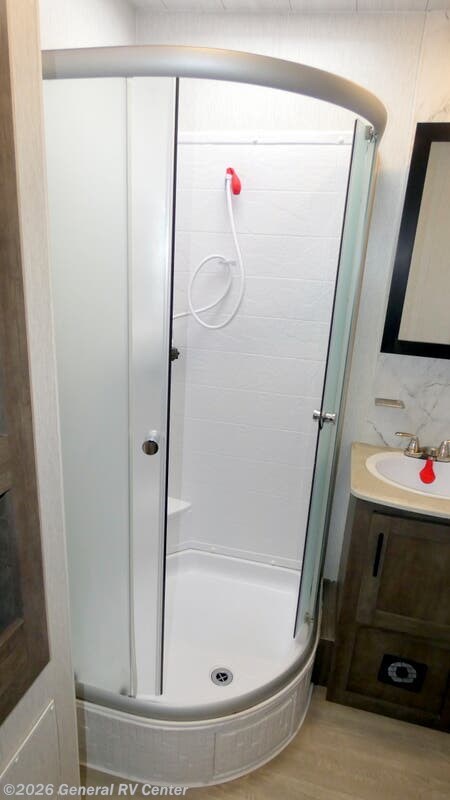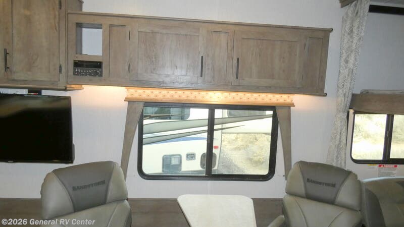 This Sandstorm toy hauler has lots to offer, like the front master suite with a queen-size bed, wardrobes on either side of the bed, and a private entrance into the dual-entry bath. Inside the bathroom, there is a glass radius shower for you to clean the mud off and a skylight above it for added natural lighting. The living area features a set of chairs with a table by the large bay window, plus a sofa slide with a table.. There is also a rear electric bed with an electric pass-through dinette below for your guests! Each Sandstorm toy hauler fifth wheel and travel trailer by Forest River features a 102" wide-body construction to bring along four-wheelers, dirt bikes, or kayaks! You will find convenient amenities, such as 220 watts of solar power and a regulator with power boost, a 35 gallon fuel station, an outside shower to wash off your gear, and more. There is also a power awning with LED lights outdoors to create an outdoor living space, plus heated and enclosed tanks to camp all year long. The interior includes LED accent lighting, black night shades throughout, and a glass shower to name a few comforts. And don't overlook the available options that can added to customize your toy hauler just the way you like it!