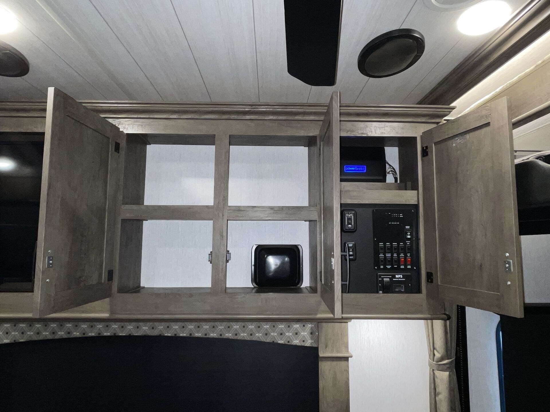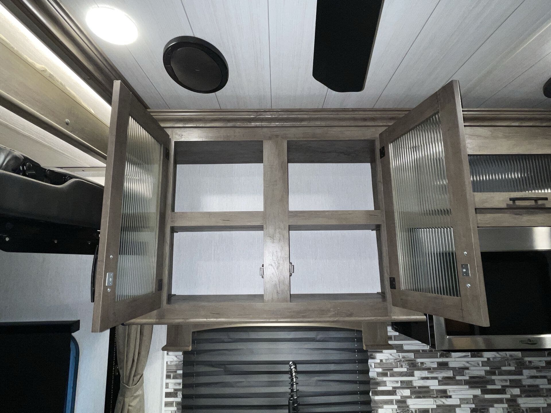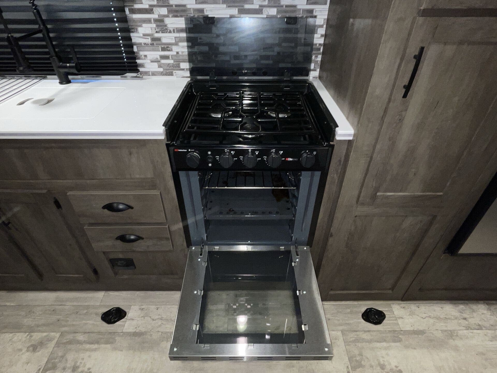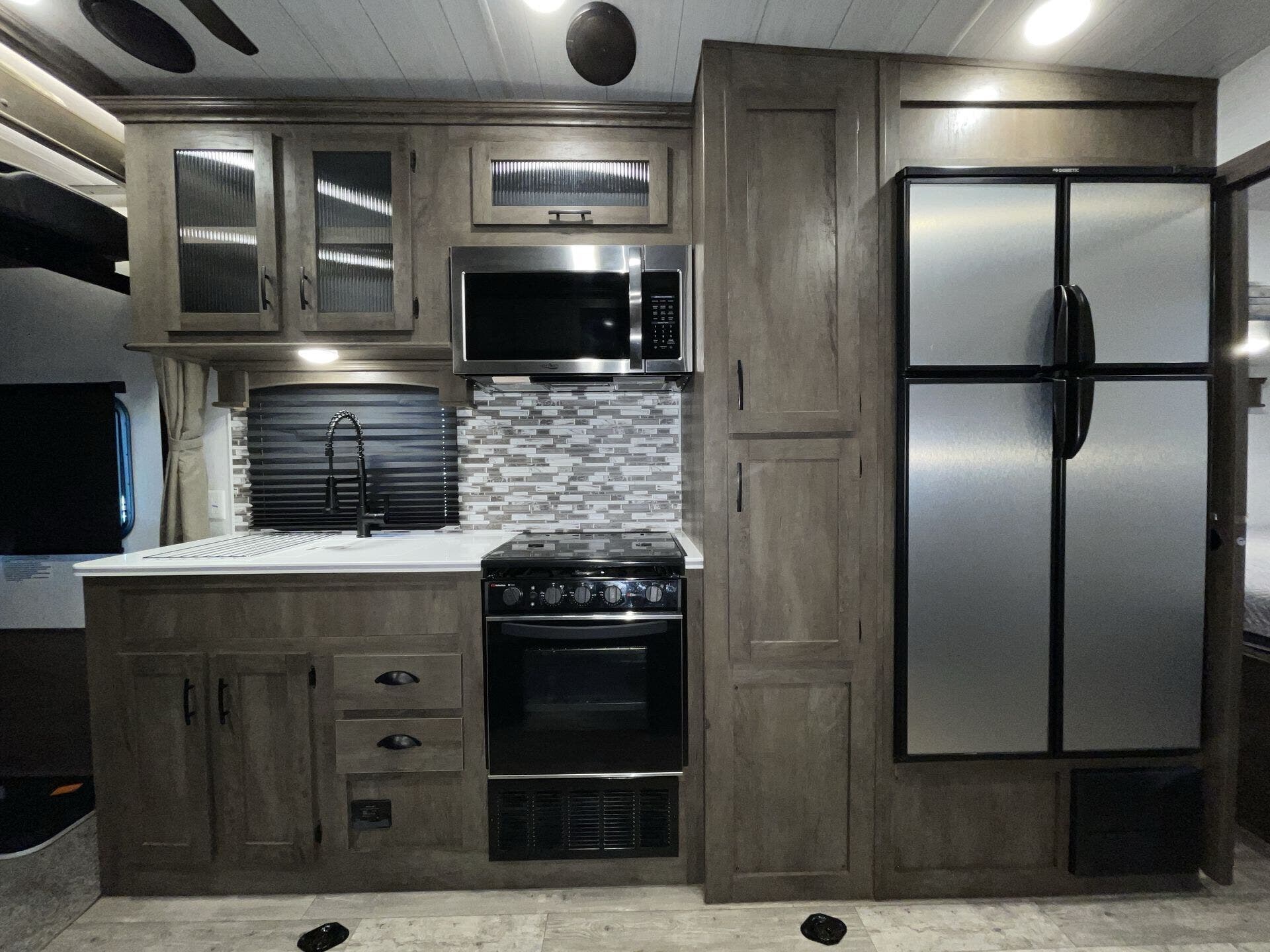 The kitchen has everything you need for everyday cooking — fridge, cooktop, counter space — and the water/tank setup works for weekends or longer trips without constant hookups. The power awning and exterior storage make hanging out at camp easy, and you’ve got spots to stash gear without cluttering up the living space.