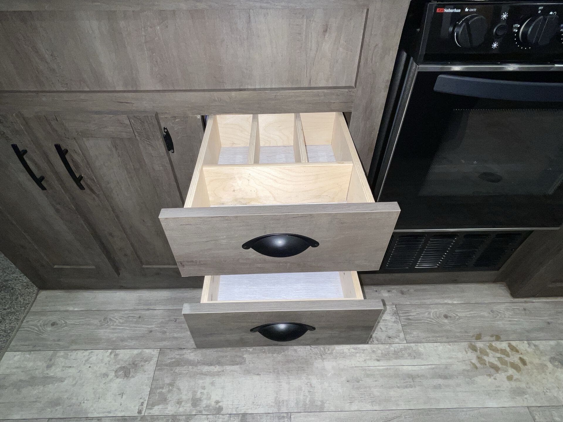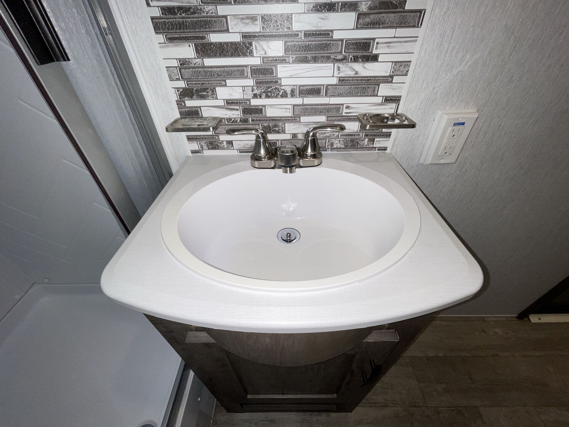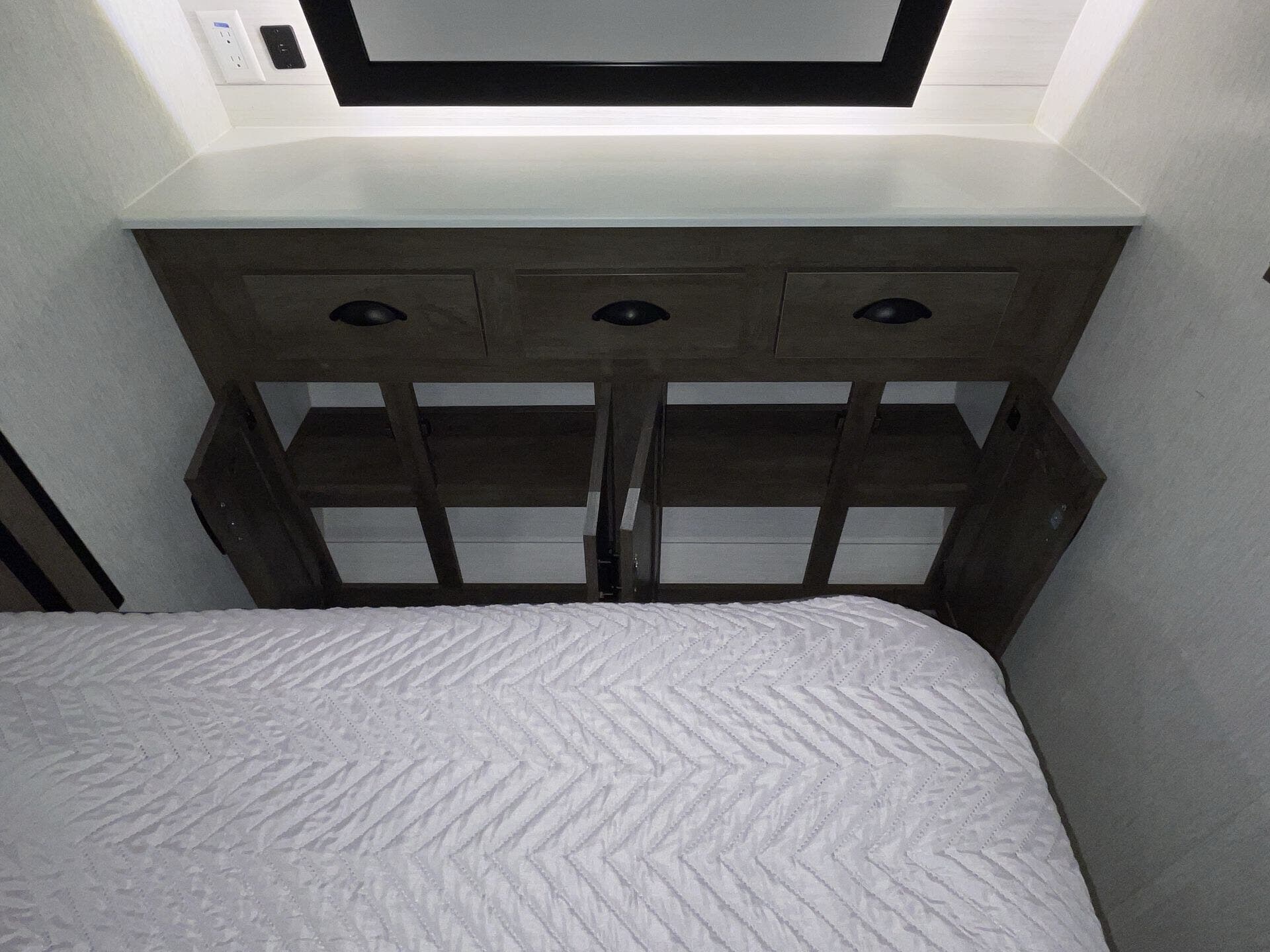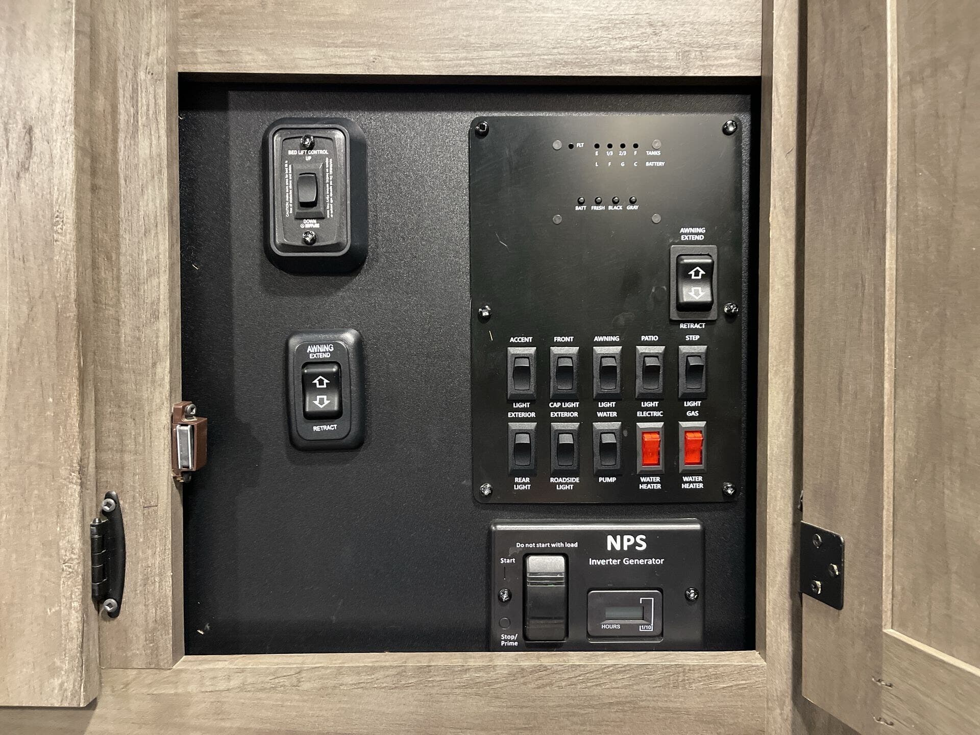 The kitchen has everything you need for everyday cooking — fridge, cooktop, counter space — and the water/tank setup works for weekends or longer trips without constant hookups. The power awning and exterior storage make hanging out at camp easy, and you’ve got spots to stash gear without cluttering up the living space.