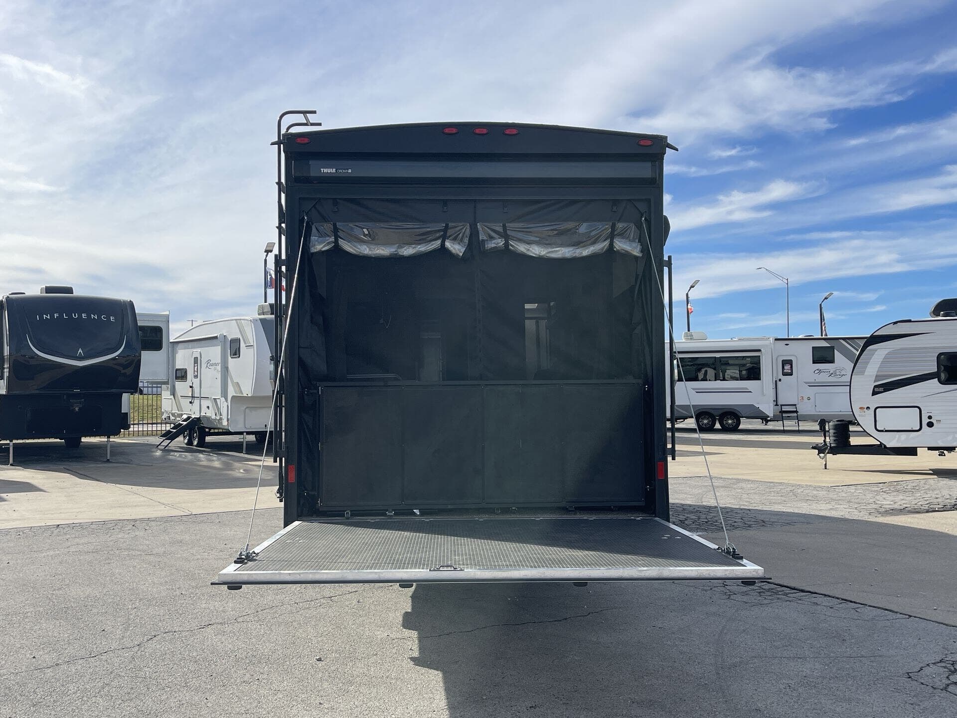 The 16-foot cargo space is big enough for quads, dirt bikes, or whatever gear you’re hauling. Up front you get a private bedroom that doesn’t feel like an afterthought — real sleeping space that’s comfortable and practical.