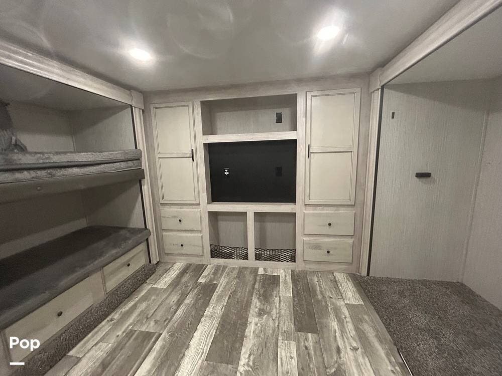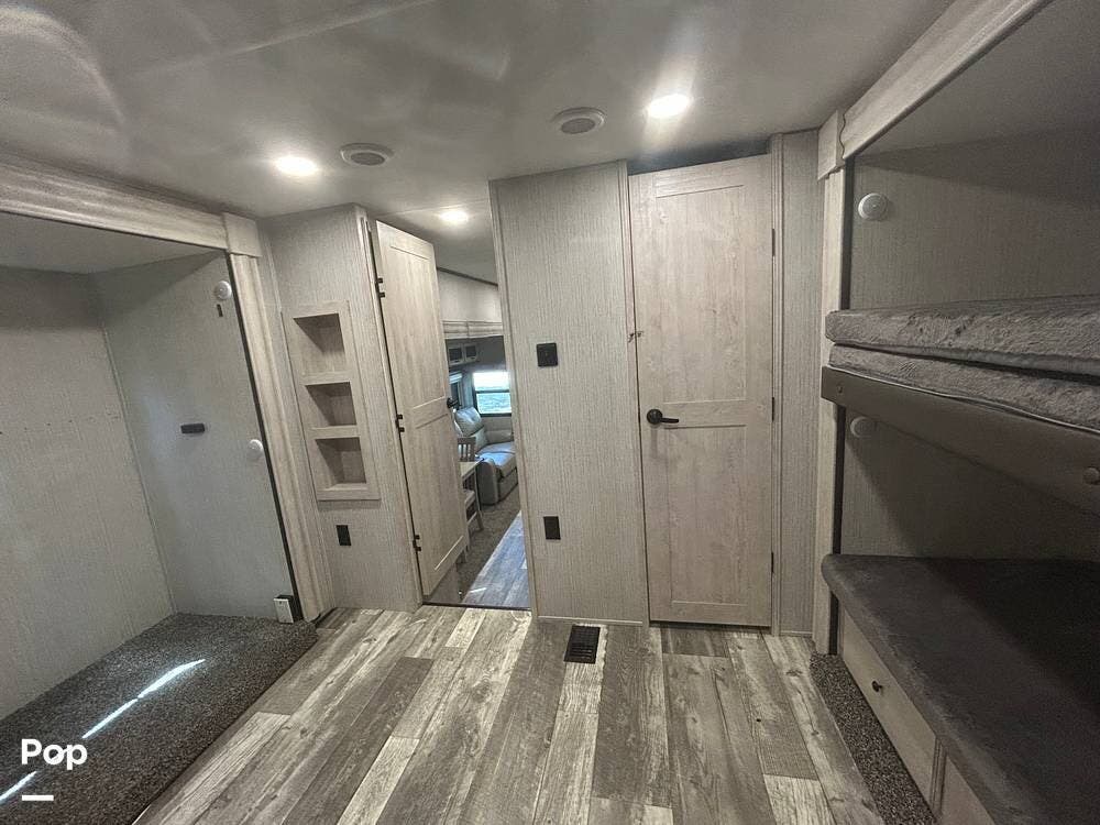 The rear bedroom has bunks, storage, and a half bath.
