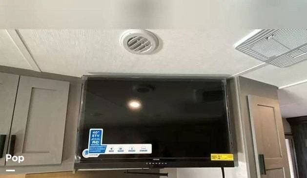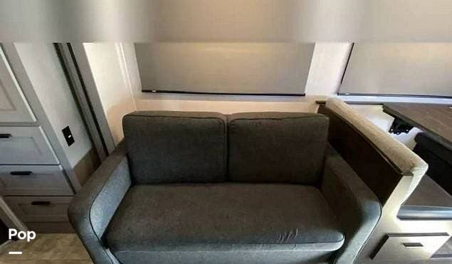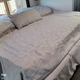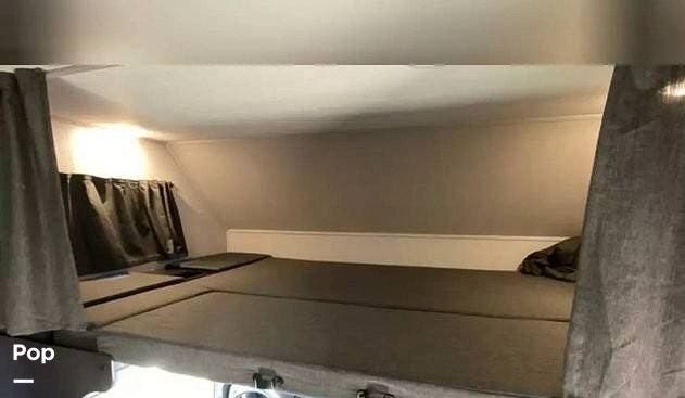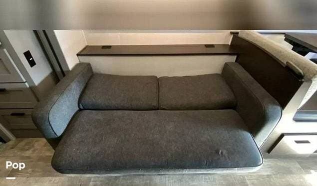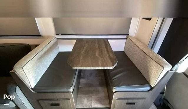 Step inside to find a bright and welcoming interior with a smart floor plan that maximizes living space. The large slide-out expands the living area, providing ample room to relax with family and friends. A booth dinette and sofa offer comfortable seating and convert easily into additional sleeping areas. The cab-over bunk provides extra accommodations, while the private rear bedroom with a queen bed ensures a restful night's sleep after a day of adventure.
