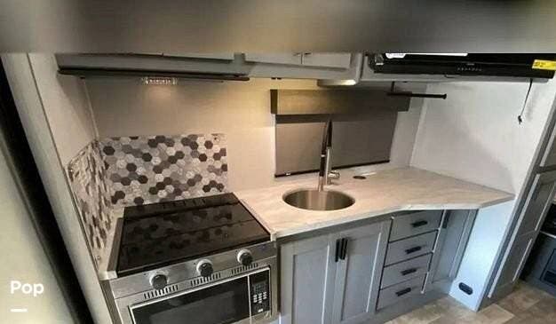 The kitchen is fully equipped with a refrigerator, three-burner range, microwave, and ample storage, making meal prep on the road a breeze.