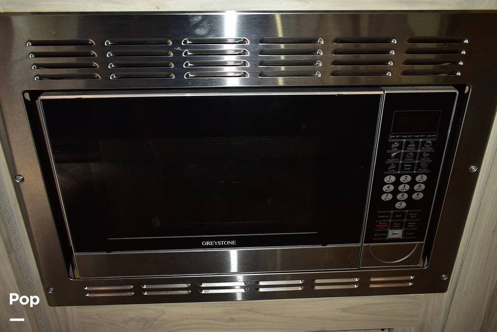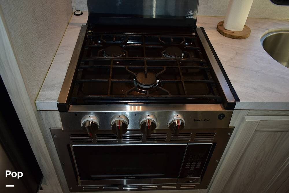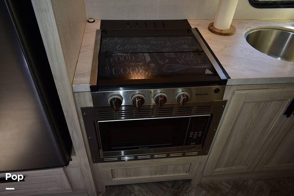 The fully equipped kitchen includes a large refrigerator, microwave, three-burner cooktop with oven, and solid-surface countertops--ideal for cooking on the road.